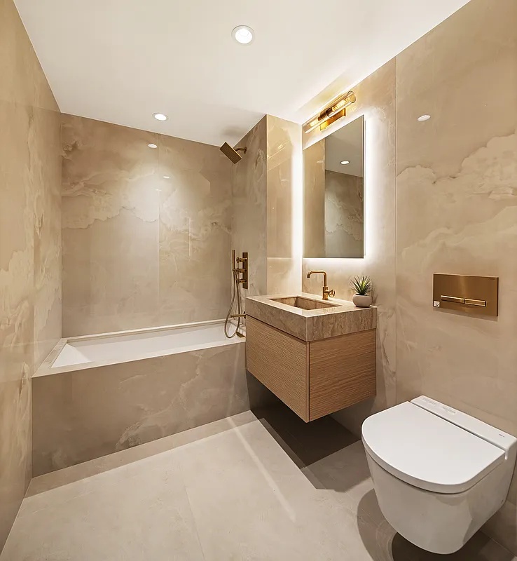 The luxury of the kitchen is mirrored in the serene tranquility of the primary and secondary bathrooms. Stone slabs expanses lay the foundation for elegance, paired with custom oak vanities that speak of meticulous craftsmanship. GRAFF brass fixtures add a touch of warmth, enhancing the sophisticated ambiance. Here, every moment is an invitation to unwind in an oasis of refined comfort of a steam shower or a deep soaking tub. Both primary and second bathrooms filled with imported high-end finishes, including Albarium stone flooring, dimmable backlit mirrors, and smoke glass sconces, are the epitome of luxury.