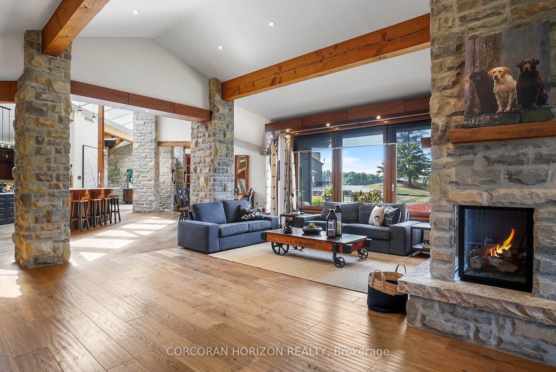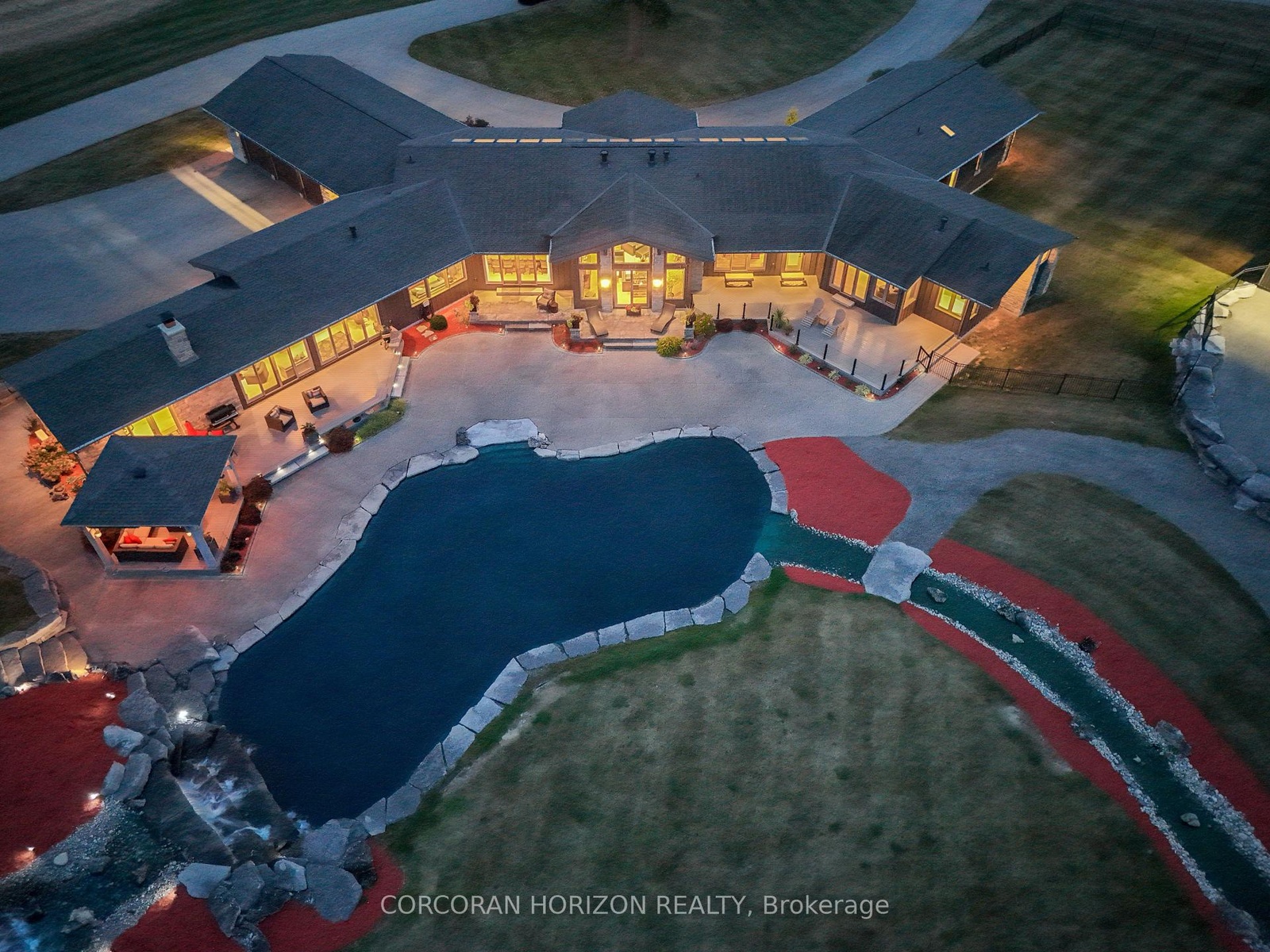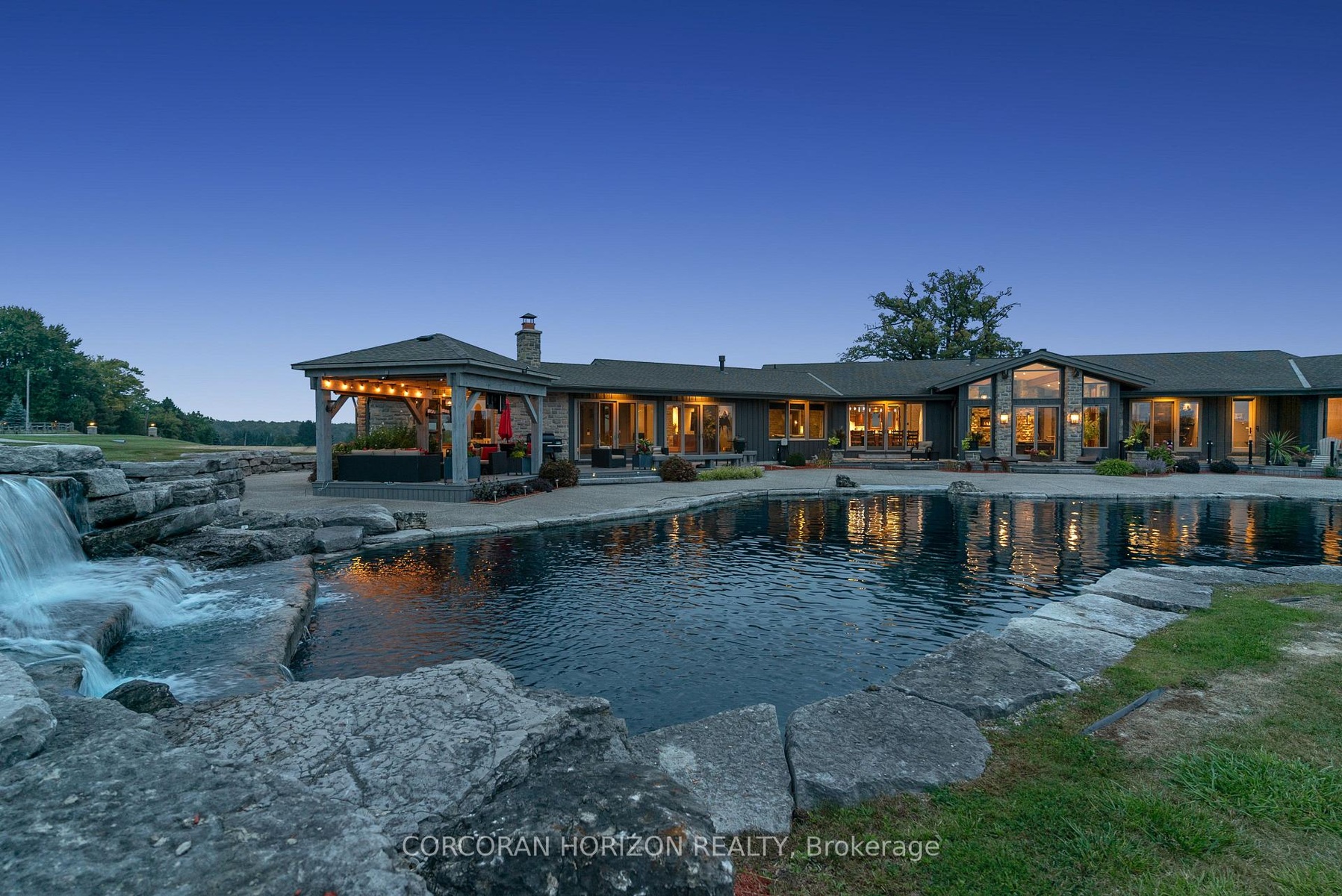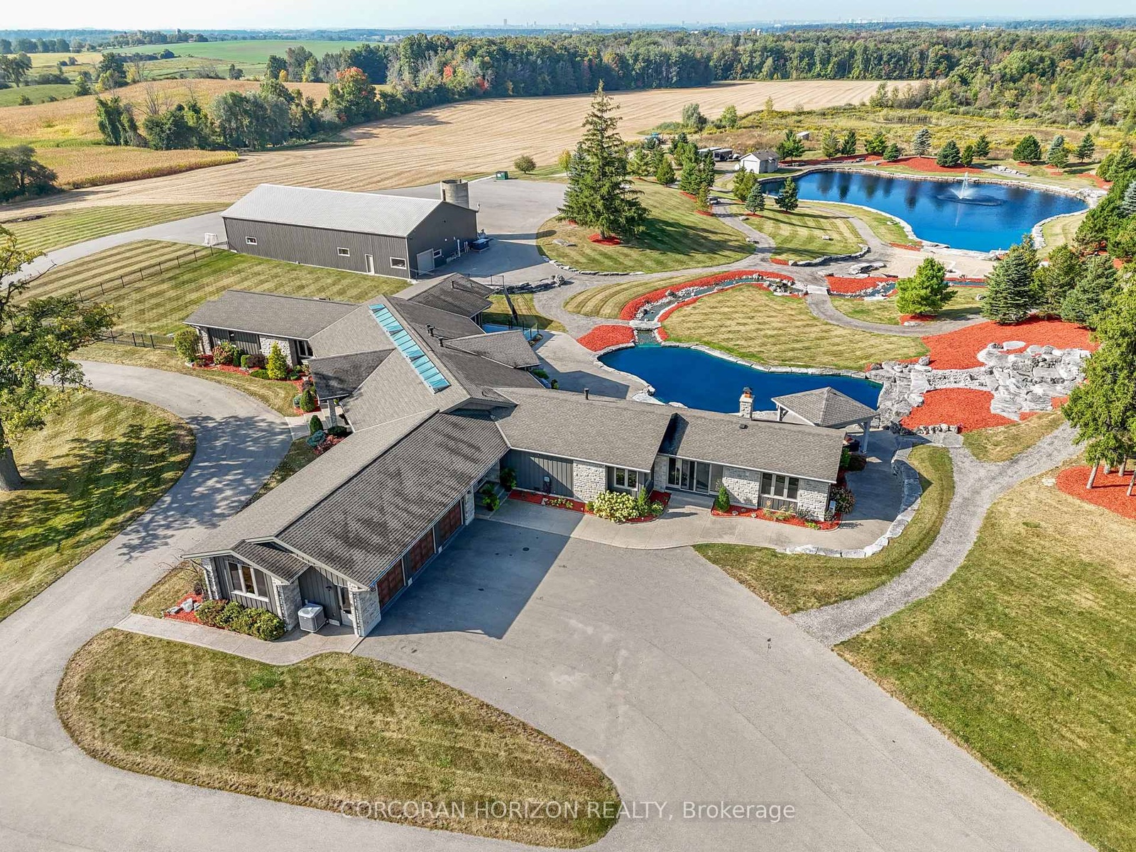 Set on over 120 acres of stunning countryside, this exceptional estate offers a rare combination of privacy, recreation, and luxury living, just minutes from Cambridge, Guelph, and Kitchener-Waterloo. The property is designed for year-round enjoyment, featuring two incredible ponds -one a swim pond perfect for cooling off on warm summer days, and the other a stocked fishing pond with a sandy beach and waterfall, creating a truly resort-like setting at home. Scenic trails wind throughout the property, offering endless opportunities to explore, relax, and enjoy the peaceful natural surroundings. The property also includes a heated 4,000 sq. ft. detached building with in-floor heating, offering incredible versatility for a workshop, car collection, equipment storage, hobby space, or recreational use. The custom-built stone bungalow offers an impressive 10,454 sq. ft. of finished living space, including 6,505 sq. ft. on the main floor and a fully finished 3,949 sq. ft. lower level. Inside, soaring ceilings, skylights, and hand-chipped stone accents create a warm and inviting atmosphere, while natural wood details add character throughout. At the heart of the home is a spectacular gourmet kitchen featuring Viking Professional appliances, Silestone quartz countertops, striking Douglas fir beams, and dual islands designed for gathering and entertaining. The spacious dining area seats 14 and overlooks the picturesque ponds and surrounding landscape. An indoor grilling area with heated floors makes entertaining effortless in every season. The primary suite is a private retreat with direct access to the swim pond and a spa-like ensuite complete with a jacuzzi tub beside a cozy gas fireplace. The fully finished lower level is designed for relaxation and entertaining, offering a spacious recreation area, full bar, billiards space, wine cellar, and a private cinema room. A truly one-of-a-kind property where luxury living meets the beauty of nature.