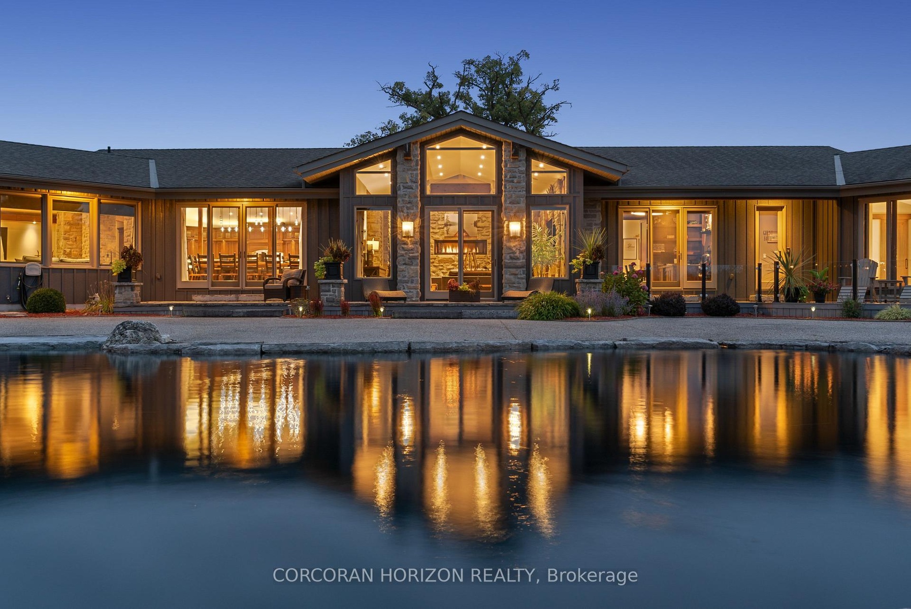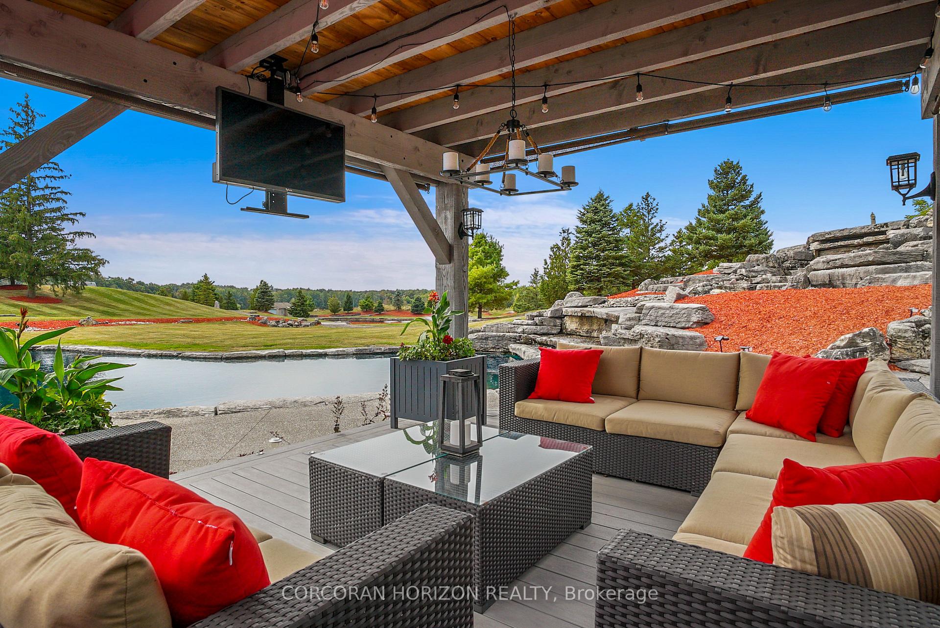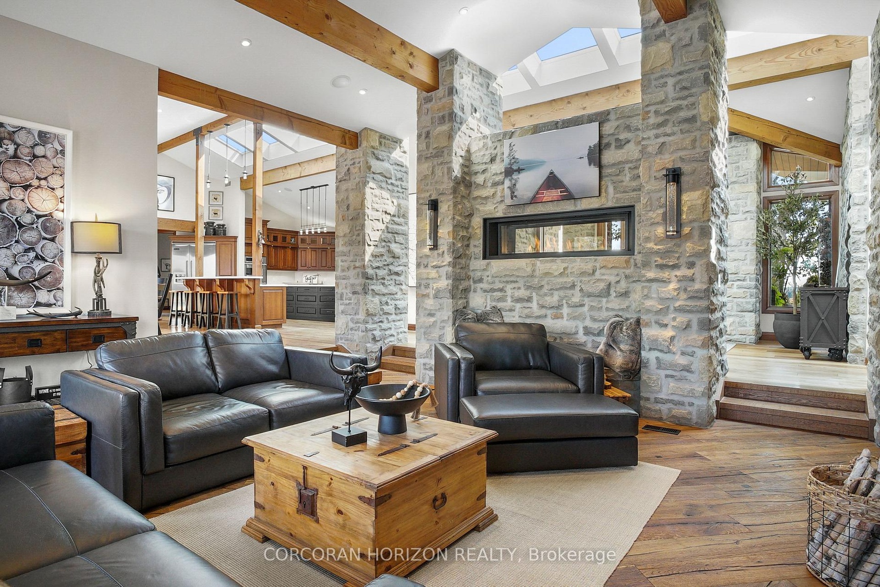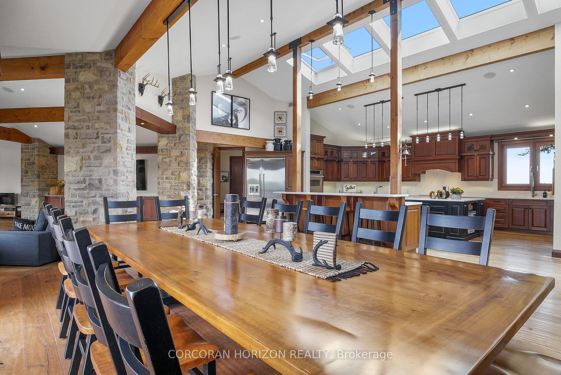 Set on over 120 acres of stunning countryside, this exceptional estate offers a rare combination of privacy, recreation, and luxury living, just minutes from Cambridge, Guelph, and Kitchener-Waterloo. The property is designed for year-round enjoyment, featuring two incredible ponds -one a swim pond perfect for cooling off on warm summer days, and the other a stocked fishing pond with a sandy beach and waterfall, creating a truly resort-like setting at home. Scenic trails wind throughout the property, offering endless opportunities to explore, relax, and enjoy the peaceful natural surroundings. The property also includes a heated 4,000 sq. ft. detached building with in-floor heating, offering incredible versatility for a workshop, car collection, equipment storage, hobby space, or recreational use. The custom-built stone bungalow offers an impressive 10,454 sq. ft. of finished living space, including 6,505 sq. ft. on the main floor and a fully finished 3,949 sq. ft. lower level. Inside, soaring ceilings, skylights, and hand-chipped stone accents create a warm and inviting atmosphere, while natural wood details add character throughout. At the heart of the home is a spectacular gourmet kitchen featuring Viking Professional appliances, Silestone quartz countertops, striking Douglas fir beams, and dual islands designed for gathering and entertaining. The spacious dining area seats 14 and overlooks the picturesque ponds and surrounding landscape. An indoor grilling area with heated floors makes entertaining effortless in every season. The primary suite is a private retreat with direct access to the swim pond and a spa-like ensuite complete with a jacuzzi tub beside a cozy gas fireplace. The fully finished lower level is designed for relaxation and entertaining, offering a spacious recreation area, full bar, billiards space, wine cellar, and a private cinema room. A truly one-of-a-kind property where luxury living meets the beauty of nature.