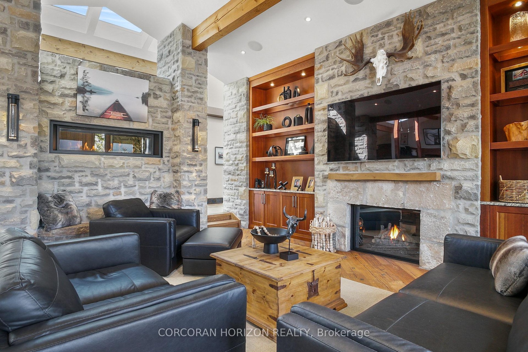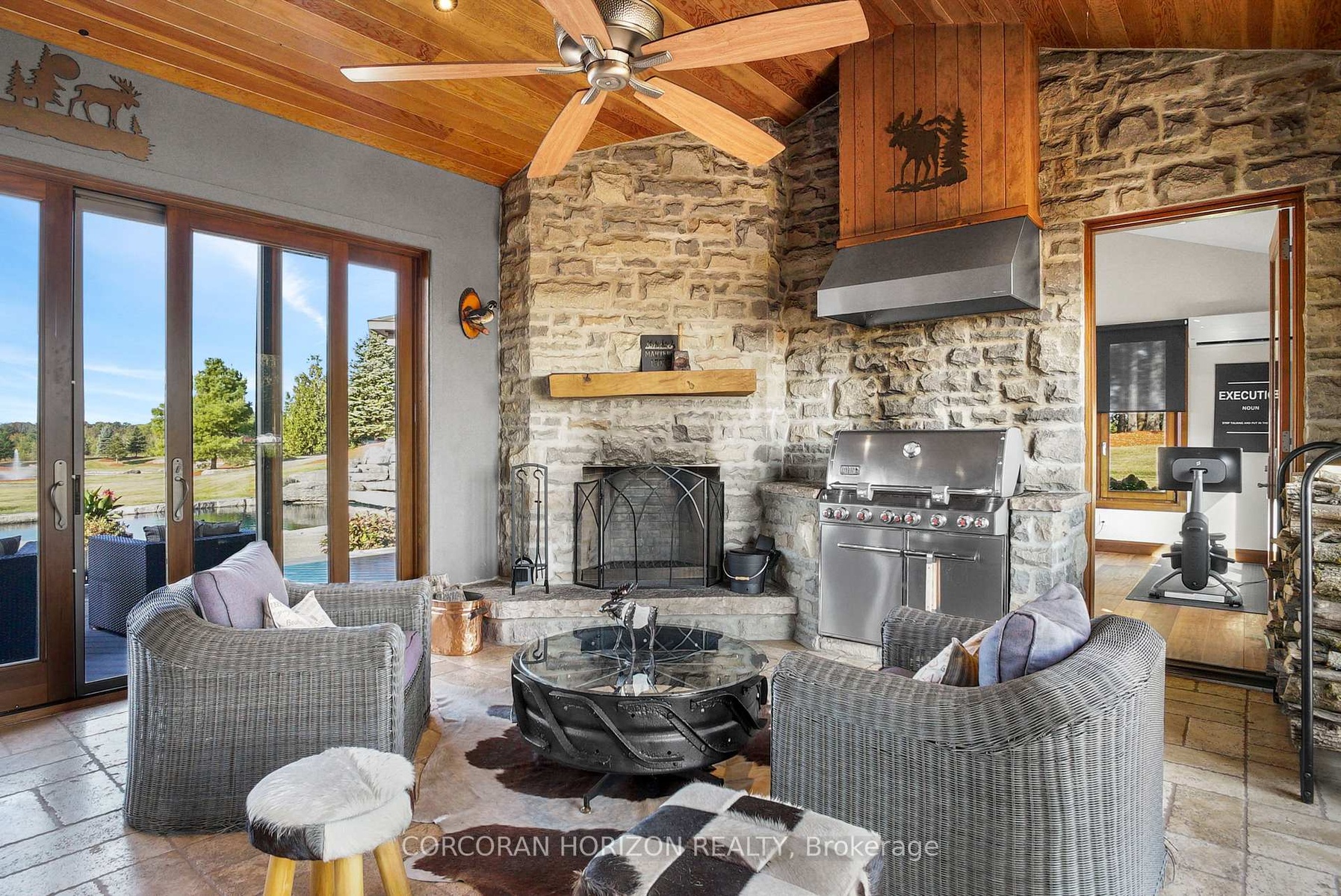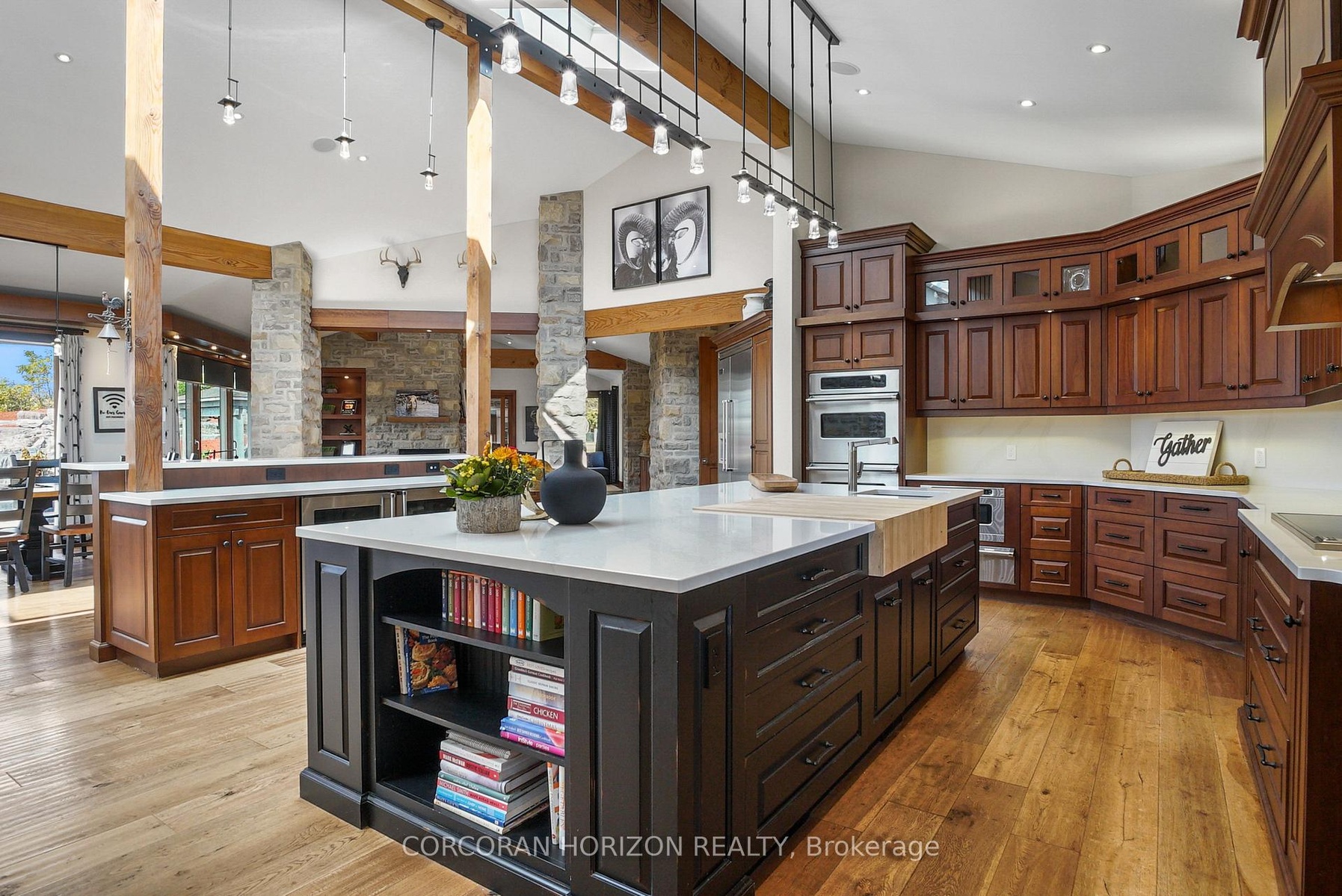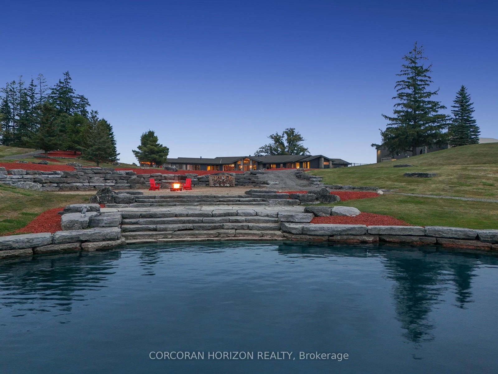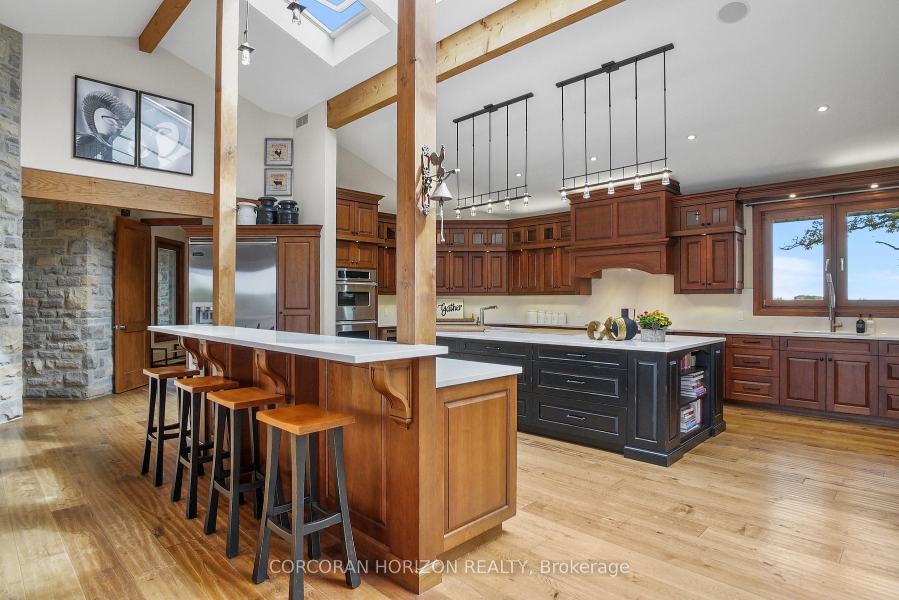 Set on over 120 acres of stunning countryside, this exceptional estate offers a rare combination of privacy, recreation, and luxury living, just minutes from Cambridge, Guelph, and Kitchener-Waterloo. The property is designed for year-round enjoyment, featuring two incredible ponds -one a swim pond perfect for cooling off on warm summer days, and the other a stocked fishing pond with a sandy beach and waterfall, creating a truly resort-like setting at home. Scenic trails wind throughout the property, offering endless opportunities to explore, relax, and enjoy the peaceful natural surroundings. The property also includes a heated 4,000 sq. ft. detached building with in-floor heating, offering incredible versatility for a workshop, car collection, equipment storage, hobby space, or recreational use. The custom-built stone bungalow offers an impressive 10,454 sq. ft. of finished living space, including 6,505 sq. ft. on the main floor and a fully finished 3,949 sq. ft. lower level. Inside, soaring ceilings, skylights, and hand-chipped stone accents create a warm and inviting atmosphere, while natural wood details add character throughout. At the heart of the home is a spectacular gourmet kitchen featuring Viking Professional appliances, Silestone quartz countertops, striking Douglas fir beams, and dual islands designed for gathering and entertaining. The spacious dining area seats 14 and overlooks the picturesque ponds and surrounding landscape. An indoor grilling area with heated floors makes entertaining effortless in every season. The primary suite is a private retreat with direct access to the swim pond and a spa-like ensuite complete with a jacuzzi tub beside a cozy gas fireplace. The fully finished lower level is designed for relaxation and entertaining, offering a spacious recreation area, full bar, billiards space, wine cellar, and a private cinema room. A truly one-of-a-kind property where luxury living meets the beauty of nature.