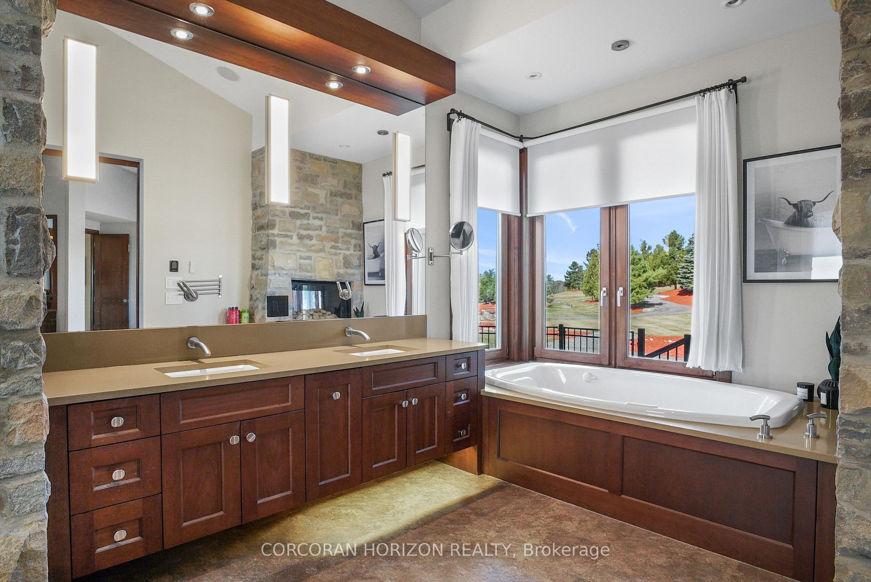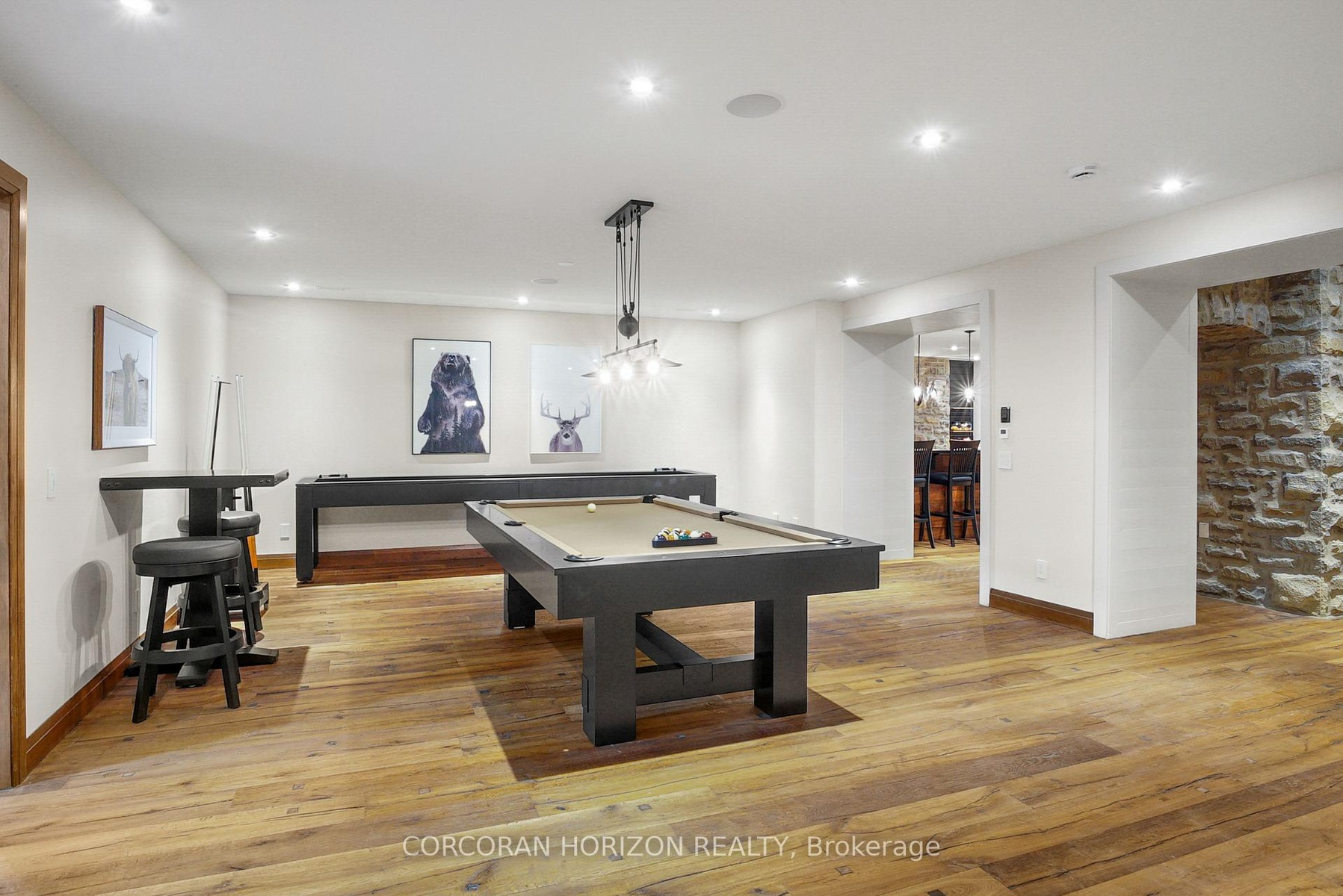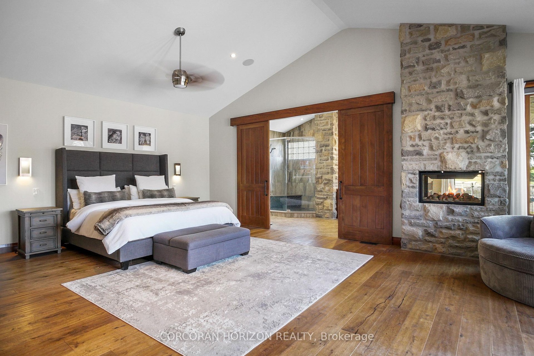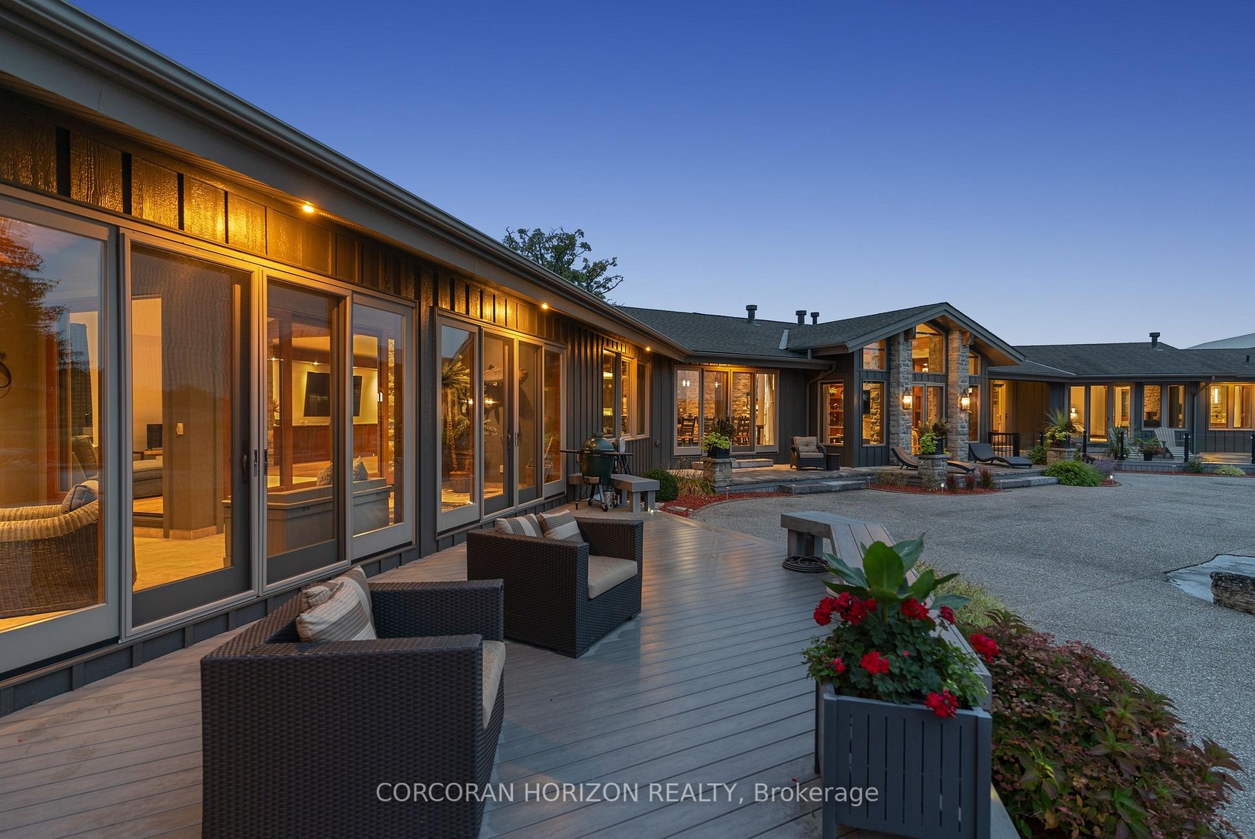 Set on over 120 acres of stunning countryside, this exceptional estate offers a rare combination of privacy, recreation, and luxury living, just minutes from Cambridge, Guelph, and Kitchener-Waterloo. The property is designed for year-round enjoyment, featuring two incredible ponds -one a swim pond perfect for cooling off on warm summer days, and the other a stocked fishing pond with a sandy beach and waterfall, creating a truly resort-like setting at home. Scenic trails wind throughout the property, offering endless opportunities to explore, relax, and enjoy the peaceful natural surroundings. The property also includes a heated 4,000 sq. ft. detached building with in-floor heating, offering incredible versatility for a workshop, car collection, equipment storage, hobby space, or recreational use. The custom-built stone bungalow offers an impressive 10,454 sq. ft. of finished living space, including 6,505 sq. ft. on the main floor and a fully finished 3,949 sq. ft. lower level. Inside, soaring ceilings, skylights, and hand-chipped stone accents create a warm and inviting atmosphere, while natural wood details add character throughout. At the heart of the home is a spectacular gourmet kitchen featuring Viking Professional appliances, Silestone quartz countertops, striking Douglas fir beams, and dual islands designed for gathering and entertaining. The spacious dining area seats 14 and overlooks the picturesque ponds and surrounding landscape. An indoor grilling area with heated floors makes entertaining effortless in every season. The primary suite is a private retreat with direct access to the swim pond and a spa-like ensuite complete with a jacuzzi tub beside a cozy gas fireplace. The fully finished lower level is designed for relaxation and entertaining, offering a spacious recreation area, full bar, billiards space, wine cellar, and a private cinema room. A truly one-of-a-kind property where luxury living meets the beauty of nature.