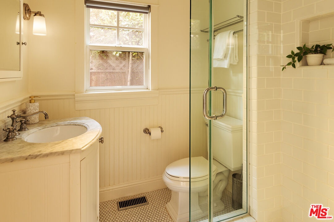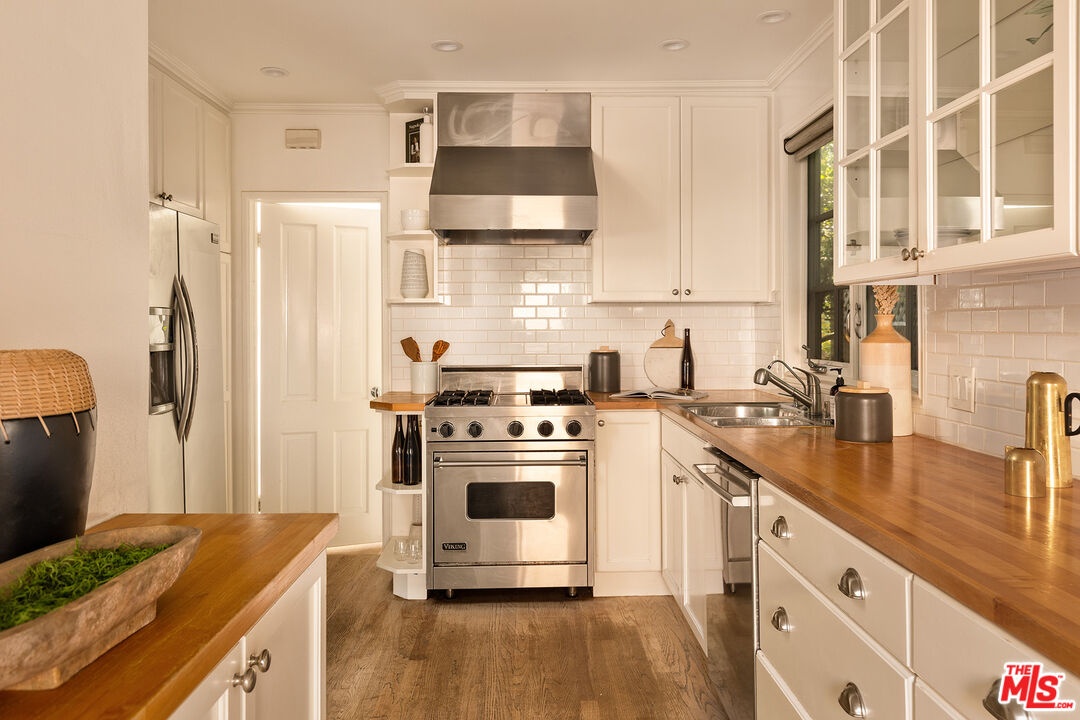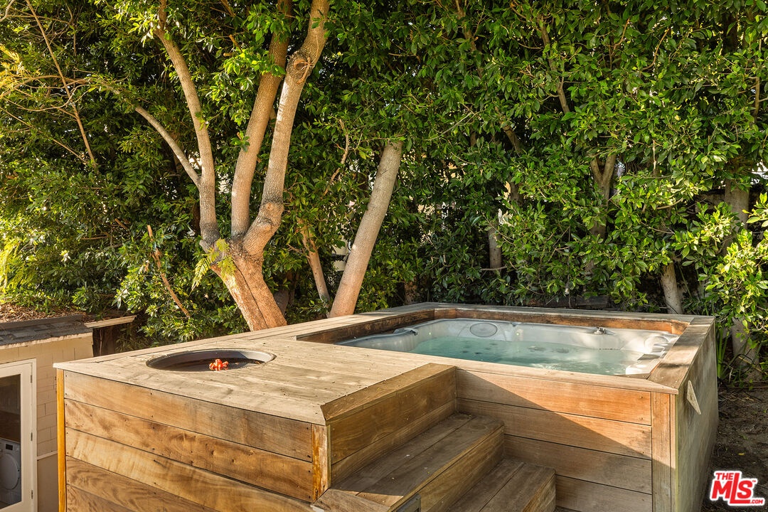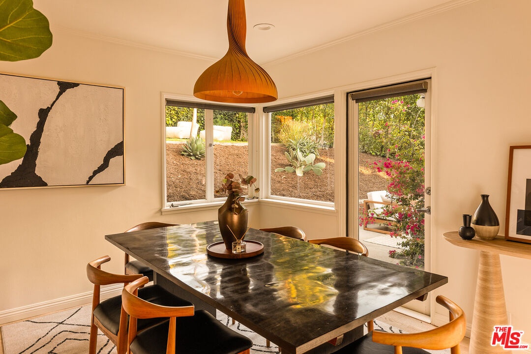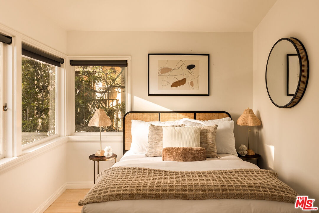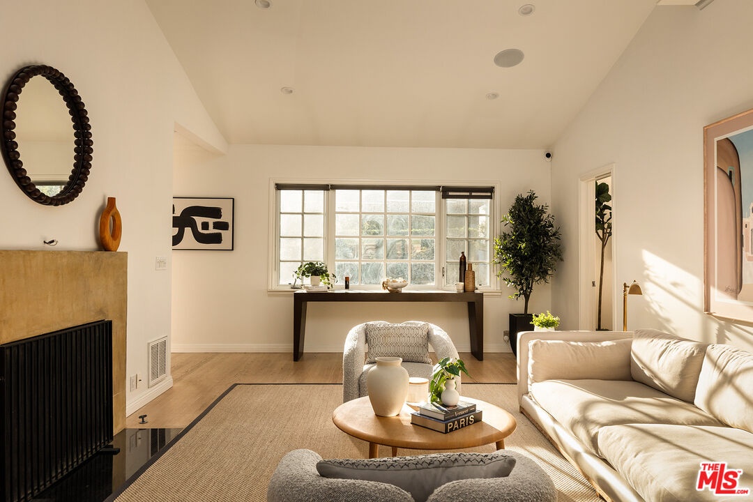 Prime Traditional in coveted Westwood just blocks from Century City. Located mid-block on a mature tree-lined street, this light-filled home offers classic charm with vaulted ceilings and hardwood floors throughout. The entry opens to a dramatic living room with fireplace and walls of glass that bring in abundant natural light from both sides. The dining area connects seamlessly to the chef's kitchen featuring a Viking range and generous prep space, while also opening to the outdoor patio for easy indoor-outdoor entertaining. The second bedroom enjoys bright front-facing light and is served by a full bathroom just off the hallway. The spacious primary suite features vaulted ceilings, an en-suite bath, ample closet space, and direct access to the brick patio for entertaining and backyard. The rear yard offers both hardscape entertaining space and a flat grassy area, complete with a custom spa and cold plunge with west-facing sunset views. A rare opportunity and exceptional value in one of Westwood's most desirable neighborhoods.