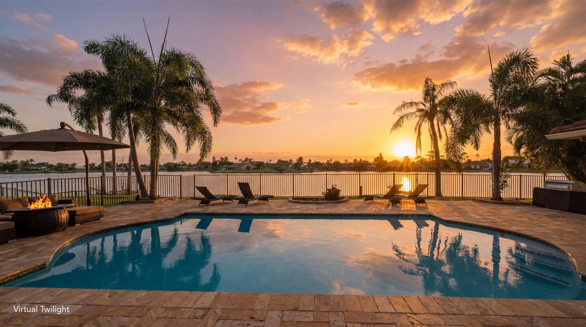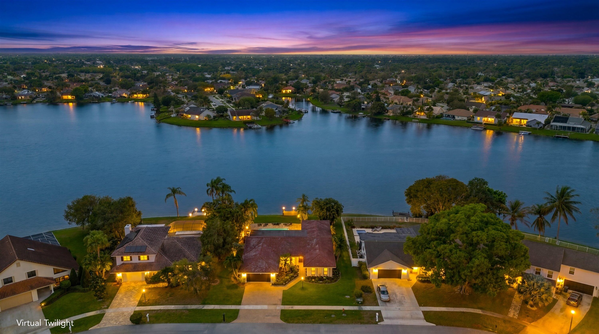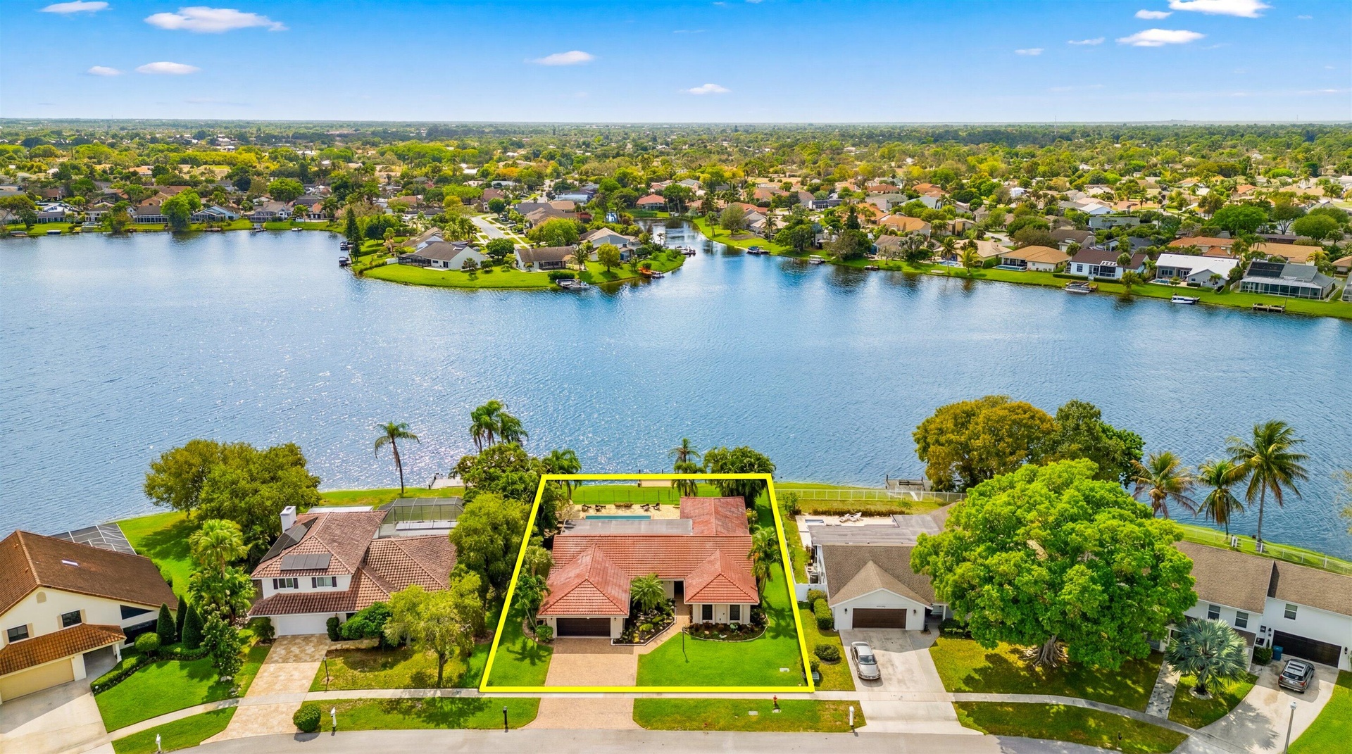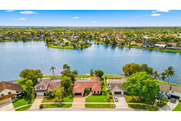 A rare opportunity to own a beautifully updated lakefront residence on Lake Wellington, offering sweeping sunset views from your private dock. This spacious 4-bedroom home features generously sized bedrooms with large closets & a thoughtfully designed layout that maximizes natural light while capturing beautiful pool and lake views throughout the living areas. The home has been updated with all-new appliances, new kitchen cabinetry, and countertops, and new flooring throughout the main living areas. The 2nd bathroom has been fully renovated, and the property is equipped with hurricane-impact windows. Additional interior highlights include 2 inviting living rooms, a large dining room, a beautifully updated laundry room, 2 HVAC systems (2025 & 2015), and 2 water heaters (2025 & 2009). Outdoors, a spacious lakeside patio overlooks the pool & offers wide, unobstructed views of the lake. This expansive setting is perfect for relaxing, hosting guests, and enjoying spectacular sunsets over the water.