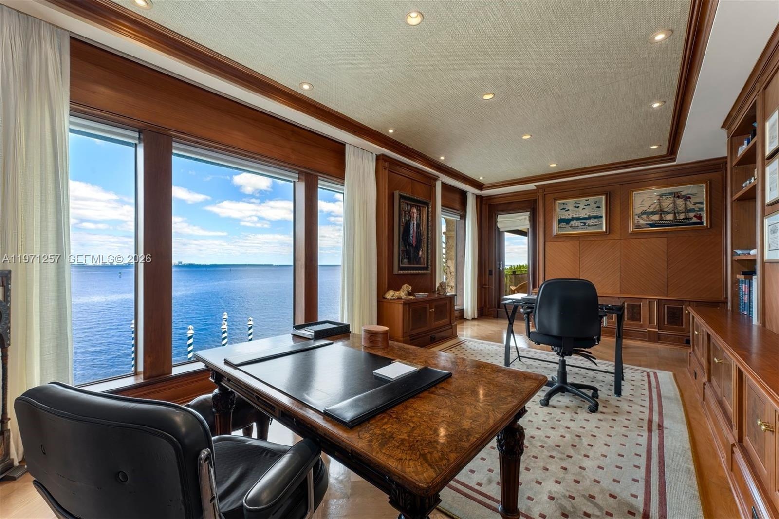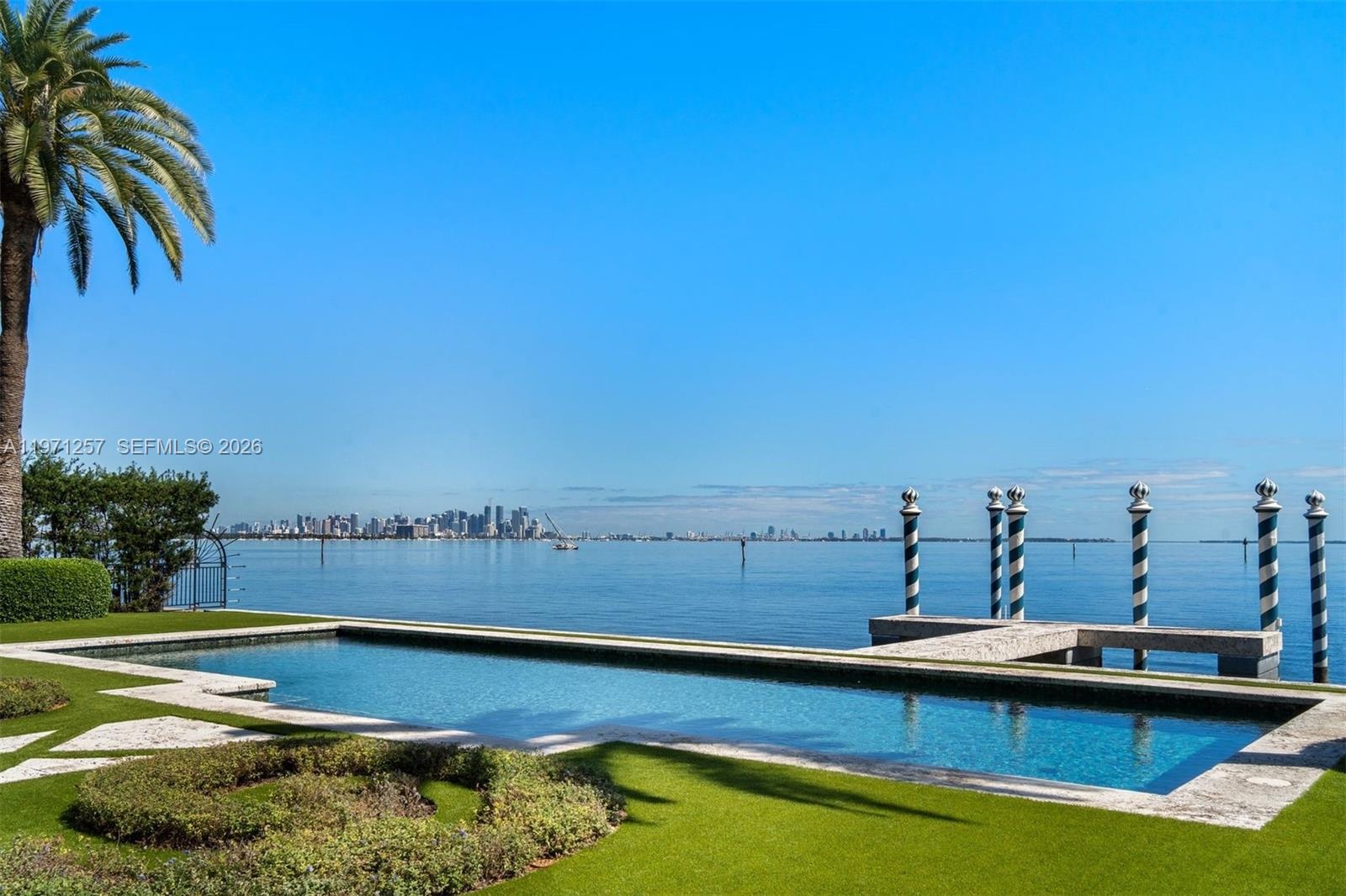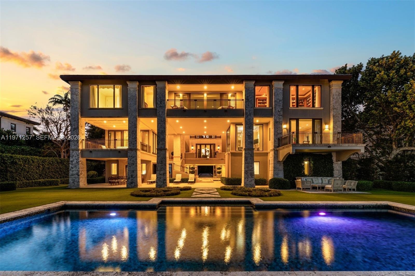 A remarkably beautiful bayfront estate on the exclusive private island of Tahiti Beach within the guard-gated community of Cocoplum in Coral Gables. One of only 27 residences in this ultra-private enclave, the property offers dual access from Tahiti Beach Island Road and a quiet cul-de-sac. Residents enjoy tennis and pickleball courts, a private bayfront beach, and the Islands of Cocoplum’s renovated clubhouse and amenities. Positioned directly on the bay, the estate captures sweeping unobstructed views of Miami Beach, Key Biscayne, and the Atlantic Ocean with direct boating access to the open sea and beyond. Set on a 41,287 SF lot, the 15,232 total SF three-story residence features 5 bedrooms, 8 full baths, 2 half baths, 2 offices, a gym, and flex room. Resort-style grounds showcase a grand loggia entry framing panoramic water views, a heated 18×50 Sukabumi stone saltwater pool, reflecting koi pond, lush landscaping, expansive terraces and balconies, and a private T-dock with Venetian mooring poles. Architectural details include coral stone columns and walls, four-car garage, and whole-house generator. Interiors feature marble and herringbone wood floors, elevator, custom millwork, wet bar, formal living and dining rooms, library, and chef’s kitchen with Sub-Zero, Miele, and Gaggenau appliances. The primary suite offers a terrace, dressing room, dual marble baths, and walnut-paneled office overlooking the bay—an exceptional expression of island luxury and privacy.