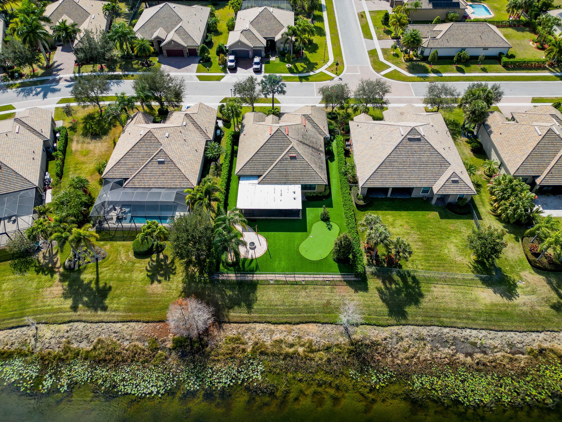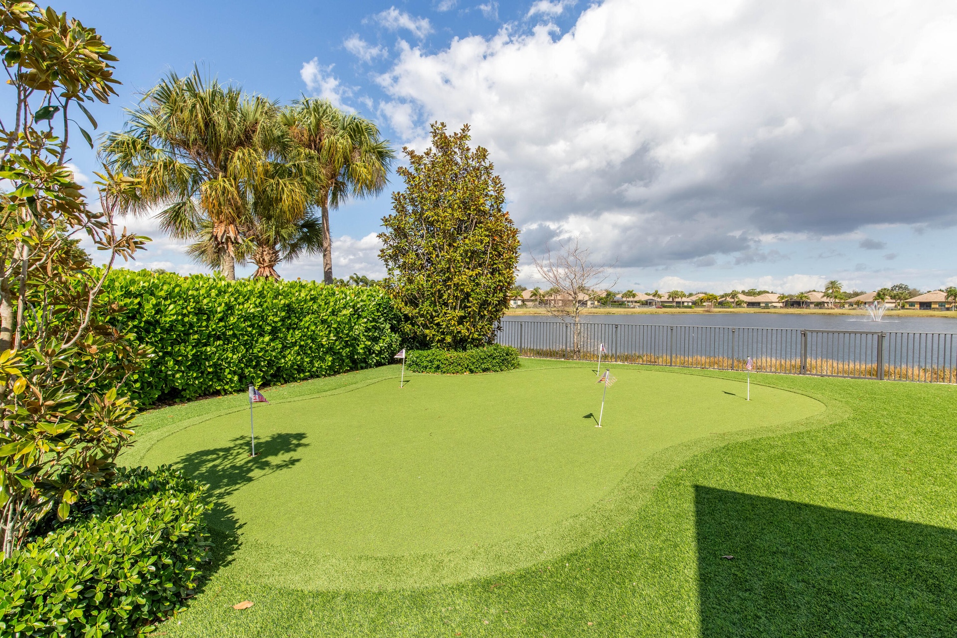 Step outside to your private backyard retreat. The upgraded outdoor area includes a fully built-in summer kitchen, perfect for year-round entertaining. Overlooking the tranquil lake, the yard also features a unique mini-golf area -- a rare and fun addition for golf enthusiasts or family gatherings.