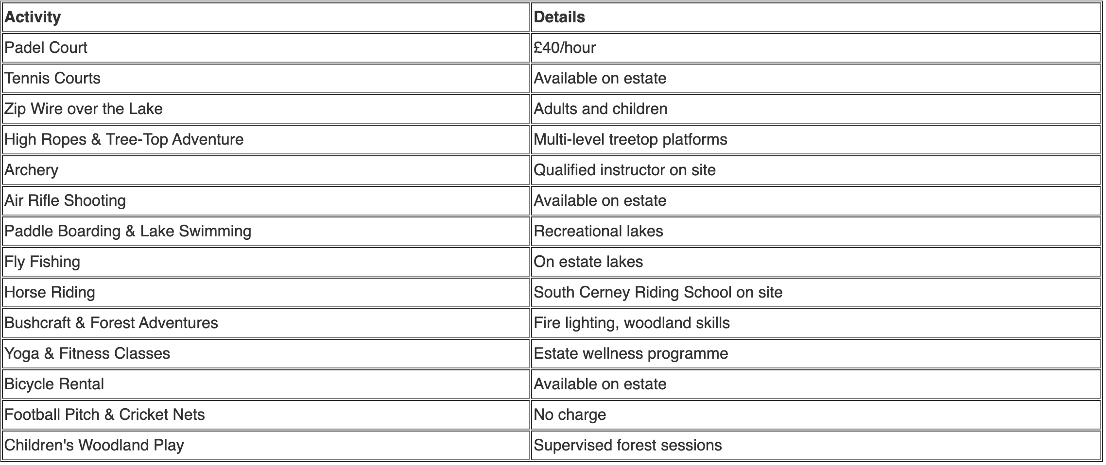 Off-site (bookable via concierge): Polo at Cirencester, gliding at Cotswold Gliding Club, clay pigeon shooting, water skiing, hot air balloon rides, golf at Wrag Barn and Burford Golf Club.