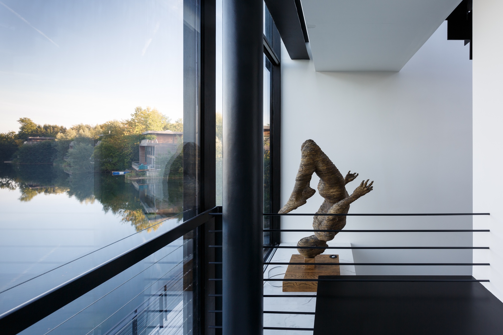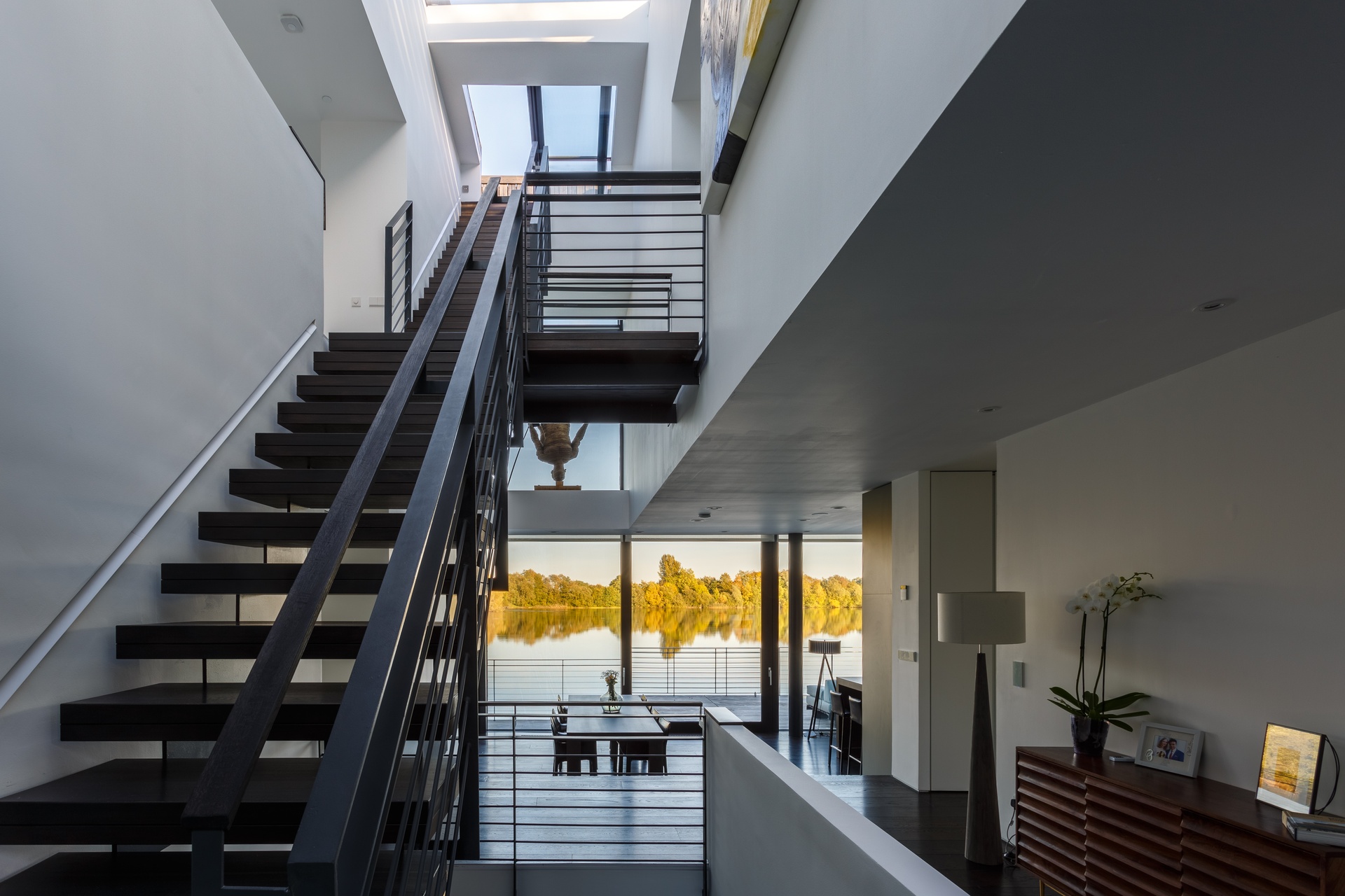 Three bedrooms sit on the first floor and one on the ground floor, each with its own en-suite bathroom, rainfall shower, and spa-grade Rituals and Lafco New York toiletries. Open-plan living areas cascade across the ground floor with panoramic lake views from every angle. A glass-roofed staircase connects three levels — basement, ground, and first floor — culminating in a roof terrace accessible via an electrically operated skylight.