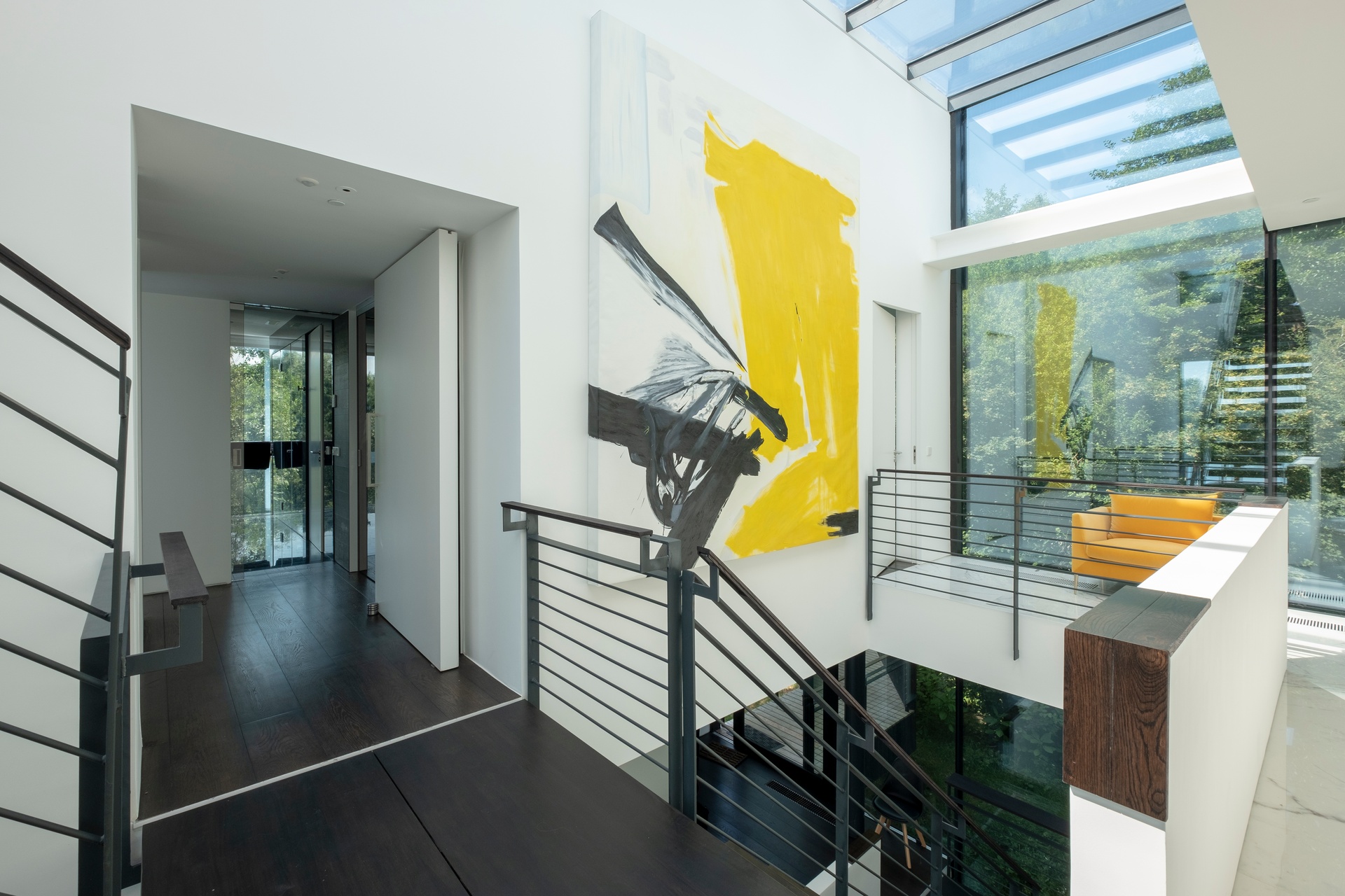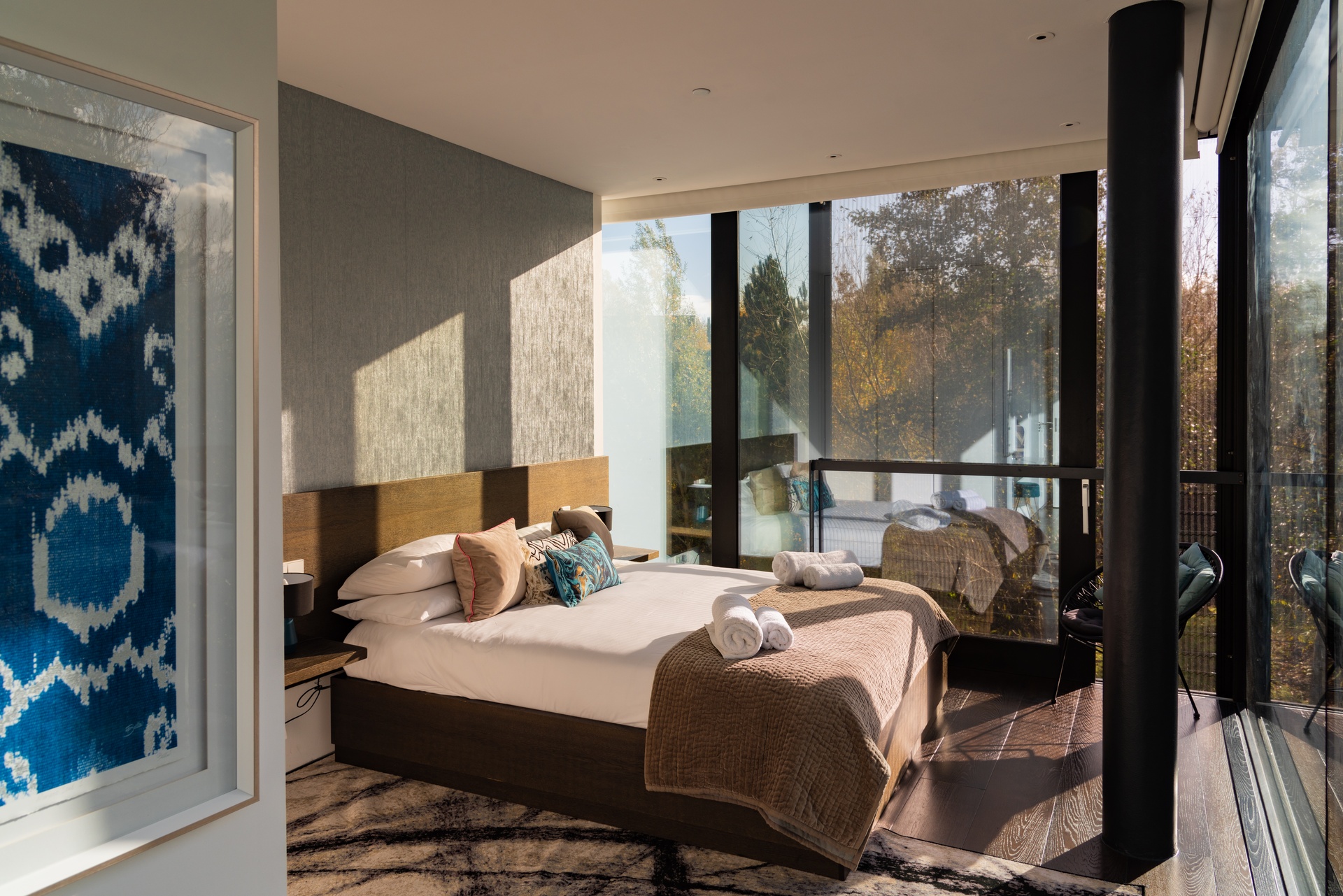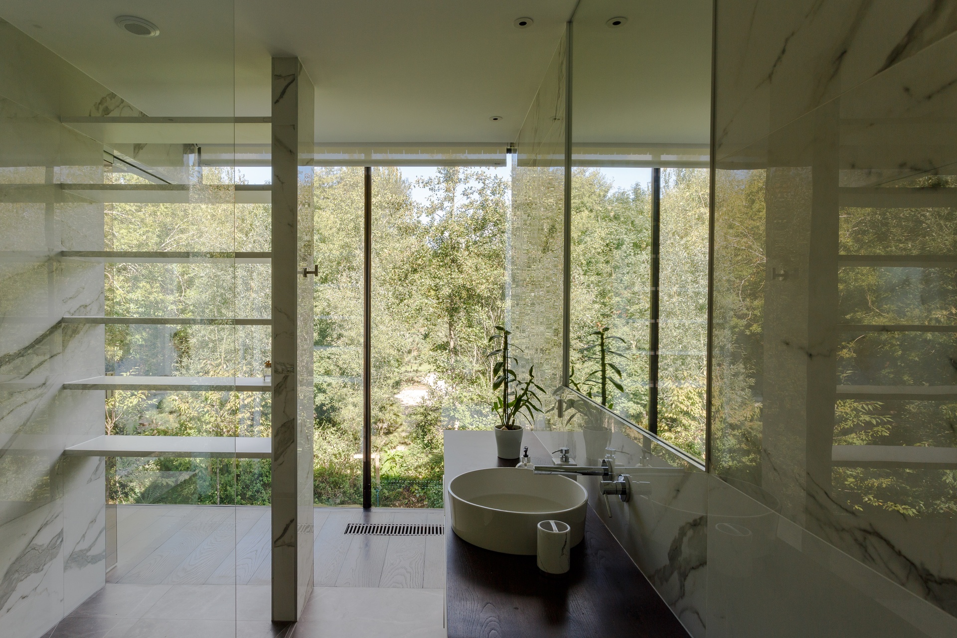Ceiling heights reach 2.8 to 3.5 metres. The glass-roofed central atrium floods three levels in natural light. Every design decision, from sight lines to materials to the angle of the bridge entrance, was made to deepen your sense of being cocooned in nature.