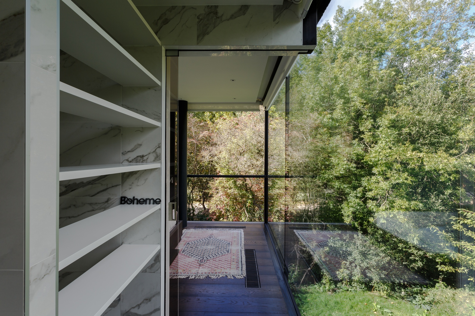 The exterior is clad in Sugi Ban — an ancient Japanese technique of charring timber without chemicals, creating a fire-resistant, sustainably preserved finish that ages beautifully with nature. Inside, the palette moves through Negro Marquina and Carrara marble, dark wood, 500-year-old carved oak stairs from Slovenia, and signature lighting from Tom Dixon, Bocci, Davide Groppi, and Philippe Starck.