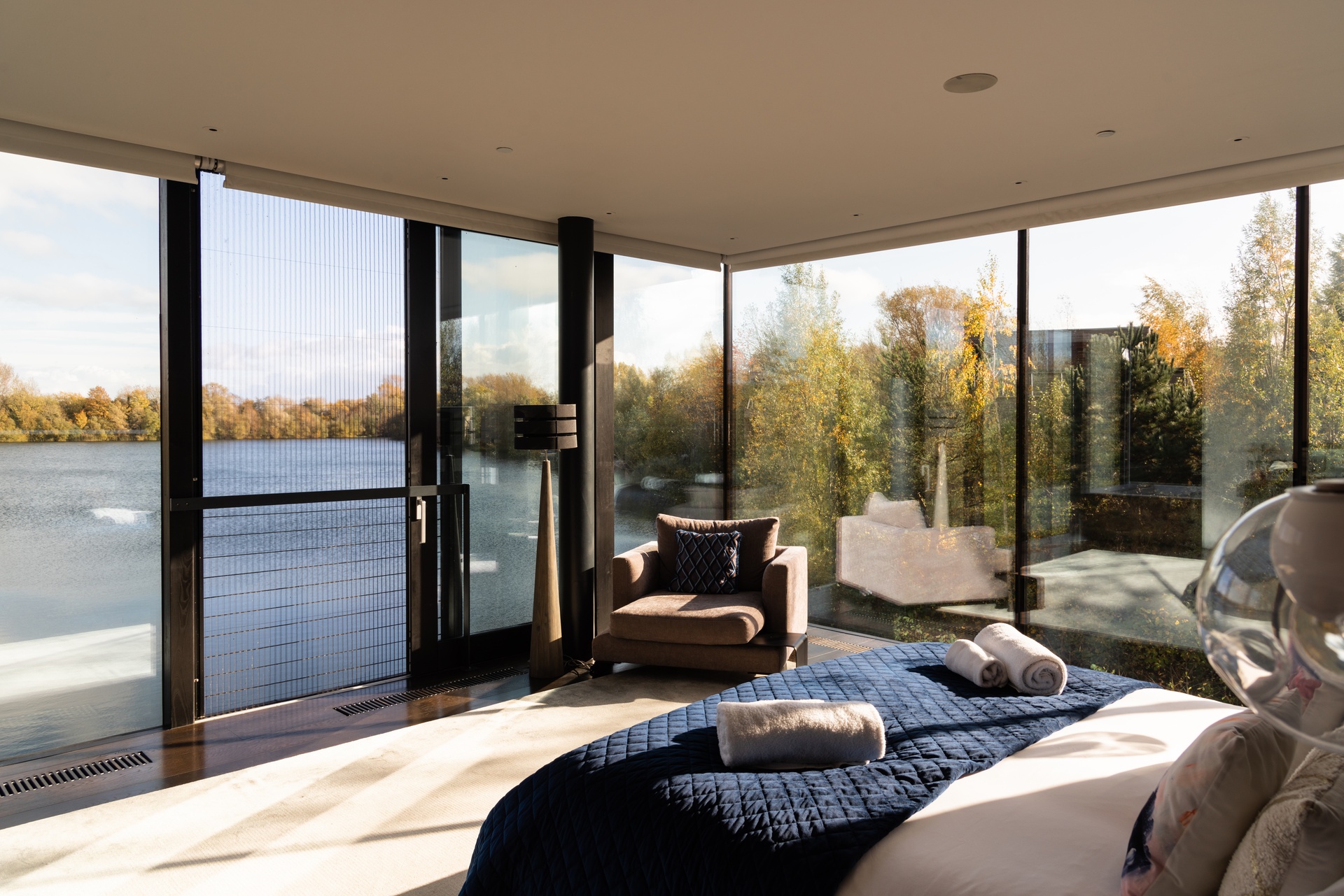 Sitting directly on a private lake within the 850-acre Lakes by Yoo estate in Lechlade-on-Thames, this is one of the most extraordinary holiday homes in England. Designed by award-winning Dutch architects Mecanoo, the 6,000 sq ft retreat does not simply sit beside water — it hovers above it. Every principal room is framed by floor-to-ceiling glass walls up to 7cm thick, so the lake, the sky, and the seasons are your constant, ever-changing backdrop.