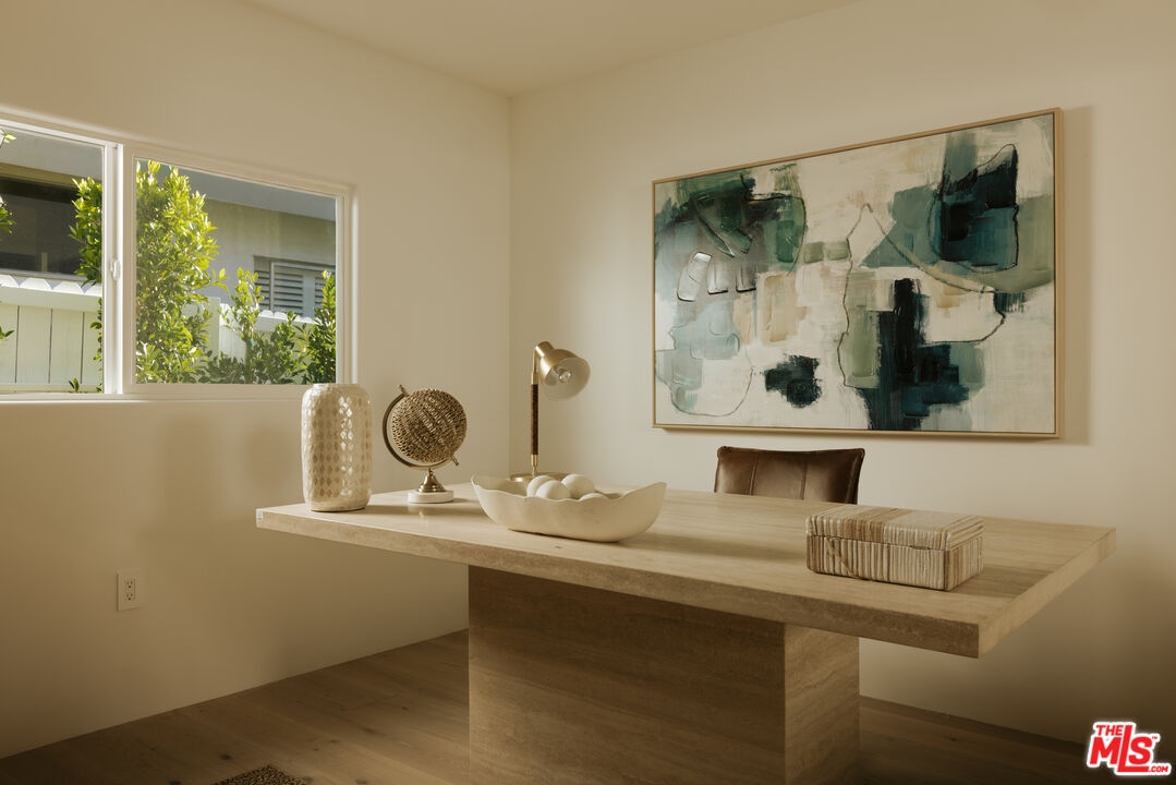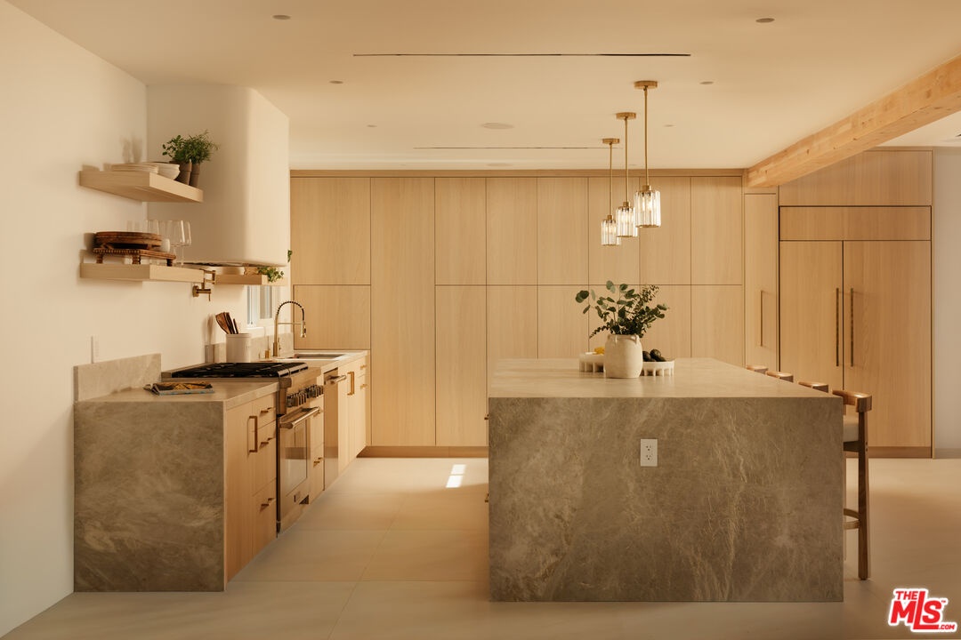 A striking expression of Organic Modern design with Contemporary Mediterranean influences, this fully reimagined single-story residence sits on a 14,013 sq ft lot capturing breathtaking canyon and city views. Spanning 2,757 square feet with 4 bedrooms and 4 bathrooms, the home was taken down to the studs and meticulously rebuilt, resulting in a designer showcase where every detail has been thoughtfully curated.An inviting open-concept floor plan unfolds beneath soaring ceilings accented by graceful architectural arches and skylights that bathe the interiors in natural light from morning through sunset. Walls of sliding glass doors dissolve the boundary between indoors and out, creating effortless flow ideal for both daily living and sophisticated entertaining.At the heart of the home, the chef's kitchen makes a striking statement, featuring leathered stone waterfall countertops, an oversized gathering island, abundant cabinetry, a Thermador range with custom plaster hood, and elegant floating shelves. Oversized porcelain tile grounds the main living areas, while wide-plank hardwood floors add warmth to the private bedroom quarters.The outdoor spaces unfold as a private retreat designed for both relaxation and entertaining, complete with a welcoming porch framed by a grassy yard and artful landscape lighting, a sparkling pool and jacuzzi, outdoor kitchen, firepit lounge, and lush grassy areas in the front and backyardperfect settings for alfresco dining and sunset gatherings.Inside, gas fireplaces in the living room and primary suite finished with touches of Venetian plaster lend subtle vintage elegance. The primary suite offers expansive horizon views, generous closet space, and a breathtaking spa-inspired bathroom with a dramatic stone walk-in shower.The finished and insulated garage, with individual AC offers exceptional versatility and has been thoughtfully prepared to function as an extension of the living spaceideal for a gym, studio, office, or additional flex area.Additional features include a double-zone HVAC system, two AV charging stations, and a tranquil setting within the coveted Kenter Elementary School districtdelivering a sophisticated California lifestyle where design, comfort, and natural beauty converge.