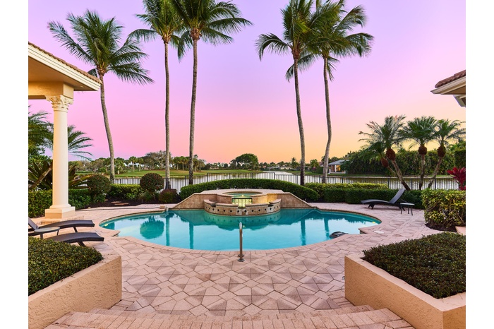 Located along one of the most prestigious streets in Ibis Country Club, often referred to as the community's famed "Street of Dreams", this exceptional estate offers breathtaking long water views and sweeping golf course vistas. Homes offering this rare combination of expansive lake frontage and unobstructed fairway views represent some of the most coveted locations within all of Ibis. This grand Mediterranean residence has been meticulously maintained and thoughtfully updated, including a new roof installed in 2022, a new AC system in 2022, a new Hot Water Heater in 2025, and two additional AC units replaced in 2017, providing both elegance and peace of mind for years to come. Inside, a dramatic entry opens to soaring ceilings, elegant architectural detailing, and recently restored neutral-toned marble flooring with tasteful inlays throughout the main living areas, creating a timeless and refined atmosphere. Walls of glass frame the spectacular water and golf views while filling the home with natural light and seamlessly blending indoor and outdoor living. The spacious interior living areas flow effortlessly to the outdoor terrace, where a resort-style pool and spa, expansive patio, and covered lanai w/outdoor grill create the perfect setting for entertaining and enjoying the serene surroundings. The luxurious primary suite serves as a private retreat and features a dedicated office located within the suite, offering both privacy and convenience. The suite also includes generous walk-in closets and a spa-inspired bath designed for relaxation. Additional highlights of the home include a private theatre room, creating an ideal space for movie nights and entertaining guests. Located within the gates of the award-winning Platinum Club of America Ibis Country Club, residents enjoy access to world-class amenities including championship golf, tennis, pickleball, state-of-the-art fitness facilities, spa, fine dining, and a vibrant private club lifestyle. A rare opportunity to own a premier estate property with spectacular water and golf views on one of Ibis Country Club's most celebrated streets.