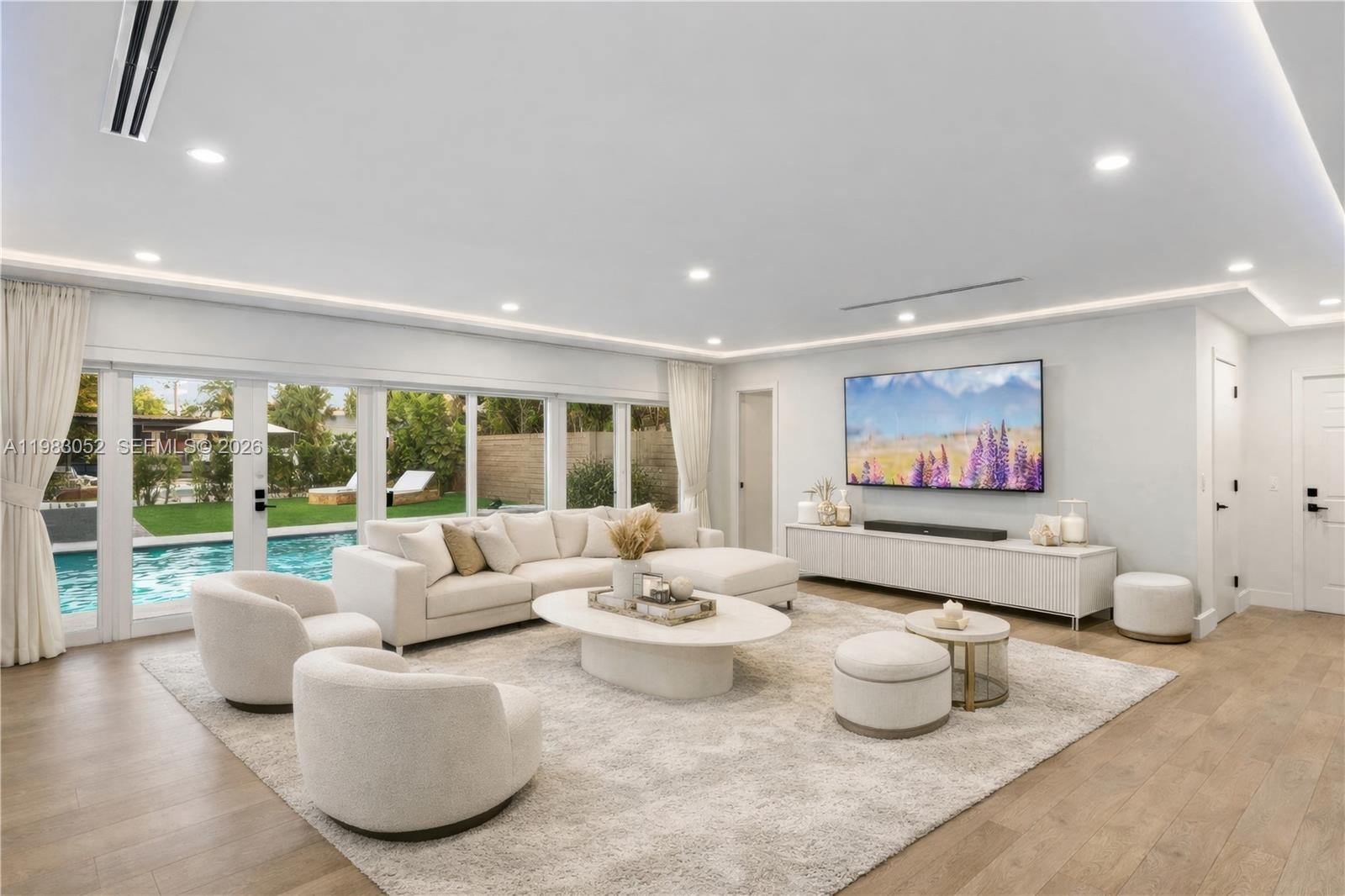 Close to 2,700 SF (and 3,673sqft total) of bright, fluid interiors have been reimagined from the ground up: new roof, plumbing, AC, and impact windows throughout, complemented by designer finishes and a chef's kitchen with an oversized island perfect for entertaining.