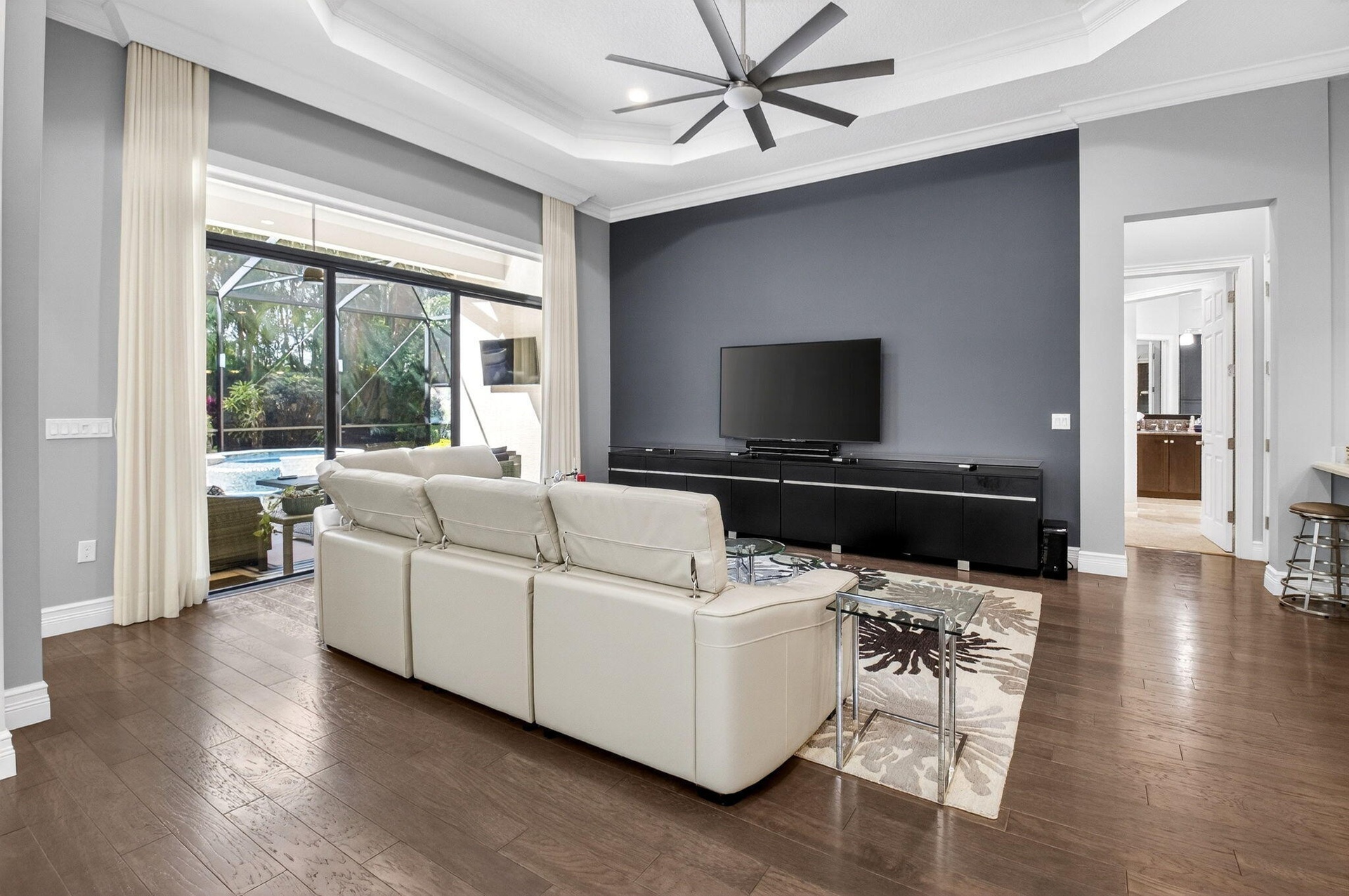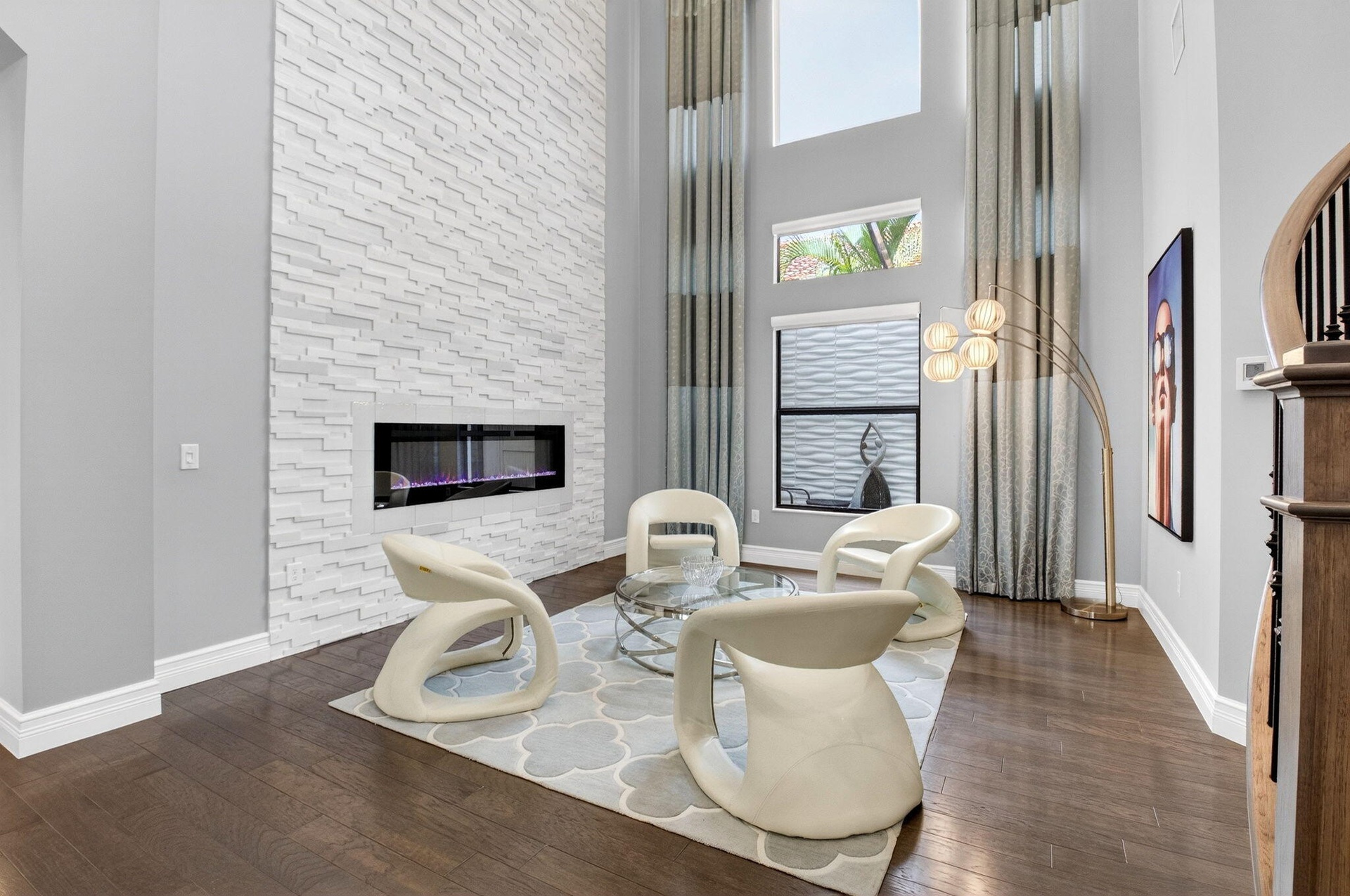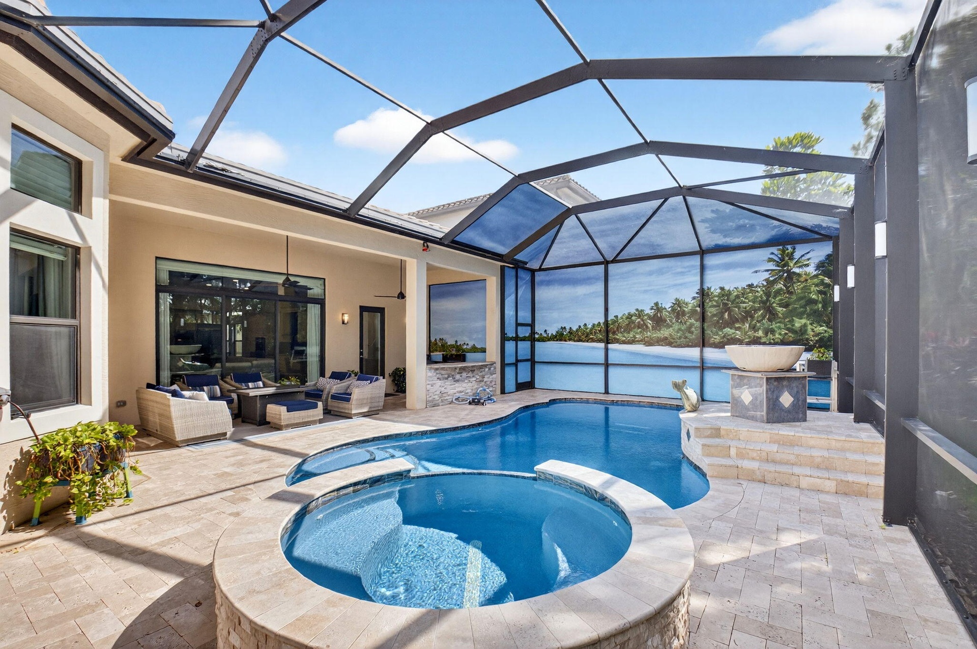 Welcome to Prestigious Seven Bridges. This Vizcaya Model with 5 bedrooms has a versitle floor plan featuring designer built-ins, and wood flooring throughout. Enter through a two-story grand foyer with a tiered chandelier, soaring ceilings, and an impressive circular staircase. The spacious open floor plan features a living room with a dramatic two-story stone wall fireplace, dining room, and a gourmet center island kitchen equipped with a gas cooktop and KitchenAid appliances. The spacious den offers an entertainment center and wet bar, providing a versatile space for relaxation or work. The main level features an Office Library and the Private Primary Bedroom Suite with built-in wardrobe closets and a spa-inspired en-suite bath. There are four additional en-suite bedrooms with full baths Relax or entertain in your Flex Room 5th Bedroom or theater/game room, and an additional lounge loft. The outdoor resort-style backyard features a screened lanai, cabana bath, bar, firepit table, and audio-visual components. Escape to your tropical paradise pool and spa area with ultimate privacy . Residents have access to elevated lifestyle amenities, including a clubhouse with a grand ballroom, lounges, a full-service restaurant, a Starbucks coffee shop, indoor basketball court, game room, children's playhouse, three pools, and professional tennis and pickleball programs with twelve tennis courts and four pickleball courts.
