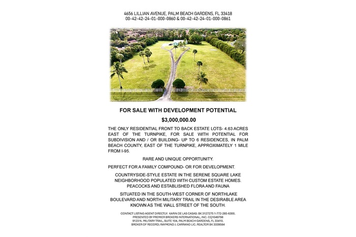 The home is situated on 4.63 Acres, the largest residential lot available in all of Palm Beach County East of the Florida Turnpike. With potential for subdividing up to 6 parcels, also ideal for a Family Compound. Located in the Palm Beach Gardens area coming to be known as: 'The Wall Street of the South', it's just one turn off the Northlake Boulevard and North Military Trail metropolitan area, to the serenity of the Square Lake neighborhood populated with peacocks, horses and custom estate homes. This 1972 home is structurally sound with a beautiful layout, in need of updating. The 4.63 acres consists of two nearly identical 2.31+ acre lots situated front to back onto Lillian Avenue. City Water availablePCN 00-42-42-24-01-000-0861 2.32 Acres PCN 00-42-42-24-01-000-0860 2.31 Acres Complete Survey is Pages 1 & 2.Professional Architect and Planner's Due Diligence Statement for Property's Highest and best use available to qualified Buyers upon request.