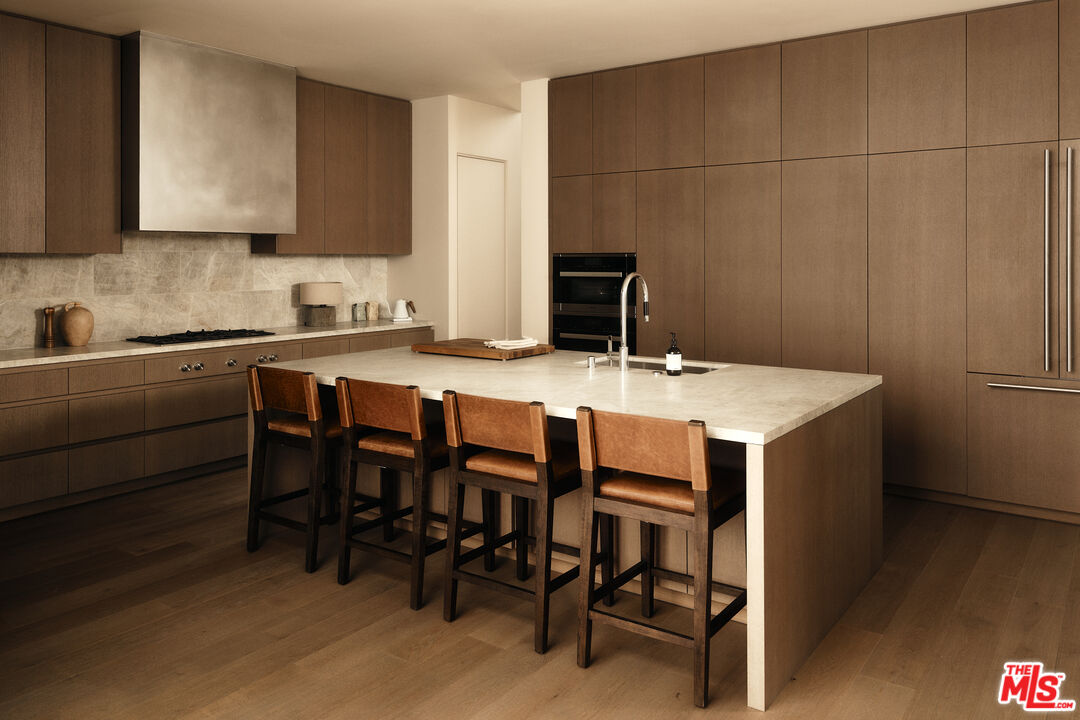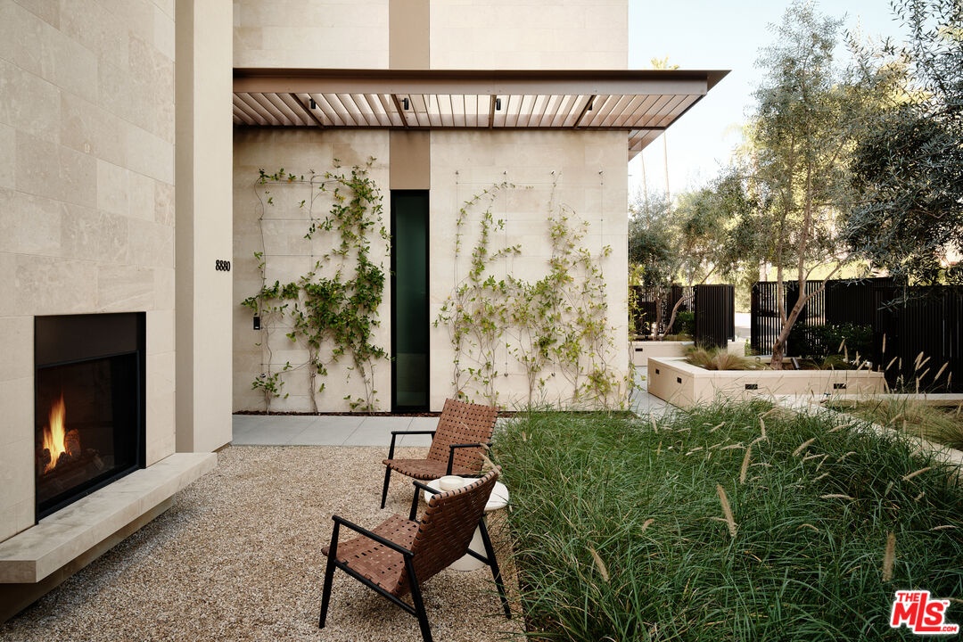 Stone House by Olson Kundig at 8899 Beverly is a singular architectural residence offering a rare combination of privacy, scale, and full-service luxury in the heart of West Hollywood. One of only eight signature homes within this acclaimed development, and the largest of the collection, Stone House is the only one of its kind. The four-bedroom, four-and-a-half-bath home spans over 3,600 square feet and is defined by a refined interplay of light champagne steel and substantial limestone that carries from the exterior through a formal sequence of interior spaces.A distinctive axial layout creates a natural flow throughout the home, centered on a dramatic double-height entry and living space. A sculptural, double-sided fireplace anchors the central living area, opening to both the front garden and the interior. A bespoke custom stair with exposed structural steel is paired with a glass guard, leading to an interior steel bridge above the central living area. Fleetwood operable sliding doors extend the living spaces and kitchen to a private backyard retreat with a plunge pool and spa. Interior finishes are warm and cohesive, with wood flooring throughout and plain-sawn oak cabinetry carried consistently across the home. The kitchen is fully integrated with custom-paneled cabinetry and a premium suite of Gaggenau and Miele appliances. The primary bedroom is a true sanctuary, featuring a fireplace, dual walk-in closets, and a spa-like bathroom finished in Crema Ella marble with a freestanding soaking tub. All four bedrooms feature custom closets and built-ins. As part of the Olson Kundigdesigned 8899 Beverly development, homeowners enjoy access to 24-hour concierge and property management services, a state-of-the-art fitness center, and a landscaped amenity deck with resort-style pool and spa and a custom outdoor kitchen. One of only four remaining homes in the development, Stone House offers a rare opportunity to own a fully private, architecturally significant residence with the services and amenities of a world-class enclave.