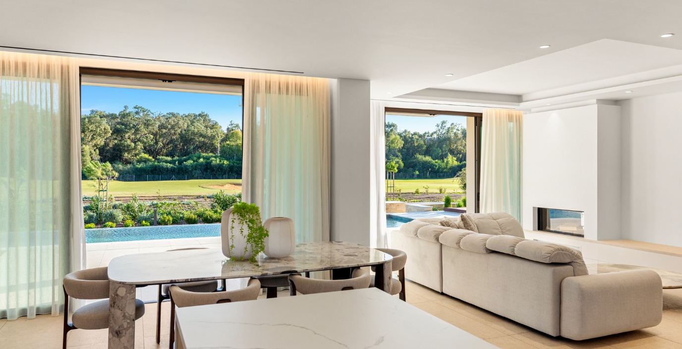 The villa features spacious open-plan living and dining areas that flow effortlessly toward large shaded terraces and beautifully landscaped gardens. Floor-to-ceiling windows allow natural light to fill the interiors while connecting the indoor spaces with the outdoor environment. The private overflow swimming pool and outdoor lounge areas create the perfect setting for entertaining, relaxation and enjoying Cyprus’ year-round sunshine.