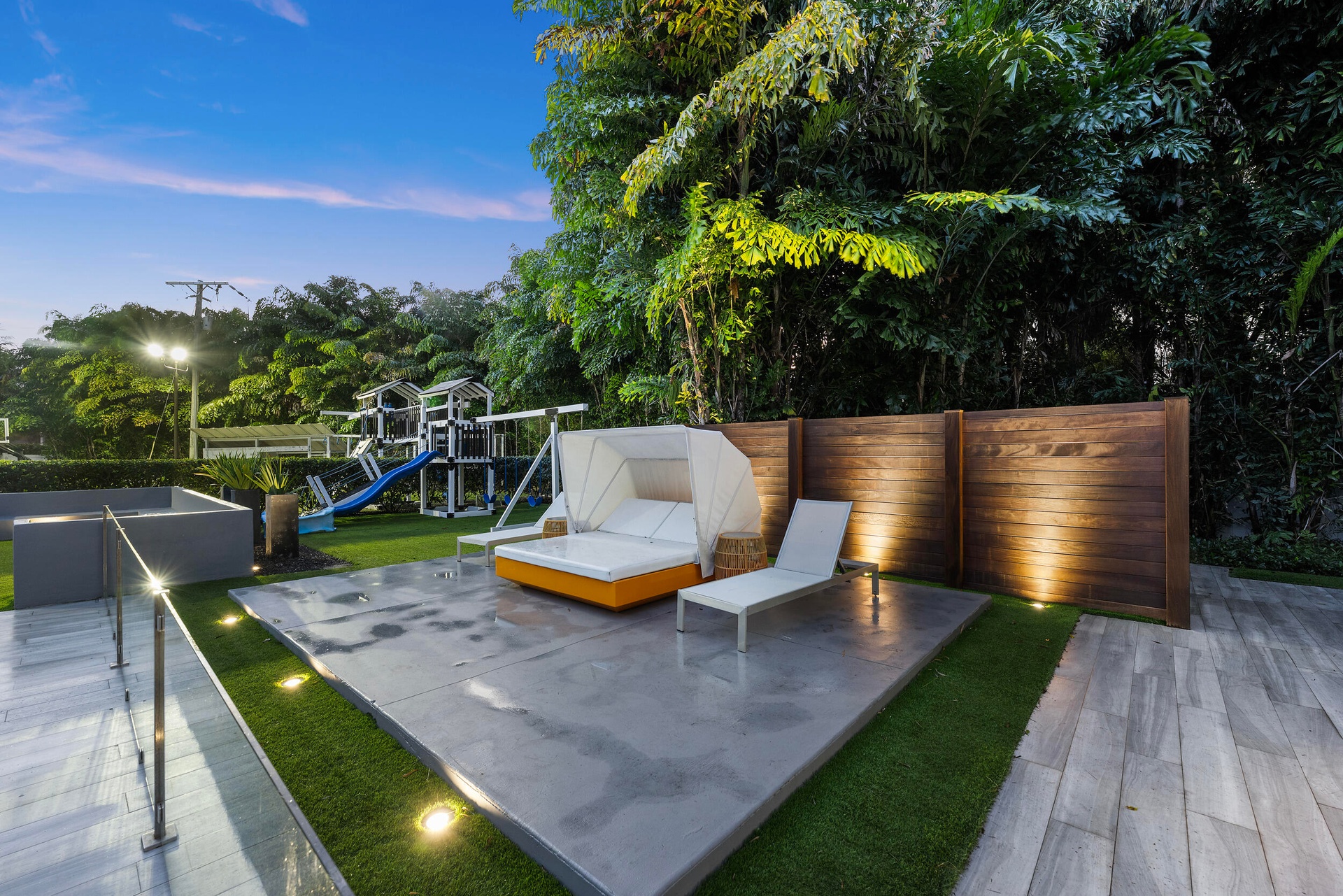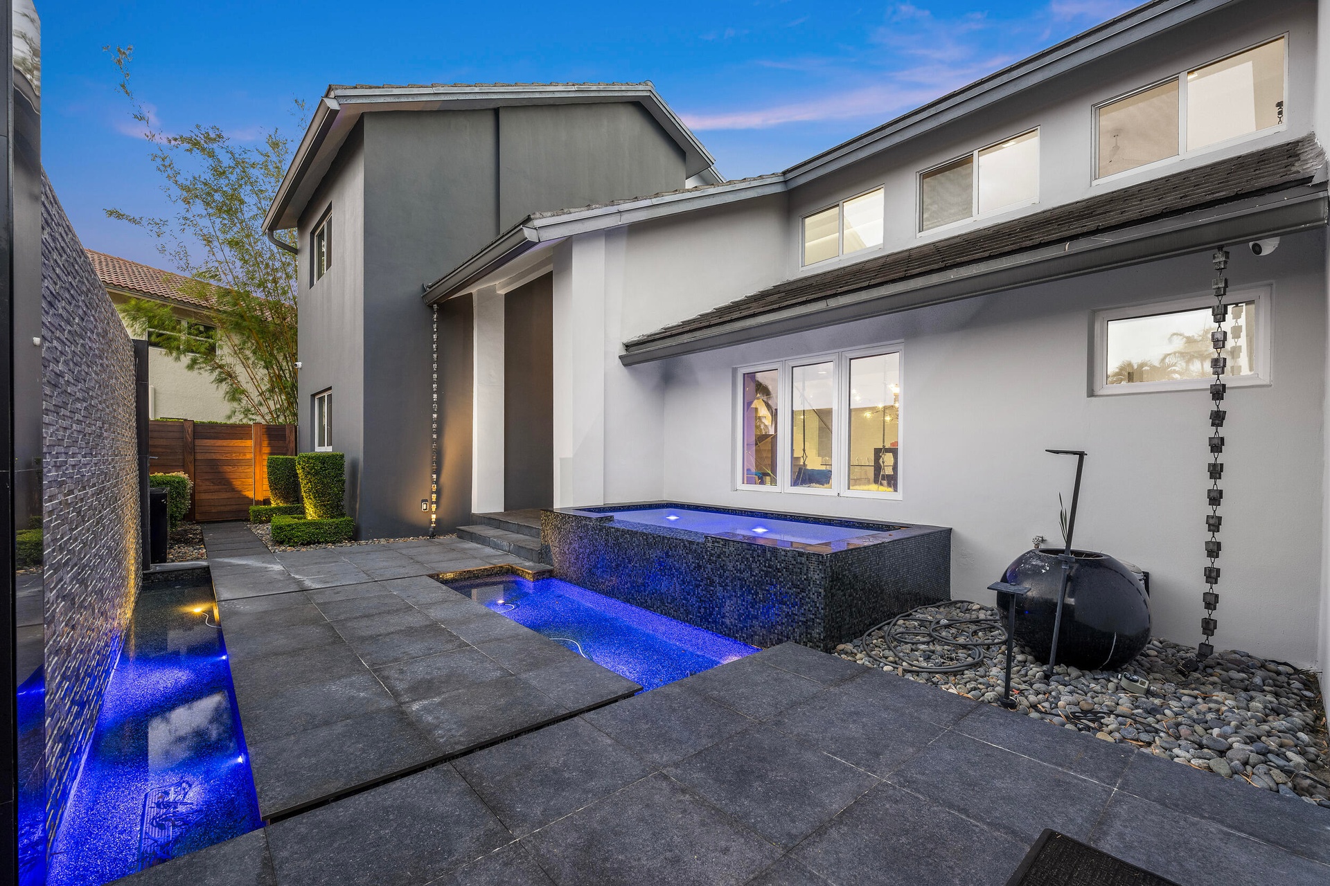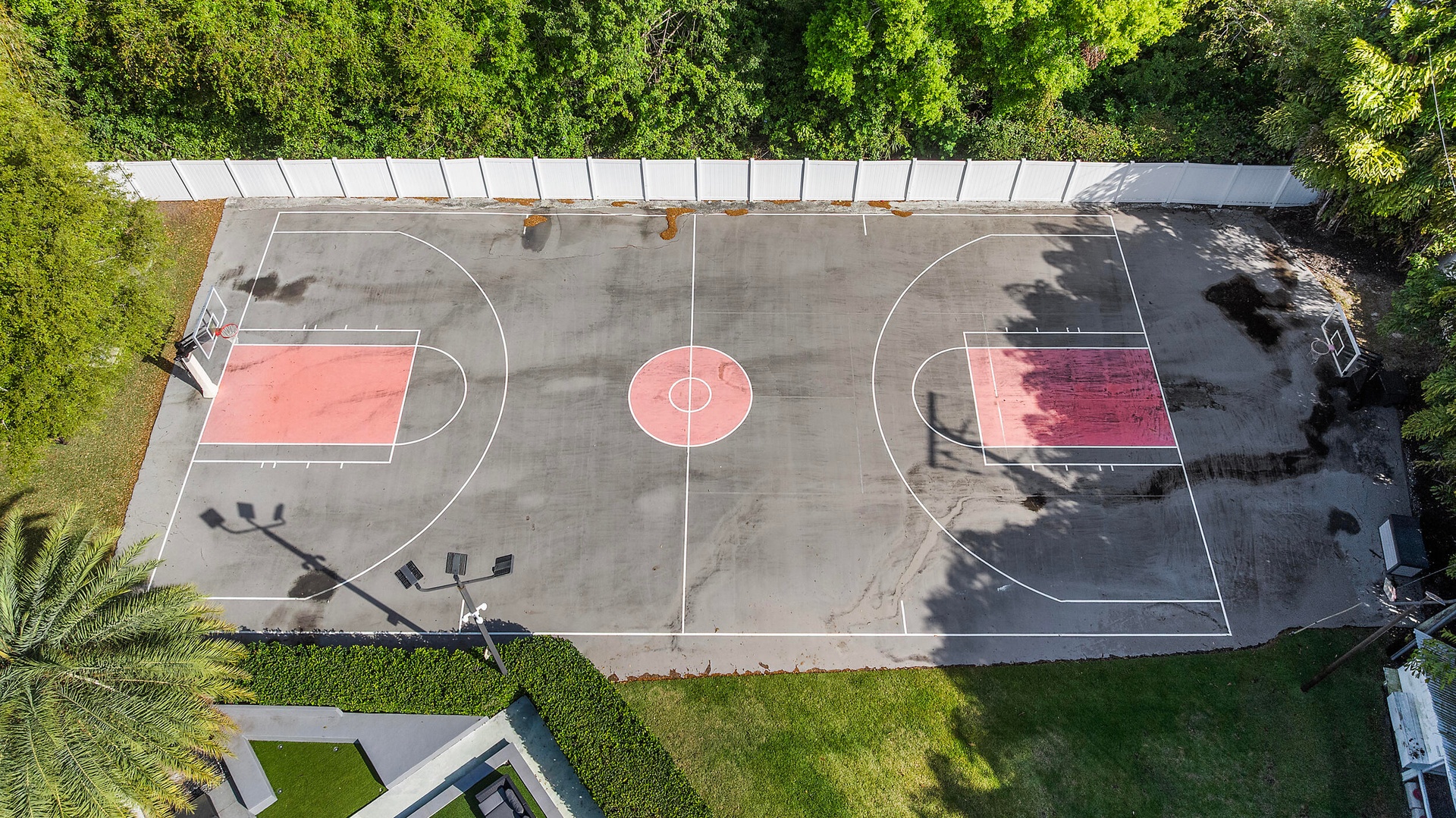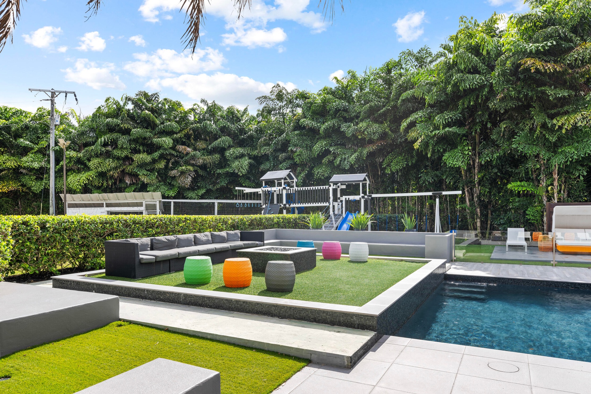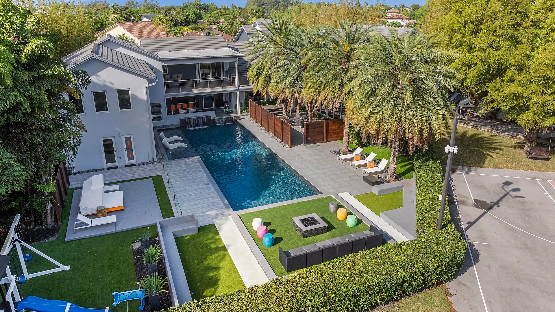 Step outside to your private oasis, where a balcony overlooks a sparkling oversized pool, lush landscaping, and a fully fenced yard offering both privacy and direct access to Powerline Rd. Designed for ultimate entertaining, the outdoor space includes a kitchen, full regulation basketball court, and playground. Additionally, the foundation and plans are in place for a 3-bedroom, 3.5-bathroom guest houseready to be completed if desired.