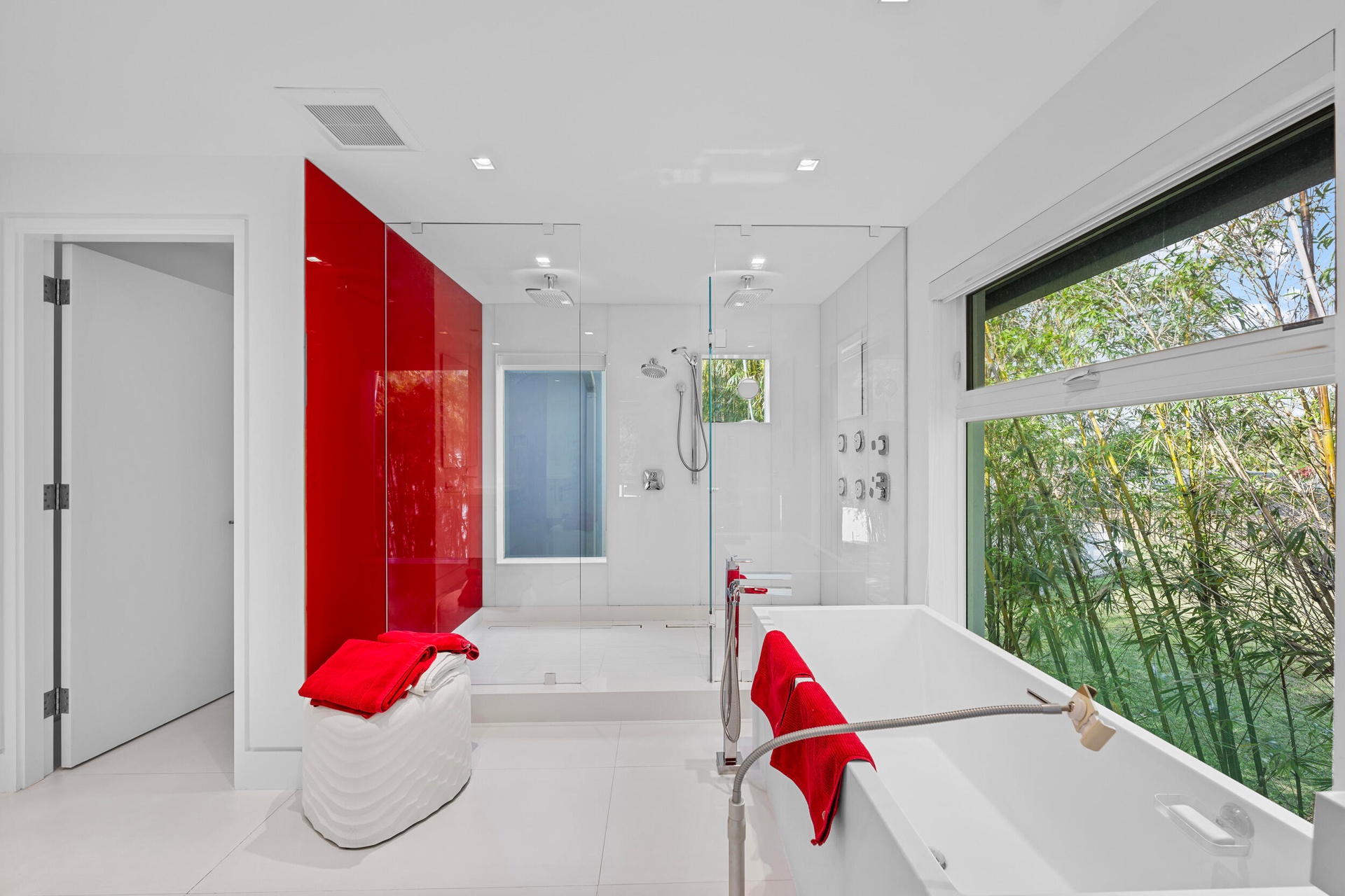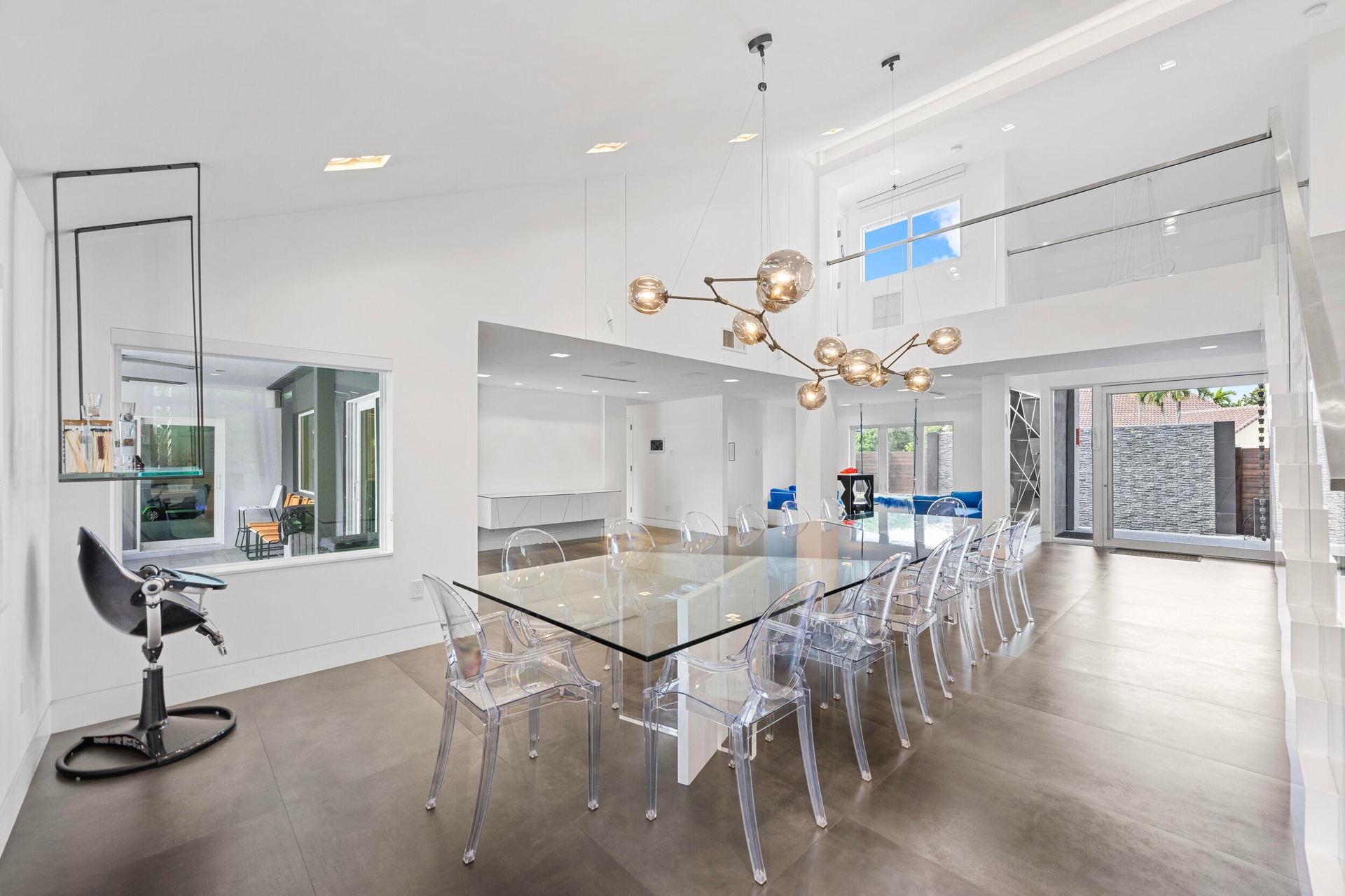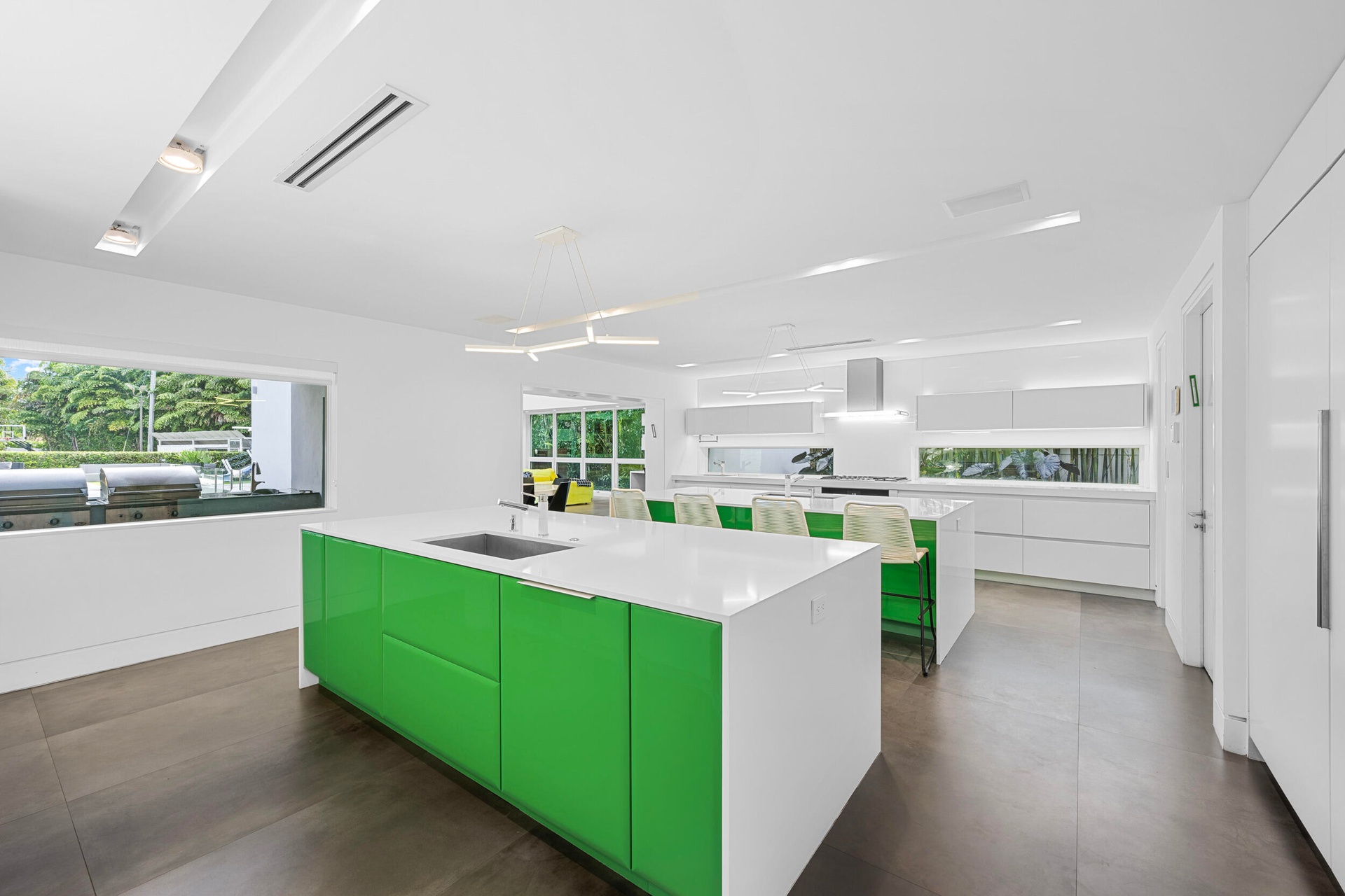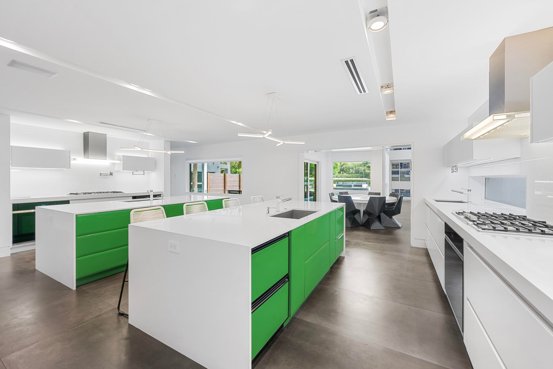 Designed to impress, the open floor plan is flooded with natural light, featuring soaring ceilings, impact windows throughout, and exquisite designer finishes. At the heart of the home, the gourmet kitchen is a chef's dream, equipped with stainless steel appliances, three Wolf ovens, three dishwashers, three sinks, two gas ranges, and sleek stone countertops. Seamlessly flowing into the expansive living area, this space is perfect for both entertaining and everyday relaxation.