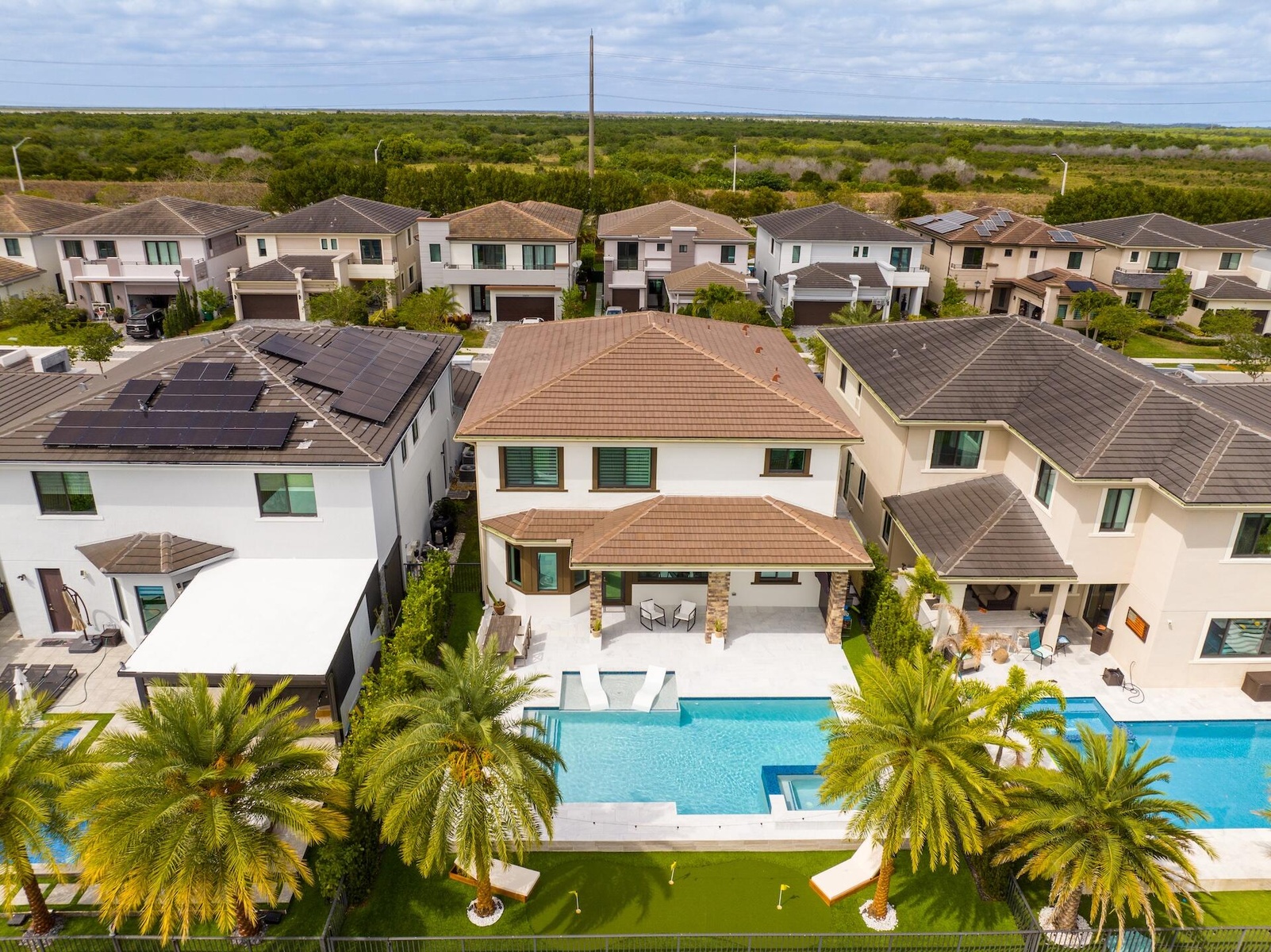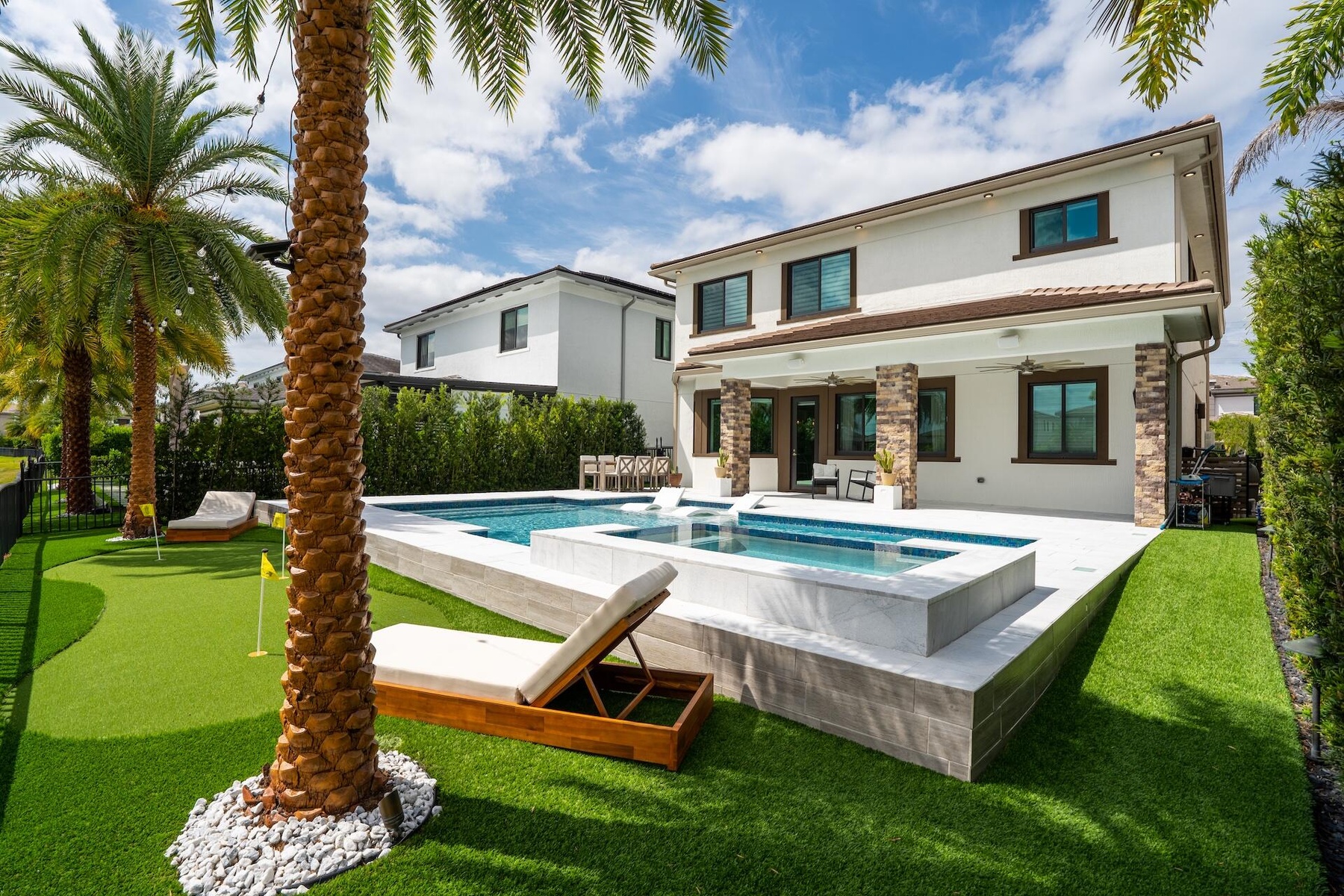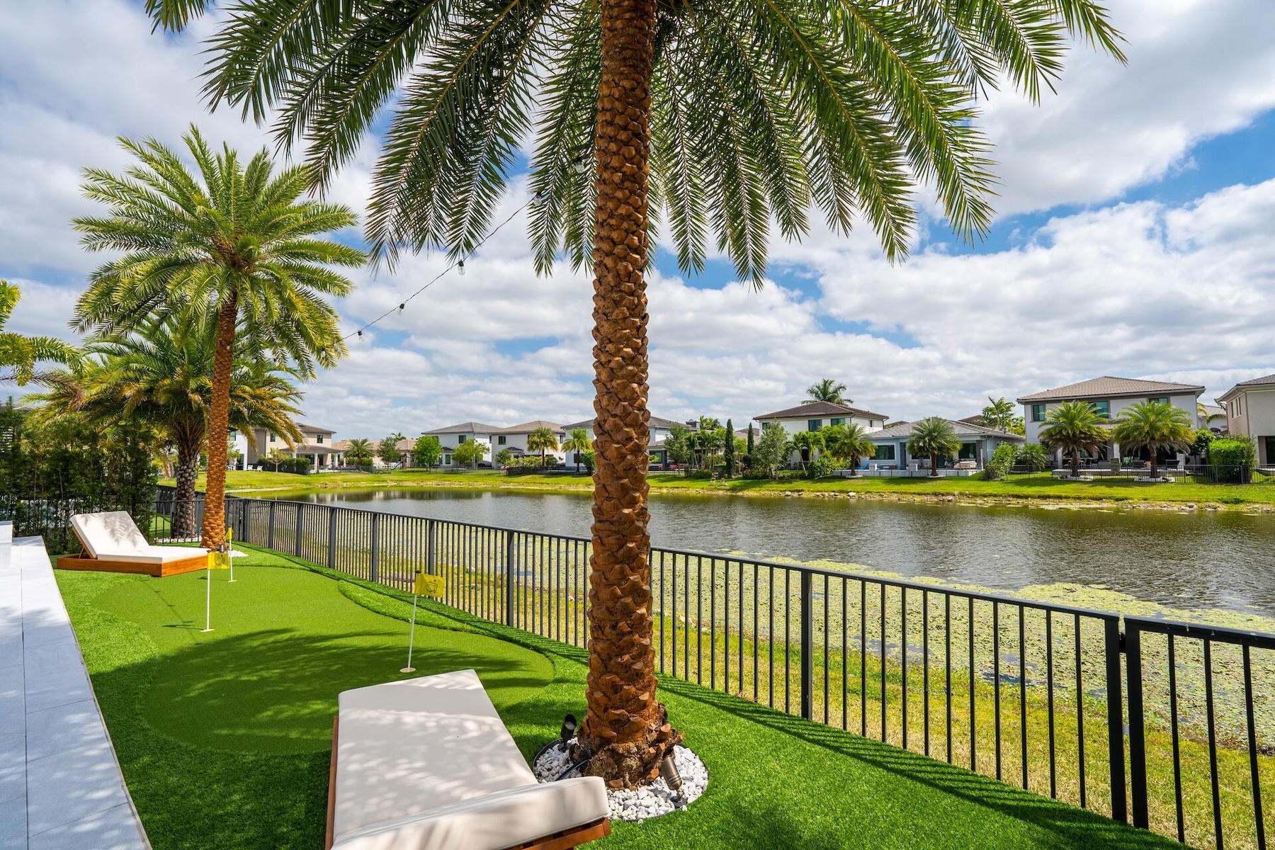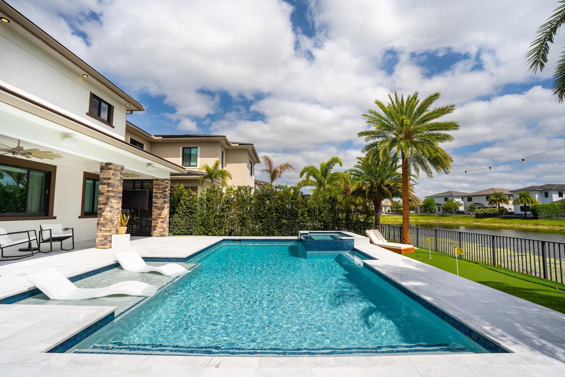 Exquisite Emerald model in prestigious Cascata at MiraLago. 5-bedroom, 4-bath residence showcases soaring ceilings, elegant open layout, and tranquil lakefront views, with a convenient first-floor bedroom. The gourmet kitchen features upgraded cabinetry, quartz countertops with full backsplash, snack-bar seating, and poolside dining. Refined interiors include crown molding, designer finishes, and Restoration Hardware chandeliers in the formal living and dining rooms. Enjoy a private gas-heated pool and oversized spa framed by crystal white sandblasted marble pavers, turf, and lush landscaping with Sylvester palms plus a personal putting green. Hurricane-impact windows, custom stone fireplace wall, flex storage with sink and cabinetry, and an expansive balcony. A rated schools and amenities