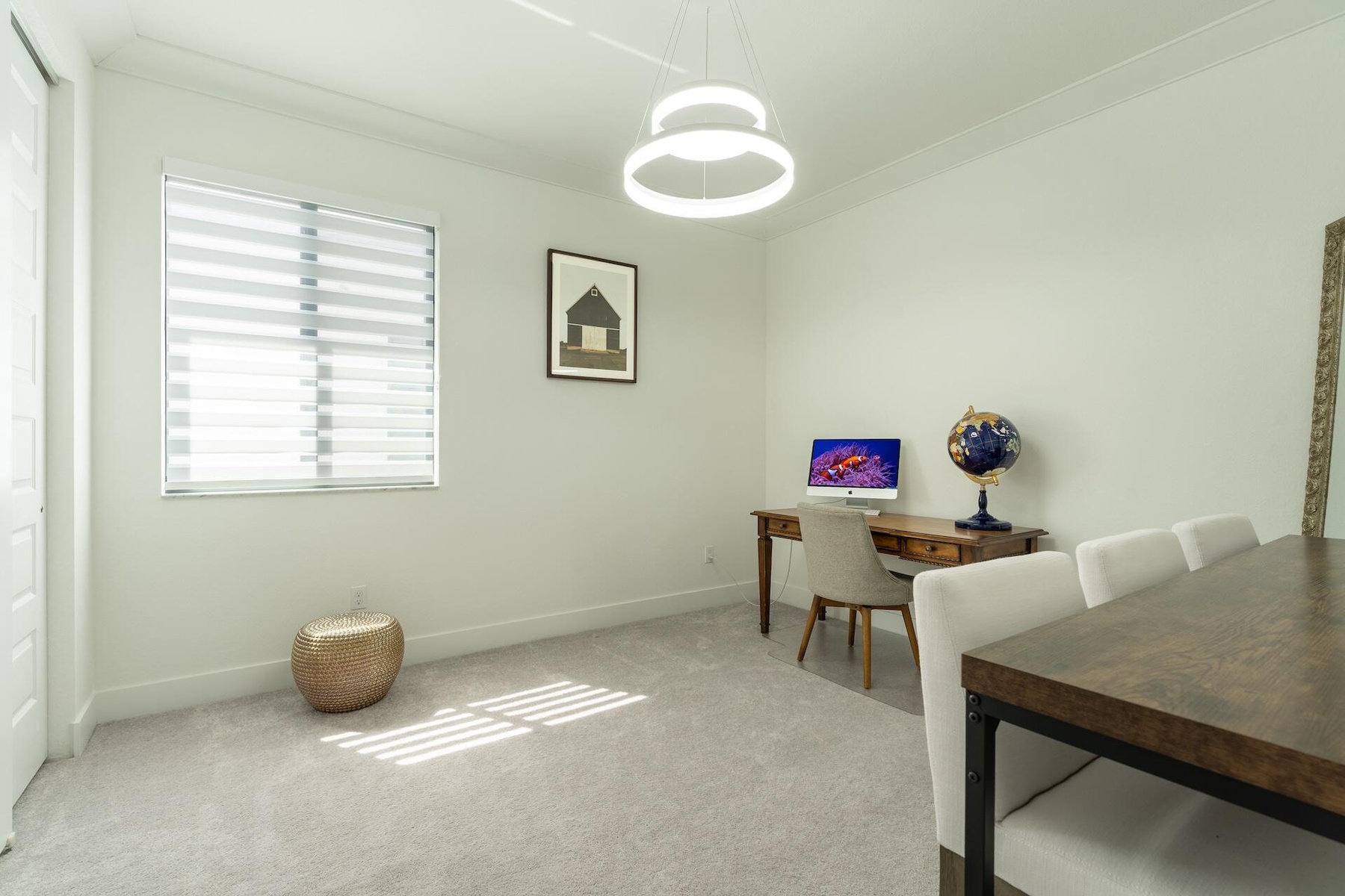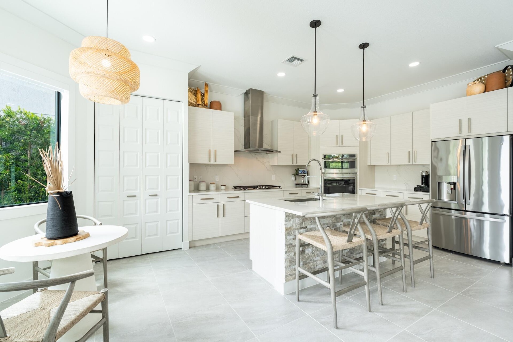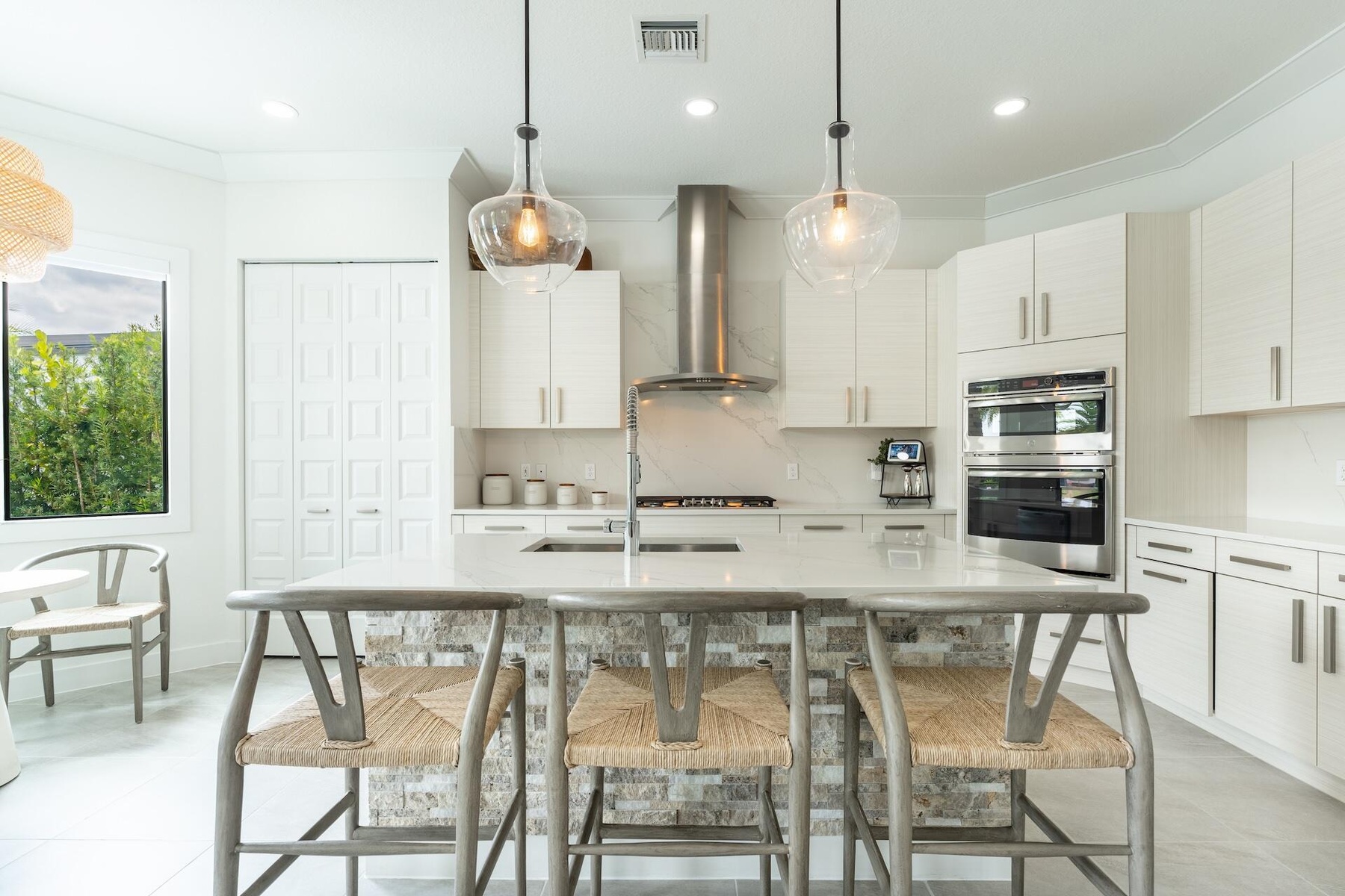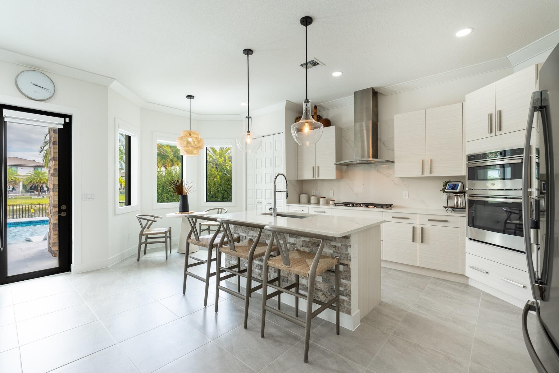 Exquisite Emerald model in prestigious Cascata at MiraLago. 5-bedroom, 4-bath residence showcases soaring ceilings, elegant open layout, and tranquil lakefront views, with a convenient first-floor bedroom. The gourmet kitchen features upgraded cabinetry, quartz countertops with full backsplash, snack-bar seating, and poolside dining. Refined interiors include crown molding, designer finishes, and Restoration Hardware chandeliers in the formal living and dining rooms. Enjoy a private gas-heated pool and oversized spa framed by crystal white sandblasted marble pavers, turf, and lush landscaping with Sylvester palms plus a personal putting green. Hurricane-impact windows, custom stone fireplace wall, flex storage with sink and cabinetry, and an expansive balcony. A rated schools and amenities