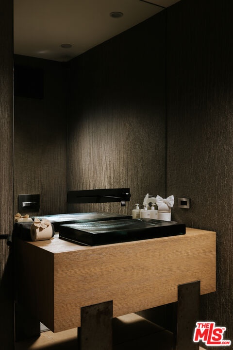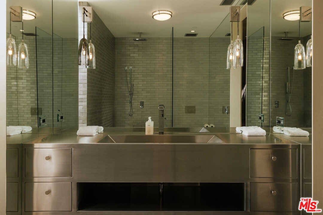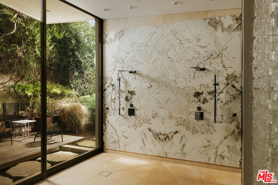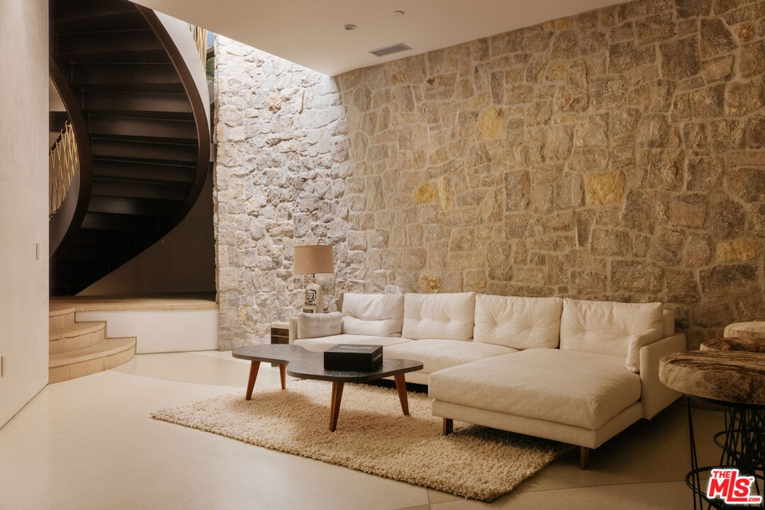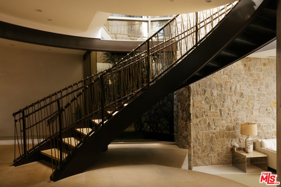 Defined by its striking use of stone and glass, juxtaposed against the dramatic backdrop of the city, The Bayou House, located in the famed Bird Streets, is a thoughtfully executed modern retreat by multidisciplinary designer Bradley Bayou. Completed in 2015, the home provides an unparalleled approach to craftsmanship, security, and functionality. Set behind a gated entry with mature hedges, feel welcomed home to a sense of privacy and effortless peace. A striking round entry with a glass ceiling, complete with a unique suction elevator, flows seamlessly to the formal living room. With floor to ceiling retractable glass walls on either side, the room beautifully showcases the home's infinity pool and manicured grounds. Back through the distinctive foyer sits the kitchen, complete with Miele appliances, its adjoining family room, featuring a two-sided gas fireplace and access to an additional courtyard, and the dining room. The wood and stone accents continue throughout the interior, as the sanctuary unfolds into the primary retreat. A serene ambiance is set by an additional fireplace, continued retractable glass walls, dual walk-in closets, and a spa-like bathroom. Two additional guest suites and a powder room sit on the main level. Descend down the grand, arched stairway to a lounge and bar area, a private theater room, the remaining two guest suites, a laundry room, and access to the subterranean 4-car garage. The home is complete with a Savant smart-home automation system, a gated driveway, and gated street entry. All of this, nestled in an iconic location just above the Sunset Strip in the prestigious Doheny Estates neighborhood.