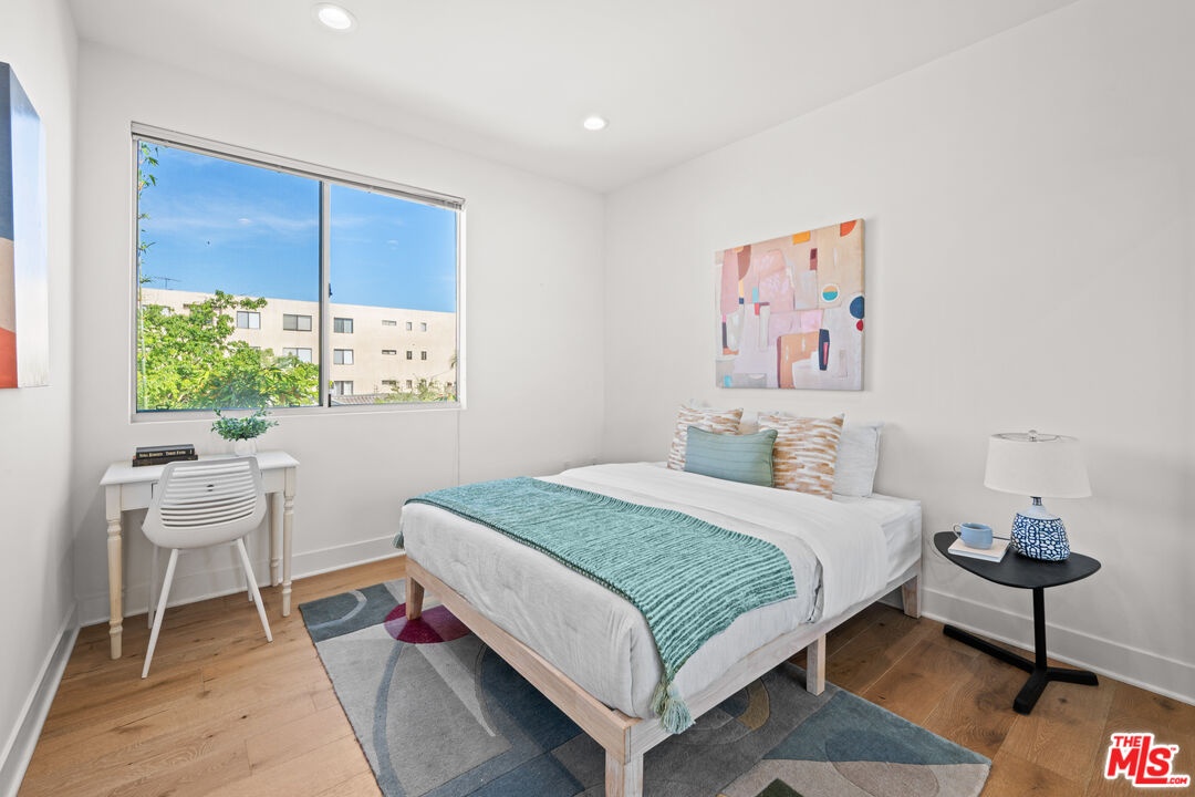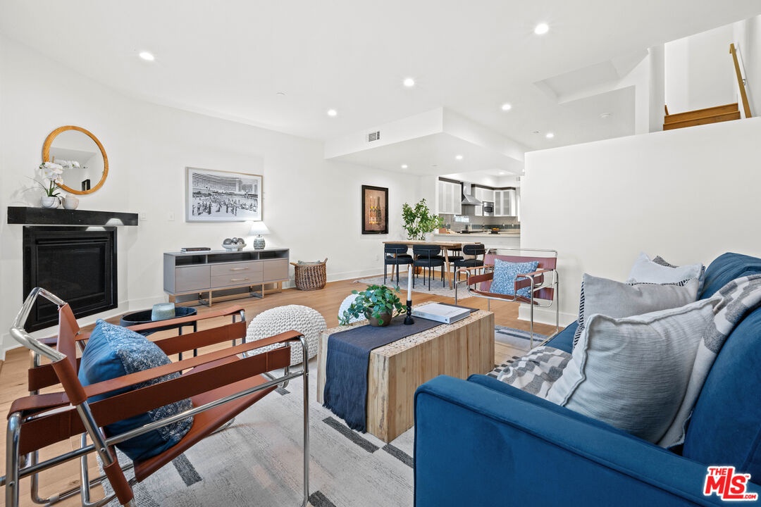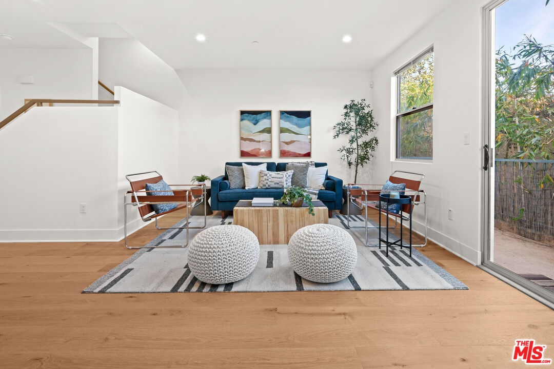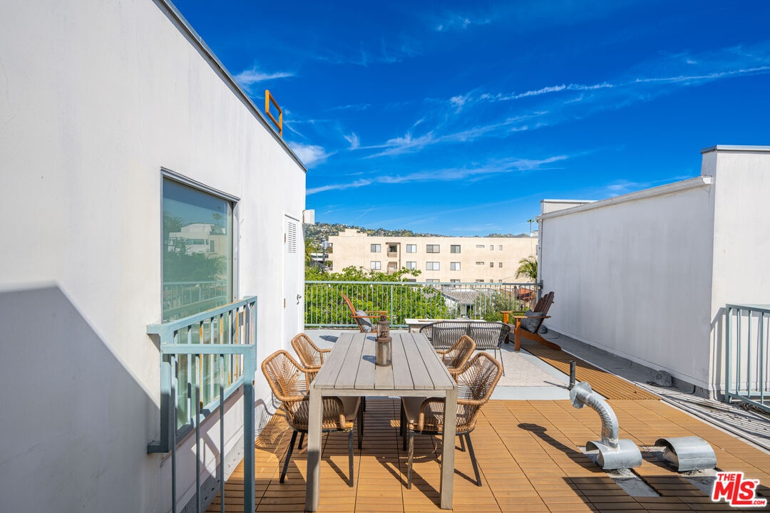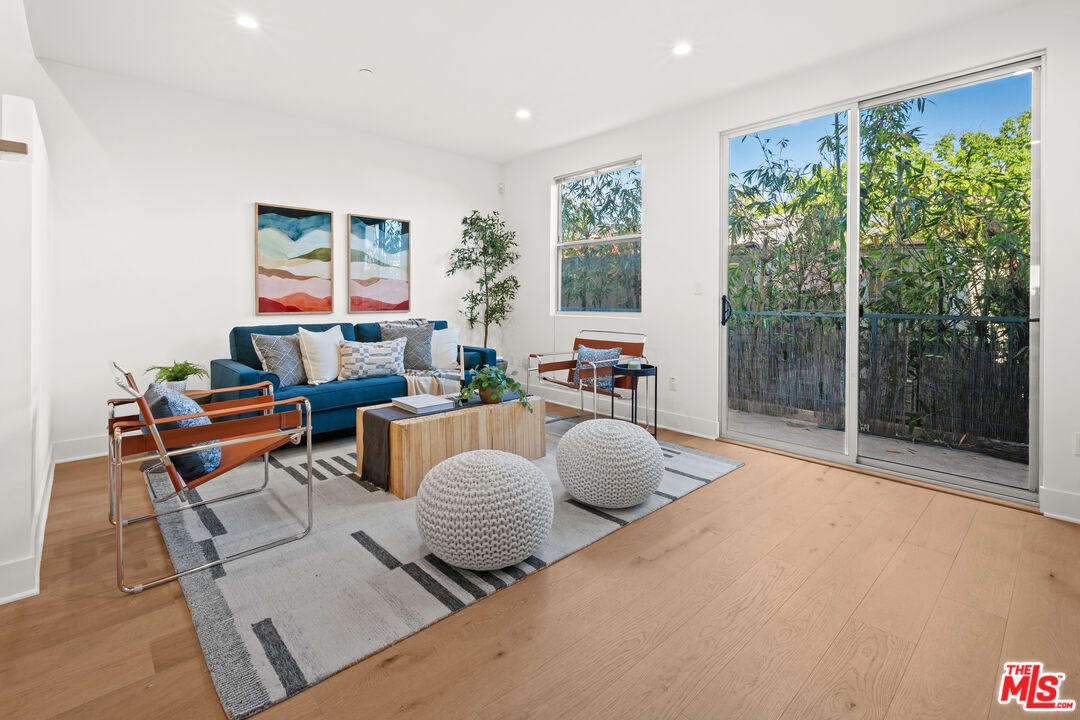 Contemporary townhouse built in 2011, located in an intimate 6-unit building in the heart of Beverly Grove an unbeatable location with a Walk Score of 94. This home is truly a neighborhood gem, offering modern luxury, high-end amenities, and timeless charm. This 3BR + office, 2.5BA residence has it all: a sleek modern kitchen with Viking range and quartz stone counters, an open floor plan with wide-plank white oak floors, and a cozy bar/den area perfect for entertaining. The primary suite features dramatic 20-foot ceilings and an en-suite bathroom with dual sinks, separate soaking tub, and shower. Two additional bedrooms are conveniently located on the same level, along with a second full bath and washer/dryer. Upstairs, a loft/office leads to an expansive 600+ sq ft private rooftop deck equipped with custom lighting, sound system, upgraded flooring, BBQ, fridge, dining area, gas firepit, outdoor movie theater with high-definition projector, plus incredible views of the Hollywood Hills (unlike other units in the building). The home has been recently finely remodeled with new hardwood floors replacing prior carpet and energy-efficient LED lighting throughout. Set in a highly walkable neighborhood, you can enjoy shopping, dining, errands, local parks, and vibrant cafes all just seconds away. Friendly neighbors and a strong community vibe make this home not just beautiful, but truly welcoming. Don't miss this exceptional opportunity to experience modern comfort, style, and convenience in one of LA's most desirable locations.