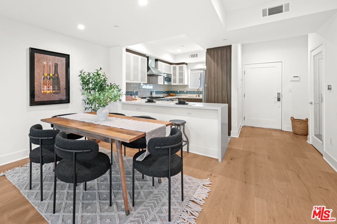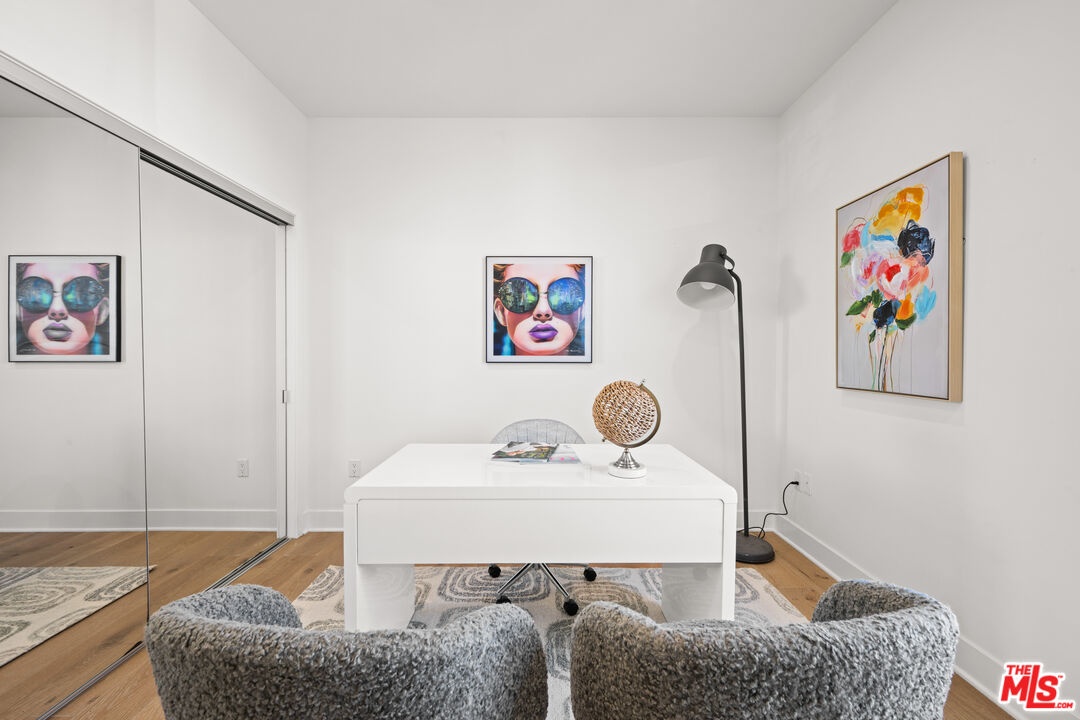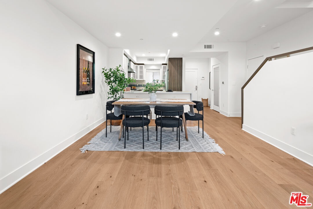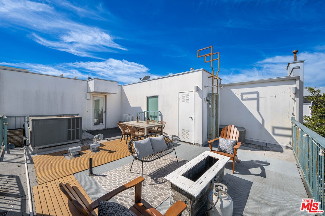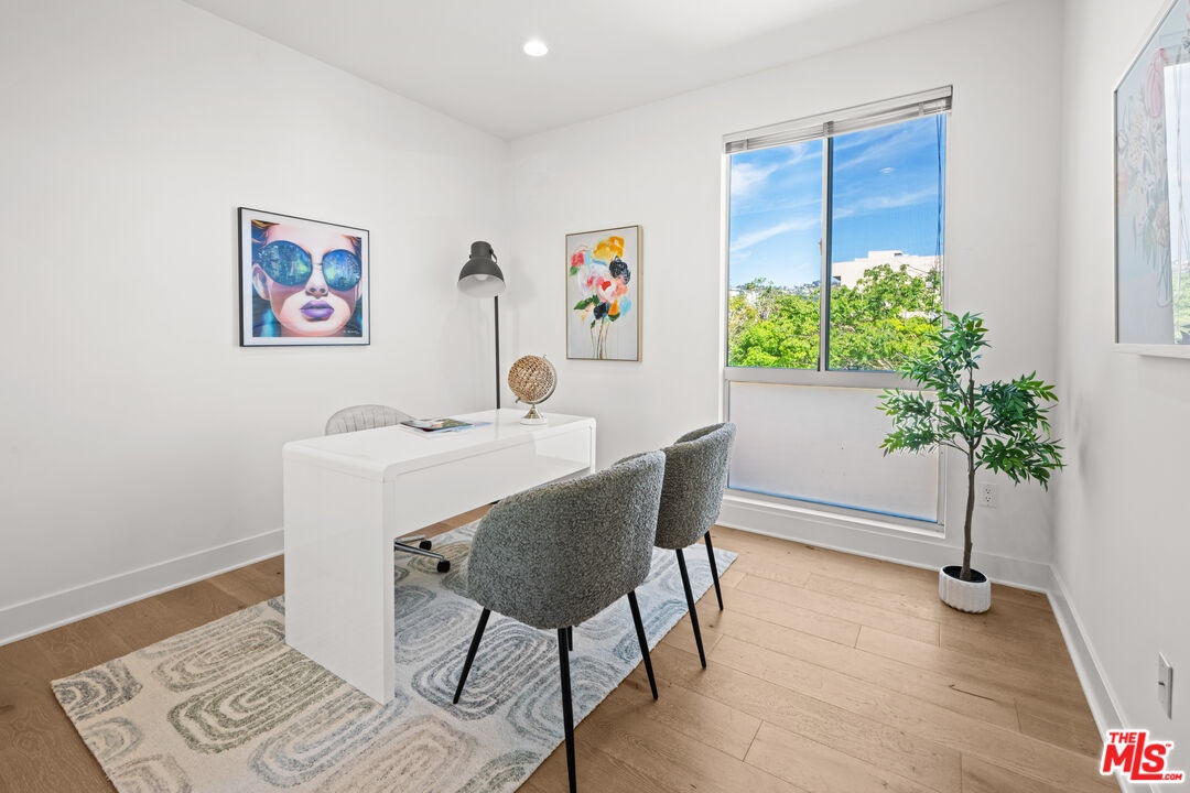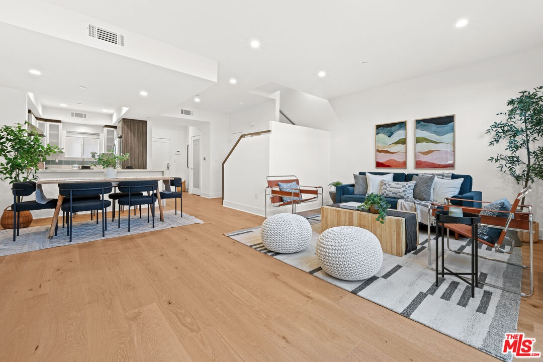 Contemporary townhouse built in 2011, located in an intimate 6-unit building in the heart of Beverly Grove an unbeatable location with a Walk Score of 94. This home is truly a neighborhood gem, offering modern luxury, high-end amenities, and timeless charm. This 3BR + office, 2.5BA residence has it all: a sleek modern kitchen with Viking range and quartz stone counters, an open floor plan with wide-plank white oak floors, and a cozy bar/den area perfect for entertaining. The primary suite features dramatic 20-foot ceilings and an en-suite bathroom with dual sinks, separate soaking tub, and shower. Two additional bedrooms are conveniently located on the same level, along with a second full bath and washer/dryer. Upstairs, a loft/office leads to an expansive 600+ sq ft private rooftop deck equipped with custom lighting, sound system, upgraded flooring, BBQ, fridge, dining area, gas firepit, outdoor movie theater with high-definition projector, plus incredible views of the Hollywood Hills (unlike other units in the building). The home has been recently finely remodeled with new hardwood floors replacing prior carpet and energy-efficient LED lighting throughout. Set in a highly walkable neighborhood, you can enjoy shopping, dining, errands, local parks, and vibrant cafes all just seconds away. Friendly neighbors and a strong community vibe make this home not just beautiful, but truly welcoming. Don't miss this exceptional opportunity to experience modern comfort, style, and convenience in one of LA's most desirable locations.