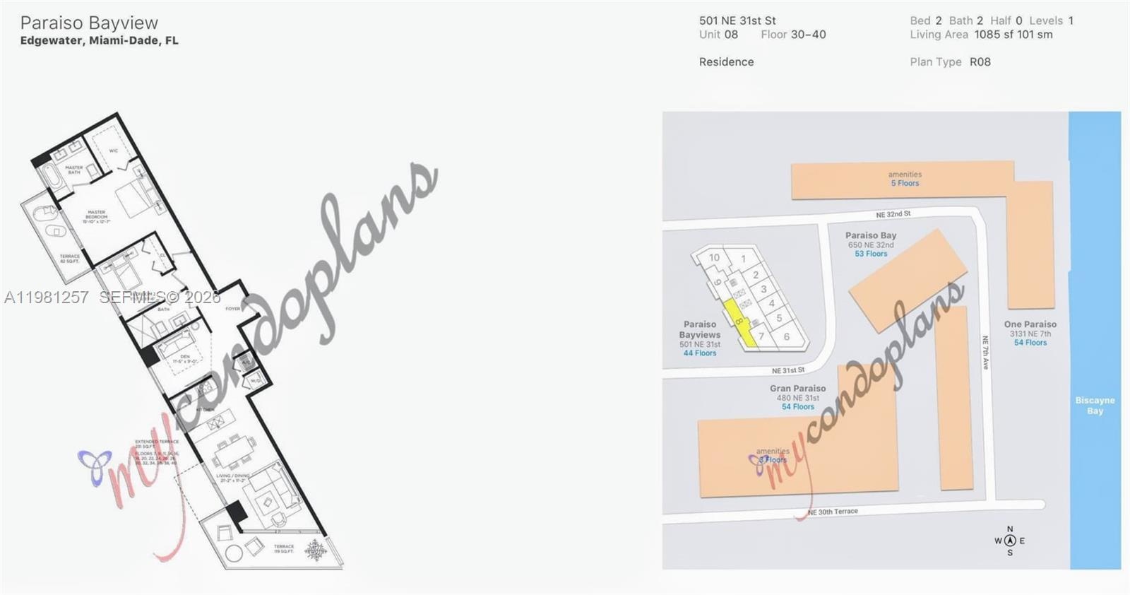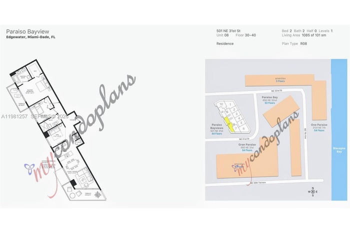 Spacious 1,085 sq ft high-floor residence on the 32nd floor of a 46-story tower with spectacular water, bay, and skyline views at Paraiso Bayviews in the highly desirable Edgewater neighborhood. This sun-filled 2-bedroom, 2-bath + DEN unit features southwest exposure, offering beautiful natural light and sunset views over Biscayne Bay and the Miami skyline.