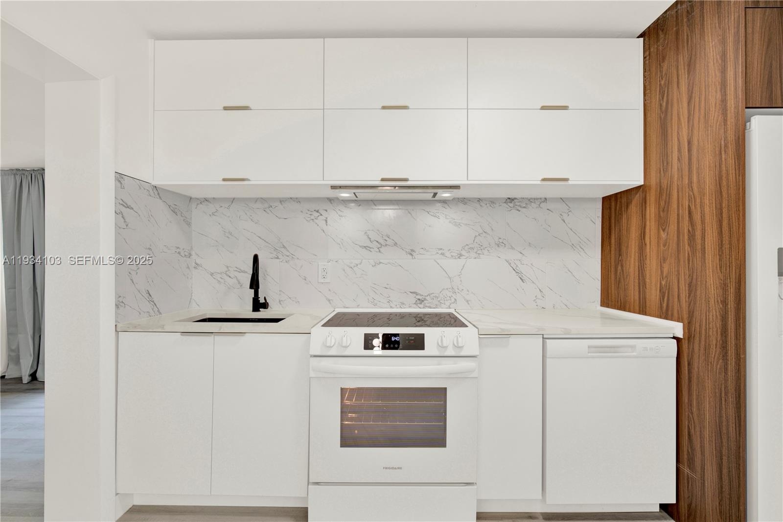 Step inside to an open and airy layout flooded with natural light, featuring luxury vinyl plank flooring throughout, neutral color palettes, and high-end finishes that blend modern elegance with everyday functionality. The chef-inspired kitchen boasts sleek white cabinetry, premium marble-look quartz countertops and backsplash, stainless steel appliances (including a Frigidaire range and dishwasher), and ample storage – ideal for entertaining or casual meals. Adjacent dining and living areas flow seamlessly, with stylish accents like abstract wall art, a contemporary chandelier, and wood-paneled features adding warmth and sophistication.