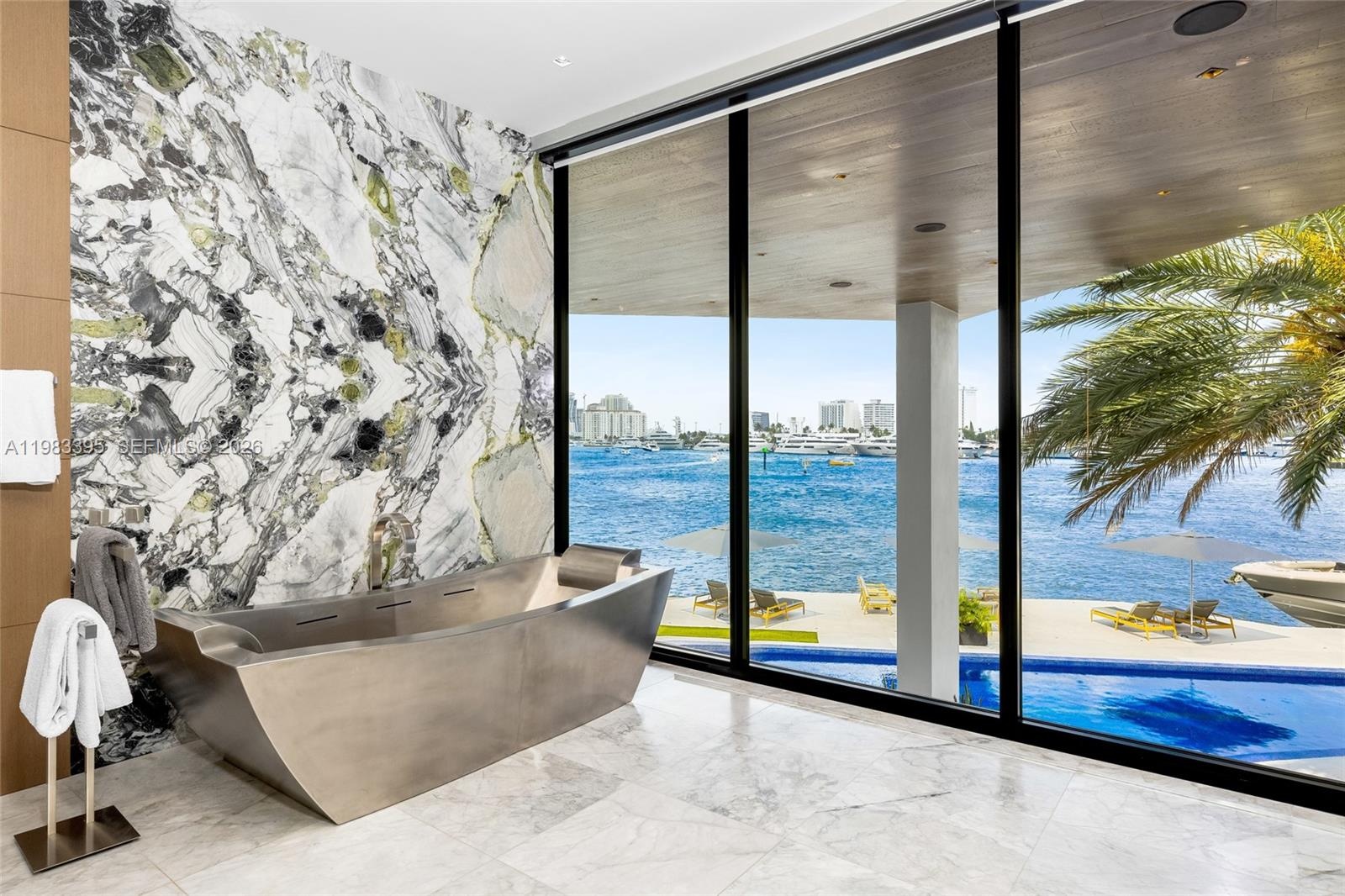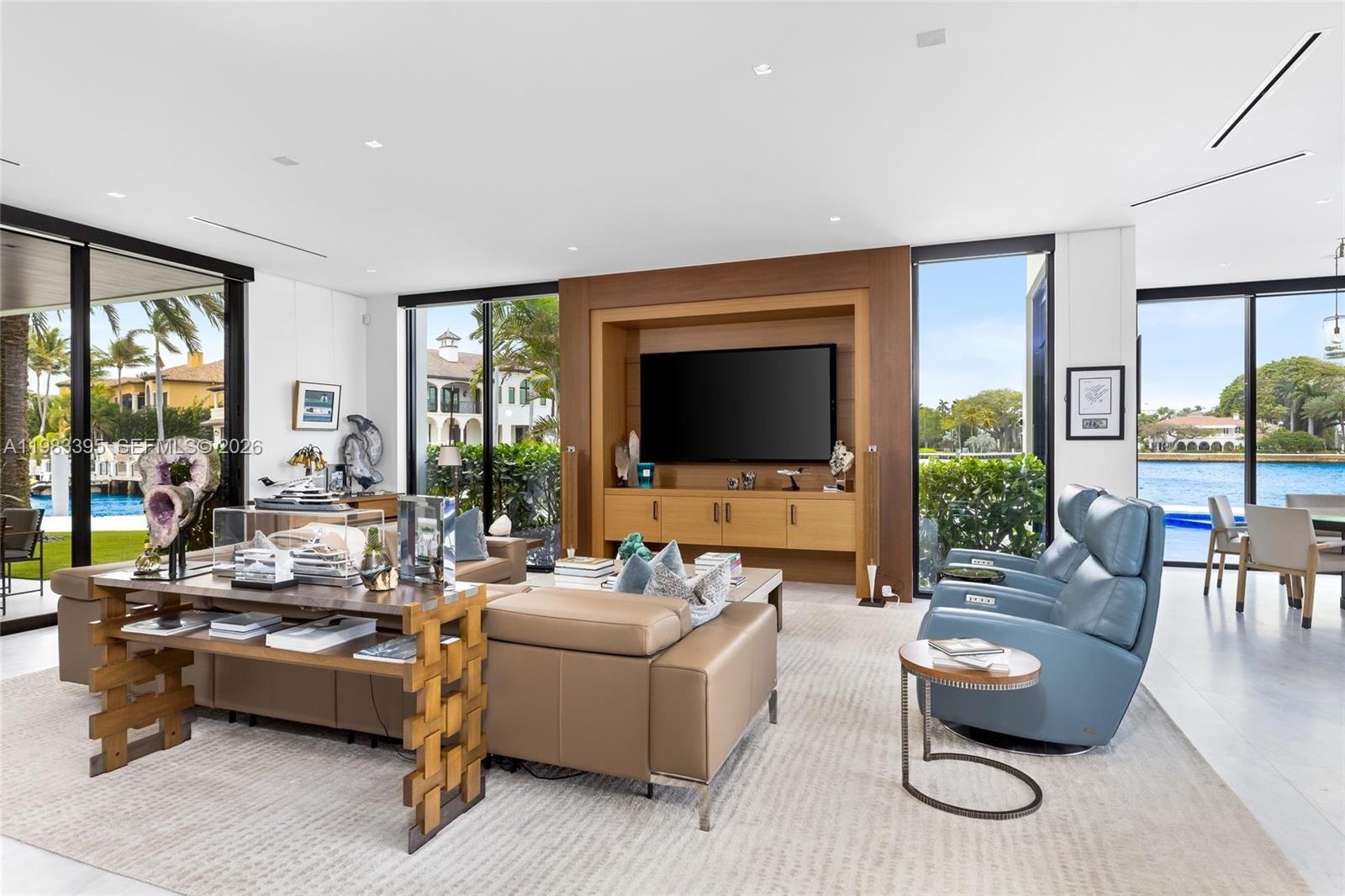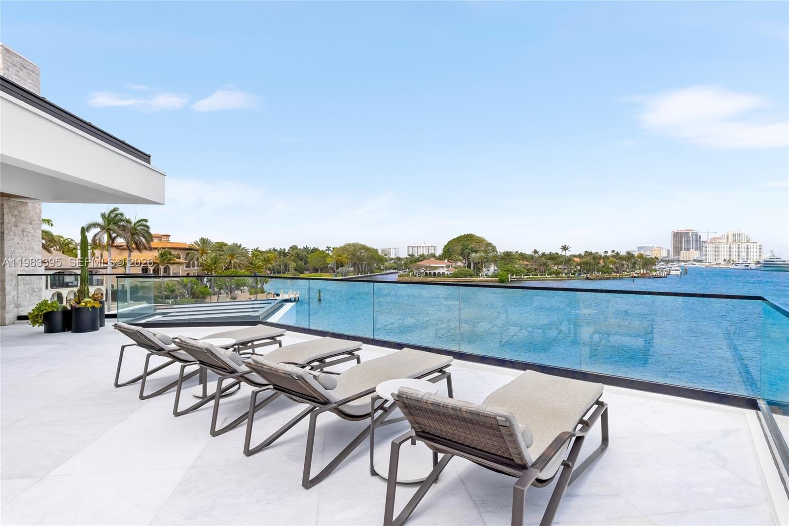 A dramatic third-floor lounge captures sweeping Intracoastal views, creating an ideal setting for entertaining or relaxed evenings overlooking the water. Walls of glass and expansive terraces enhance the connection between the interiors and the surrounding waterfront.