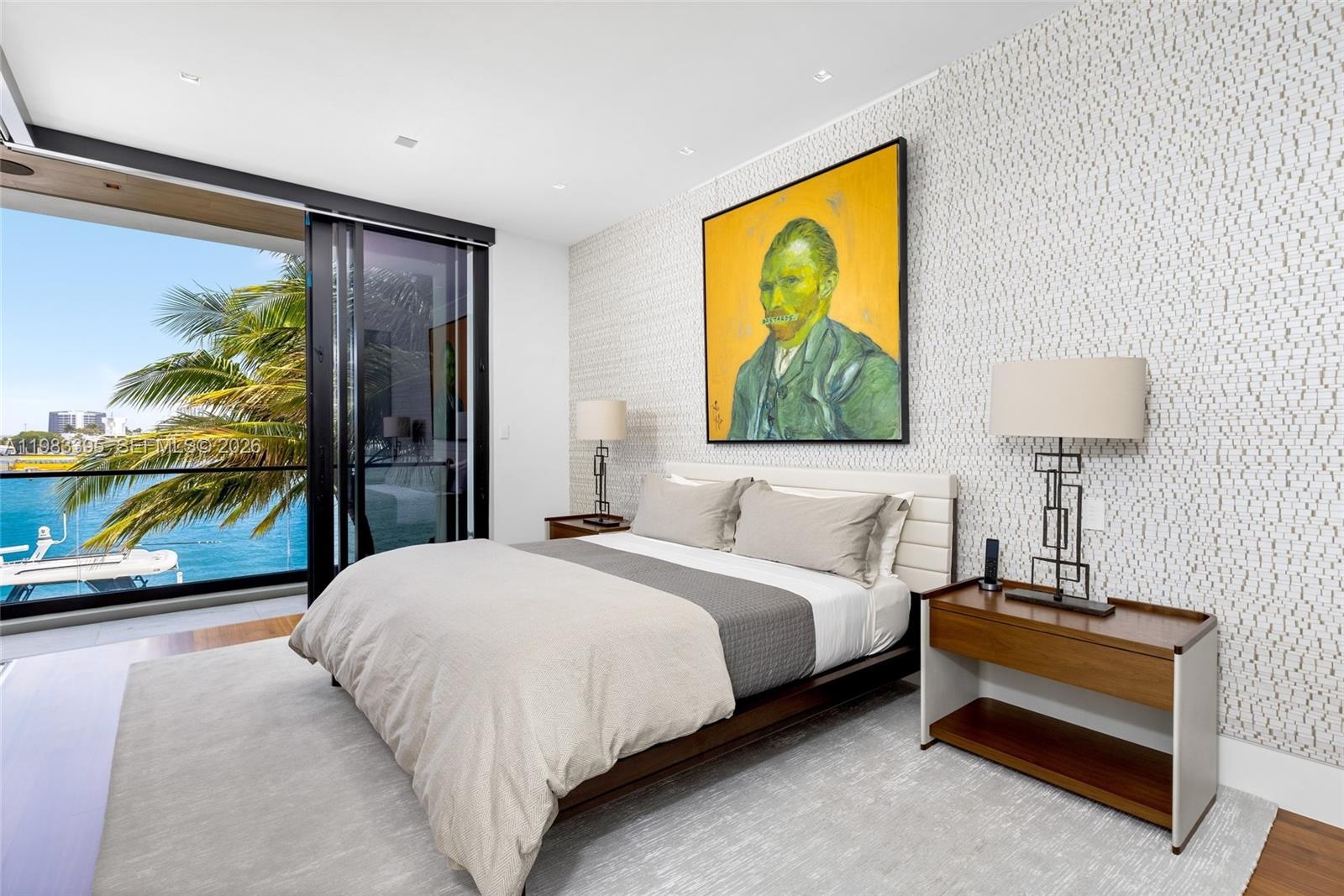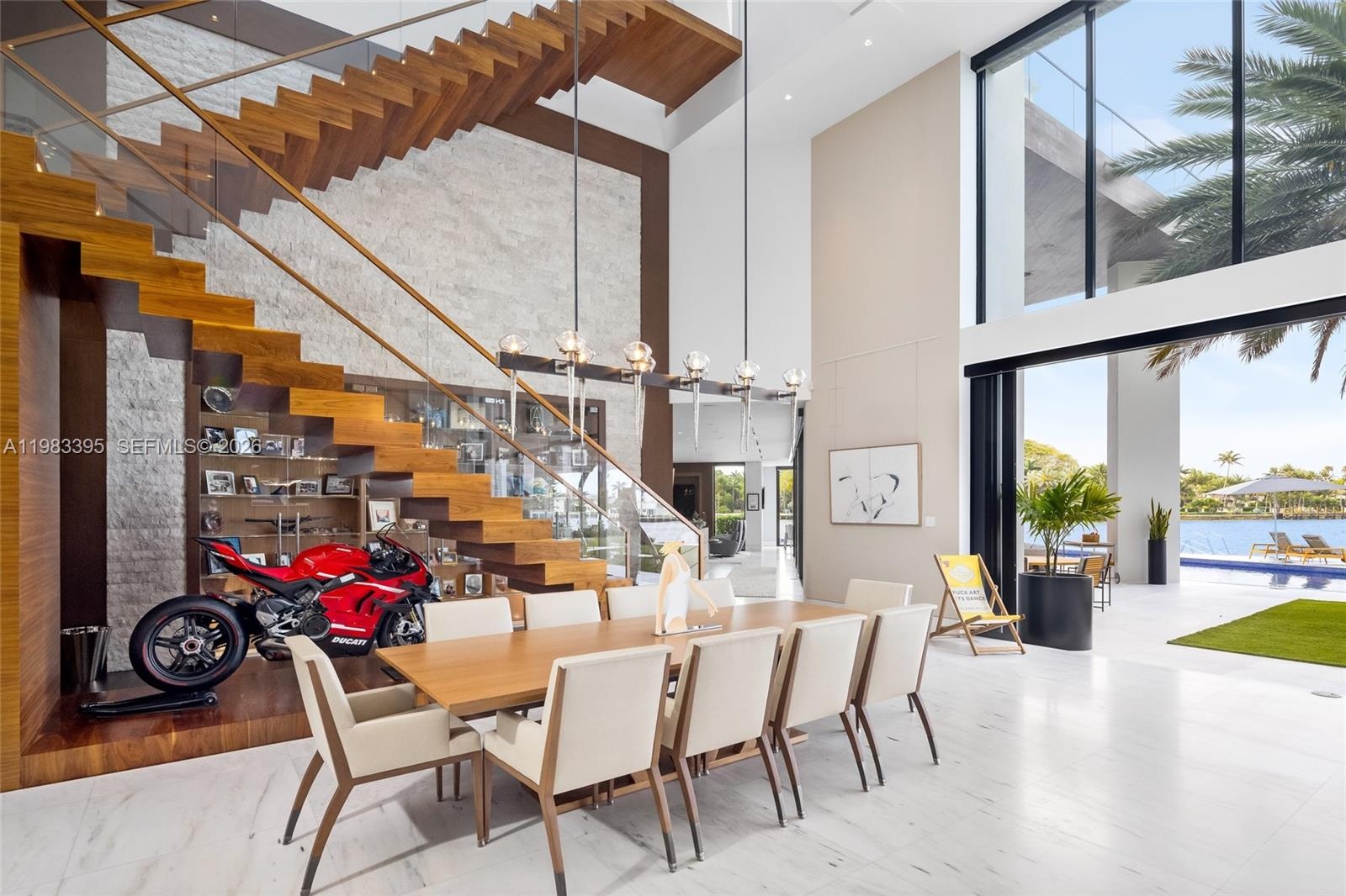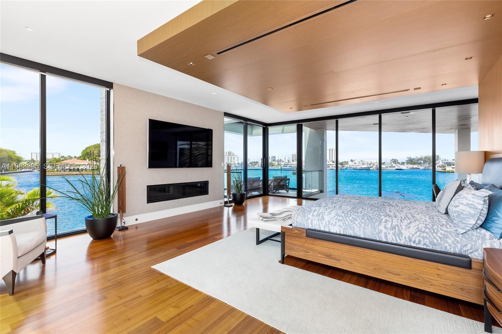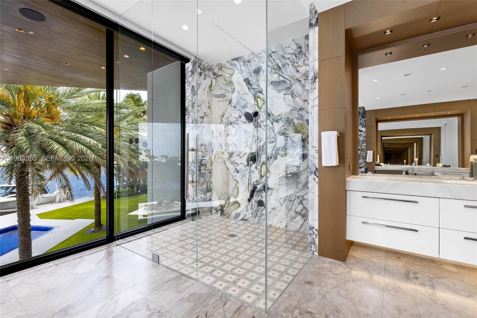 A dramatic third-floor lounge captures sweeping Intracoastal views, creating an ideal setting for entertaining or relaxed evenings overlooking the water. Walls of glass and expansive terraces enhance the connection between the interiors and the surrounding waterfront.