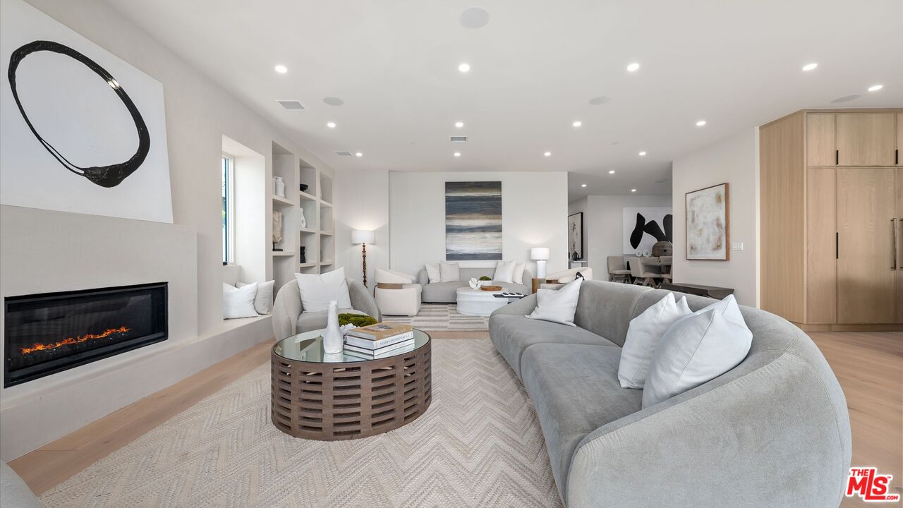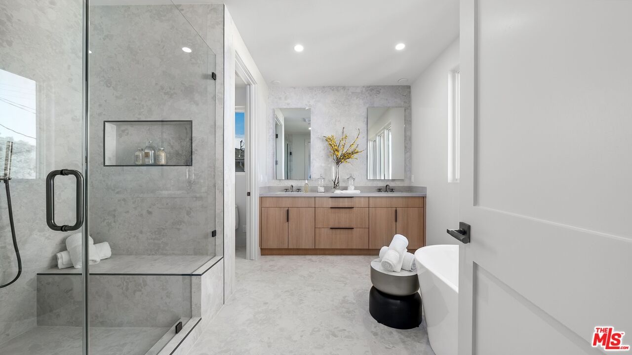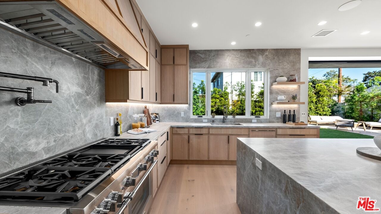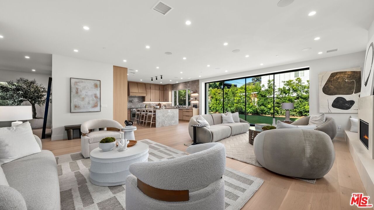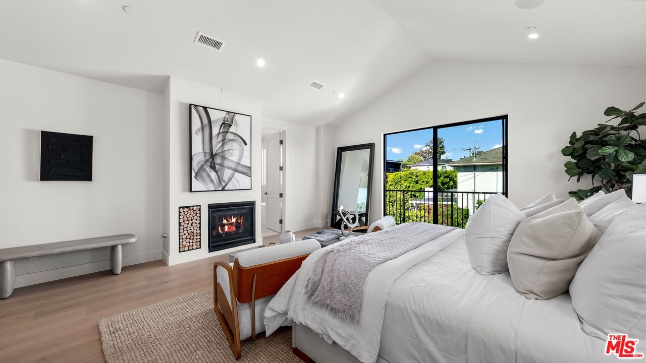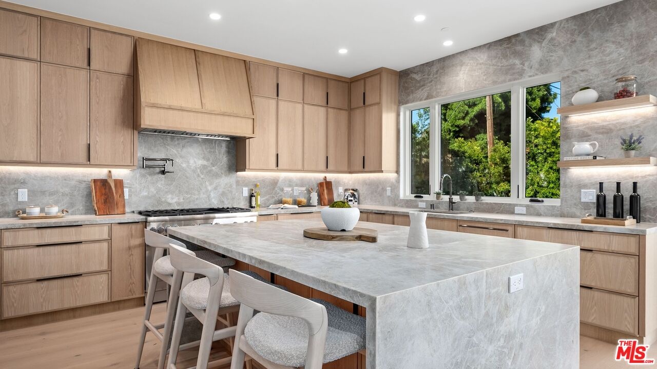 This newly constructed modern residence in the heart of prime Mar Vista offers approximately 4,134 square feet of refined living space with 5 bedrooms and 4.5 baths, blending clean contemporary design with warm, elevated finishes. Sun-filled open living spaces are framed by expansive windows and dramatic Fleetwood pocket doors, creating seamless indoor-outdoor flow that embodies the quintessential California lifestyle. A thoughtfully designed mudroom-style entry closet adds both style and everyday functionality. At the center of the home, the chef's kitchen showcases stunning Taj Mahal quartzite, custom rift oak cabinetry, and top-of-the-line Thermador appliances, complemented by a sleek butler's pantry for effortless entertaining. Natural stone finishes continue throughout the spa-inspired bathrooms, adding a sense of understated luxury. An elegant dining area flows into the spacious family room, highlighted by custom plaster built-in shelving and integrated audio. Built-in speakers extend throughout the home, enhancing both daily living and entertaining. A private main-level guest suite provides ideal flexibility for visitors, a home office, or multi-generational living. Upstairs, the luxurious primary suite features vaulted ceilings, a spa-like bath with an oversized walk-in shower, a custom walk-in closet, and beautifully curated finishes. Outdoor living areas are designed for year-round enjoyment with inviting lounge spaces, while wired security cameras offer added peace of mind. Ideally located just minutes from Venice, Abbot Kinney Boulevard, Santa Monica, and Culver City, as well as Mar Vista's popular dining and shopping destinations, this exceptional residence offers the perfect blend of modern design, comfort, and Westside convenience.