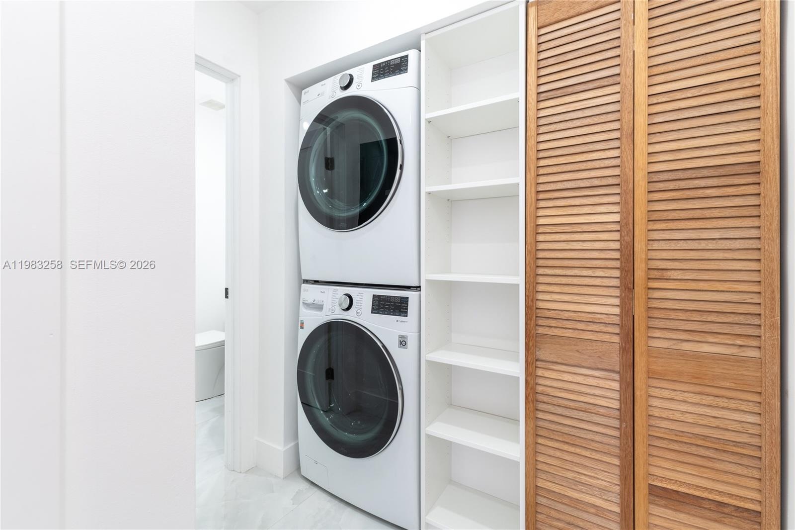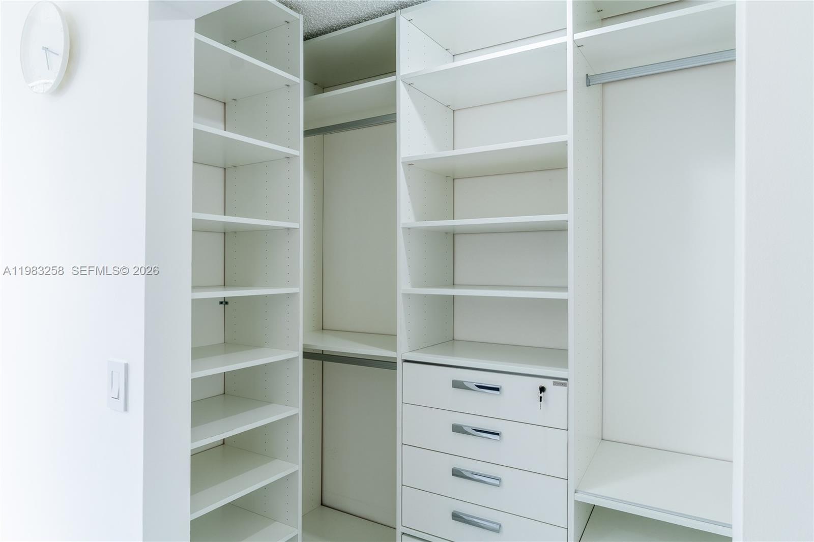 Upstairs, the spacious primary suite features a walk-in closet with custom-built cabinetry designed to provide ample storage and organization.