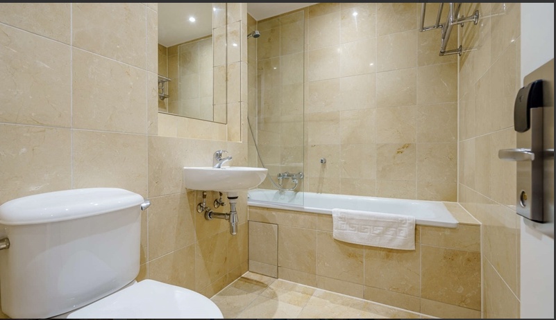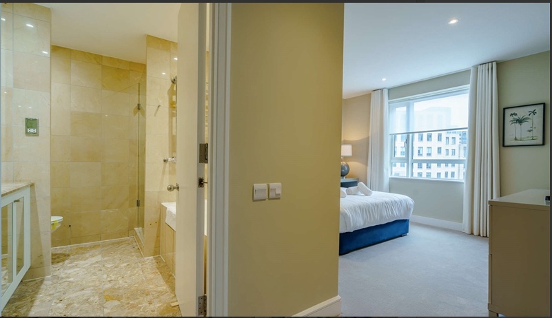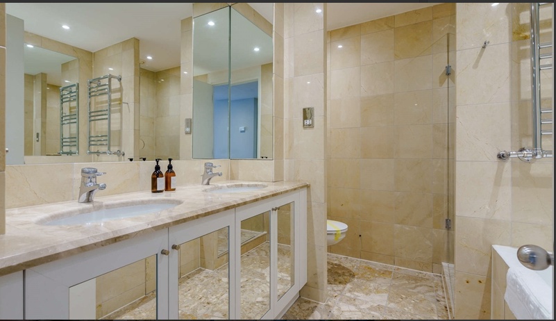 The primary bedroom benefits from a marble en-suite bathroom and an family bathroom in the apartment.