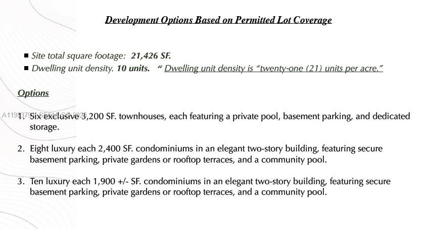 LAND DEVELOPMENT OPPORTUNITY Huge upside through the New Development up to 10 VILLAS or T Homes Development Options Based on Permitted Lot Coverage Site total square footage 21, 426 SF.