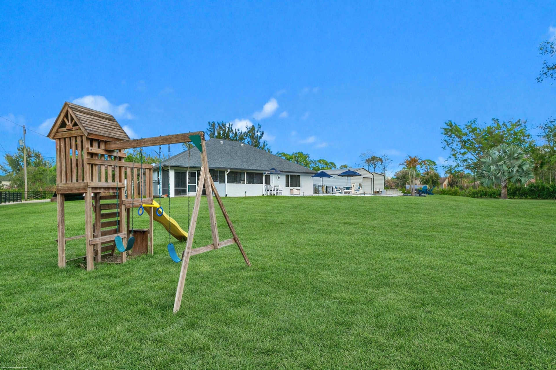 Stunning home with end-of-street location on 1.3 acres! This updated home is in move-in condition and features new tile flooring, granite counters, and a spacious primary suite with an updated bathroom with quartzite counters, new tile, & shiplap walls. A 2020 addition created a large play/flex room and attached air-conditioned garage. Enjoy outdoor living with a heated pool and expansive patio built in 2022, along with a covered and screened patio with built-in summer kitchen. The property also features a fenced backyard & detached metal storage building/garage w/ side carport, perfect for your workshop, vehicles, or toys. The roof was replaced in 2021 & the driveway was widened for additional parking. All this, plus a fenced grass dog-paddock to enjoy with your 4-legged family members! Home features: Granite & stone counters, new tile floors throughout, roman tub, formal dining room, and living room with electric fireplace. Open floorplan with large family room off the kitchen area. Large covered & screened patio with summer kitchen with a sink, bbq, & refrigerator. Tankless hot-water heater. Playroom with mini-split AC, 5-Ring Cameras. All wall mounted flat screen TV's, sound bars and swing set convey. 35' x 24' Metal storage building with 3-garage doors (10' x10') with attached 35' x 12' lean-to, perfect for covered RV or boat parking. New pool in 2022 with electric heat & chlorination. New Roof in 2021 - asphalt shingle. Addition of garage in 2020. Exclusions: camouflaged playset, Flat-screened TV in primary bedroom & Firepit.
