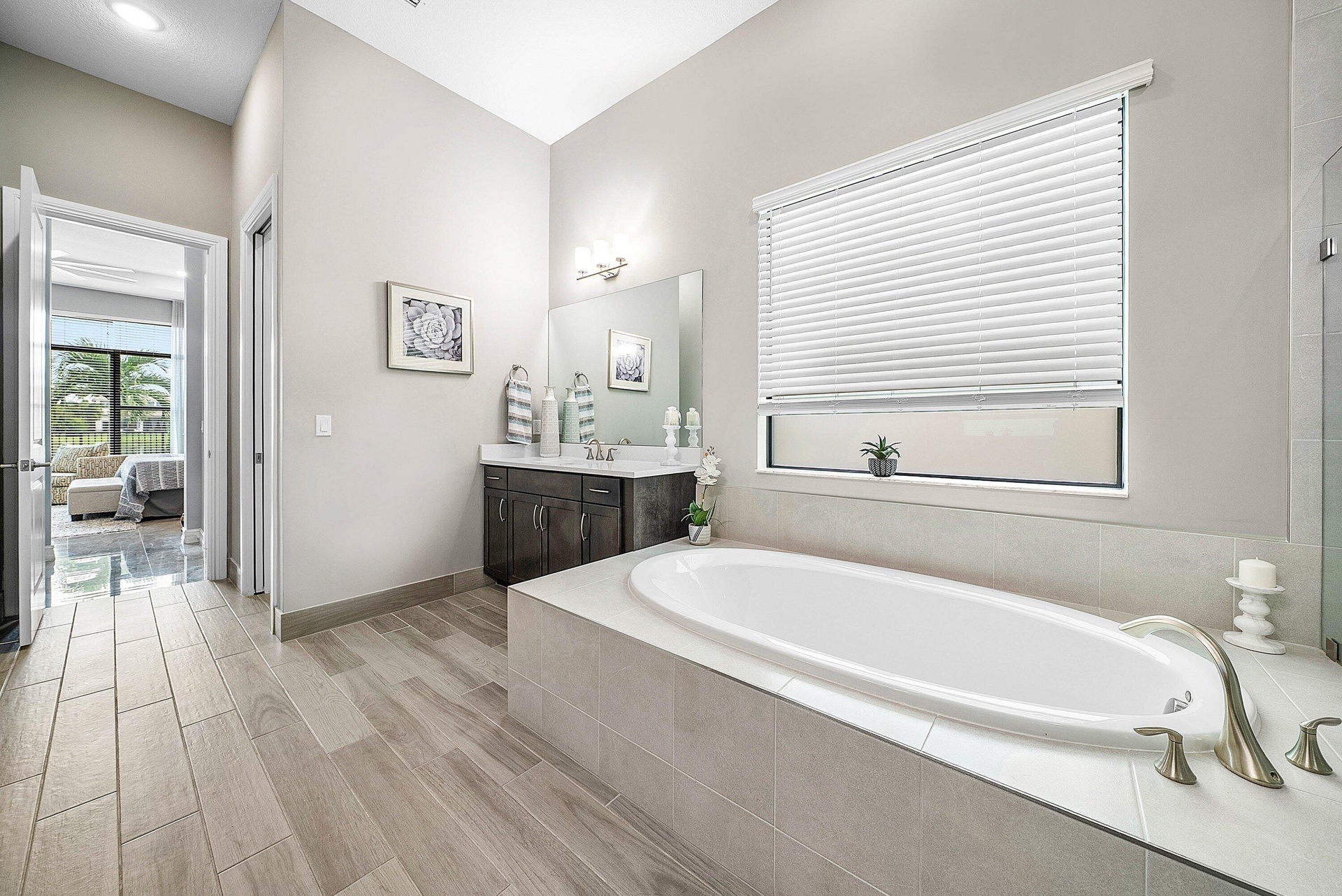 Elegantly upgraded stunning lakefront home impresses from the moment you step inside w/t soaring 20ft foyer & elevated ceilings. Gourmet chef's kitchen boasts a gas cooktop, wall oven, walk-in pantry & designer lighting. The expanded ground-floor master suite features serene lake views, custom walk-in closets and & luxurious spa-inspired bath. Upstairs offers a spacious loft & 2 bedrooms/2 baths. Additional highlights include full house generator, impact windows, retractable screen, custom closets, whole house water filtration, overhead garage storage & more. Palm Meadows is a guard-gated community offering resort-style amenities: clubhouse, fitness center, aerobic room, pool/hot tub, kiddie pool, splash zone, playroom, tennis, pickleball, indoor basketball, playground & covered BBQ area.