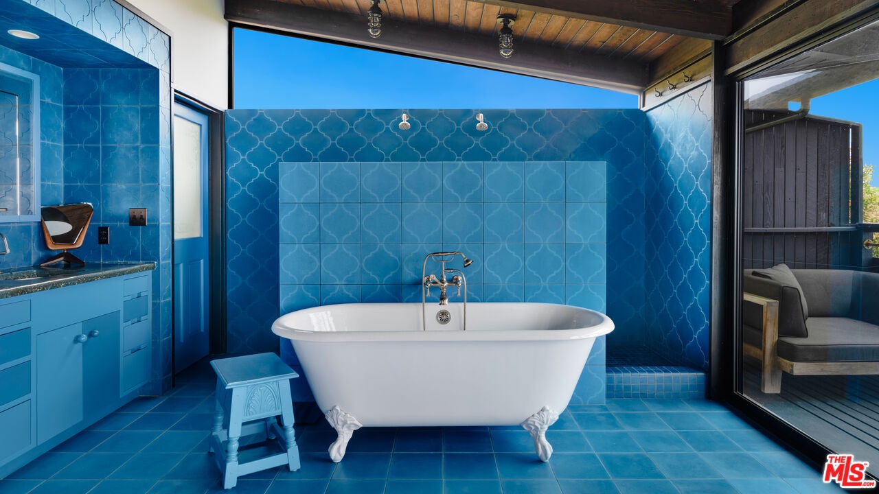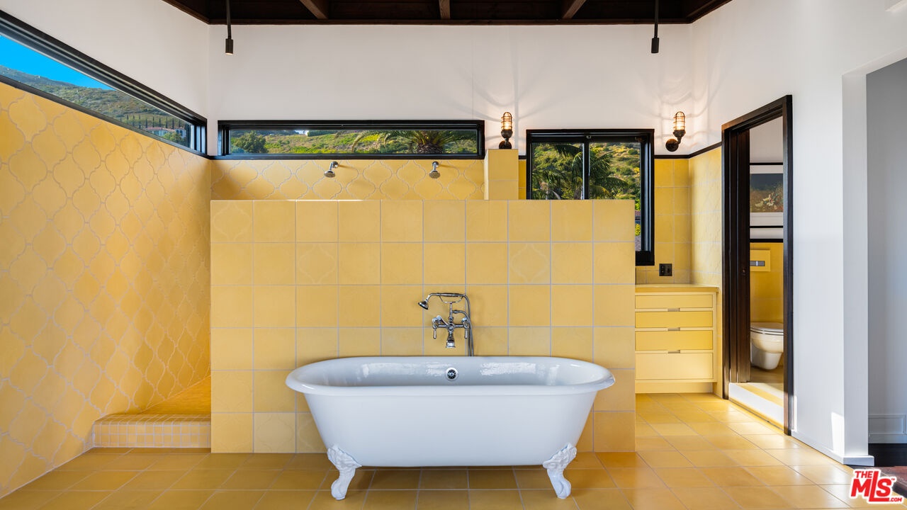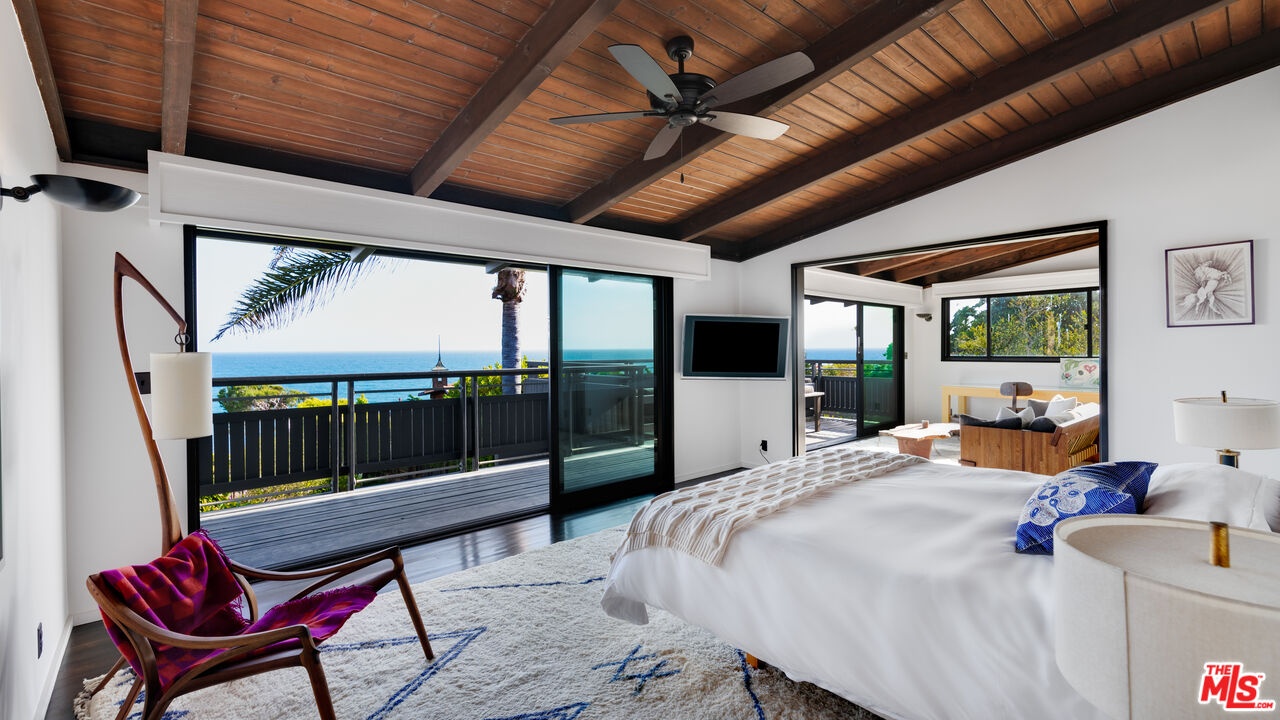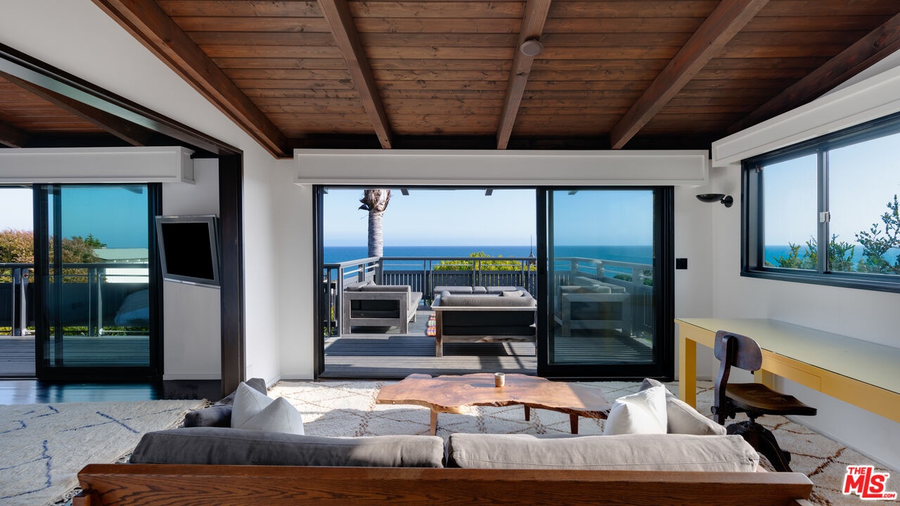 With resort-like atmosphere, landscaping, and amenities, exceptional privacy, and expansive ocean views, this Western Malibu residence is a year-round refuge. The open-plan layout invites easy indoor-outdoor living and entertaining in spacioussurroundings accented by high, beamed ceilings, generous use of glass, andhandsome wood and tile floors.Off the foyer, the home's main living areas feature the kitchen flanked on one side by a step-down family/media room, and on the other by a large living room. The family room, with mountain and ocean views, built-in sound system, and a band of clerestory windows, has a casual dining area and sliding glass doors opening onto the backyard.The ocean-view kitchen is updated with top-quality appliances and ample counter and cabinet space for the most demanding chef. A large butcher-block island has bar seating and design accents include stone countertops, floating cabinets, and jade-green tile. A butler's pantry provides an additional sink and storage space. The kitchen extends to include a dining area that opens directly onto a covered deck where there is a table for al fresco dining.The very comfortable living room has ocean views, a fireplace, and walls of glass on two sides with doors opening to the back and side yards. Off the foyer is an additional entertaining area complete with a wet bar. A gym, a powder room, and a laundry room complete the main level.A nearby stairway leads to a spacious sleeping loft with a wood plank-and-beam ceiling, and a second stairway leads to three additional bedrooms, including dual primary suites with ocean views, sliding glass doors to a wraparound, full-width view deck, luxurious closets, and large tiled bathrooms.The backyard has abundant options for lounging, dining, and entertaining, including a covered deck with a dining table and lounging area, a fire feature, an ocean-view pool and spa, a wet bar, a hot tub, a half-bathroom, and a barrel sauna and tub. There is also a coded-access flagstone and wood stairway leading to the beach. The home is equipped with multi-zone air conditioning, security system, and a two-car garage, plus lovely, comfortable furnishings and impressive contemporary artwork.