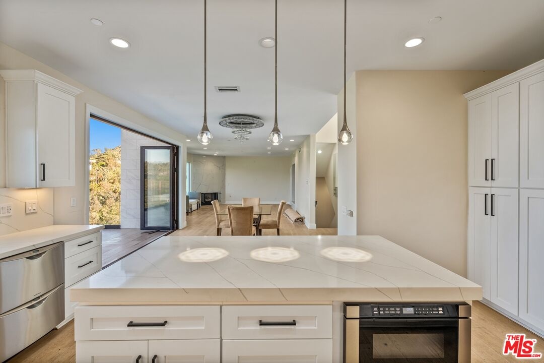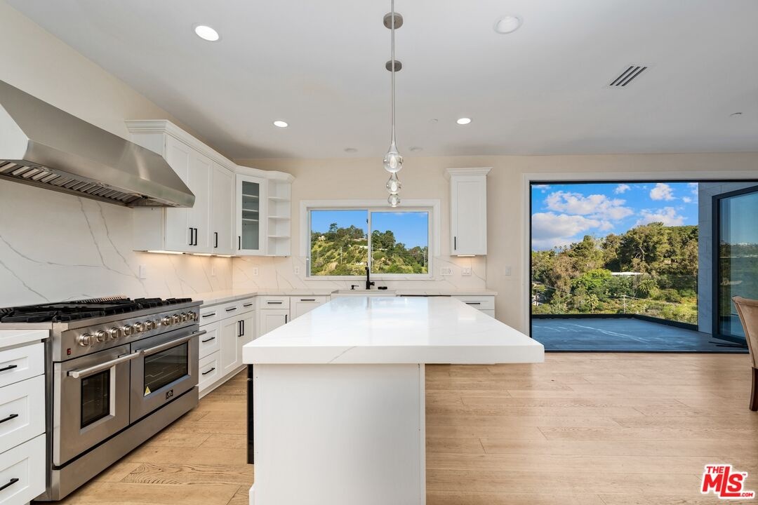 Hidden along a private road off Woodrow Wilson Drive near Mulholland, this Hollywood Hills home for sale offers exceptional privacy, scale, and sweeping canyon and hillside views. Spanning nearly 5,000 square feet, this five-bedroom Hollywood Hills residence combines architectural volume with a flexible layout designed for both entertaining and comfortable everyday living. Inside, soaring ceilings and wide-plank oak floors create a warm, contemporary atmosphere. The chef's kitchen features stone countertops, custom cabinetry, wine refrigeration, and generous prep space, ideal for both casual dining and hosting. A versatile split-level loft provides additional living flexibility and can function as a home office, creative studio, media room, gym, or guest suite, complete with its own kitchen and bath. Spa-inspired bathrooms, integrated smart home systems, surround sound, and security features enhance convenience and comfort throughout the home. Located within the highly desirable Carpenter Community Charter School District, this Hollywood Hills property near West Hollywood is just minutes from major film and television studios, Sunset Strip dining and nightlife, and offers convenient access to both the Westside and the San Fernando Valley. Combining privacy, expansive living space, canyon views, and a premier Hollywood Hills location, this hillside retreat presents a rare opportunity in one of Los Angeles' most sought-after residential neighborhoods.