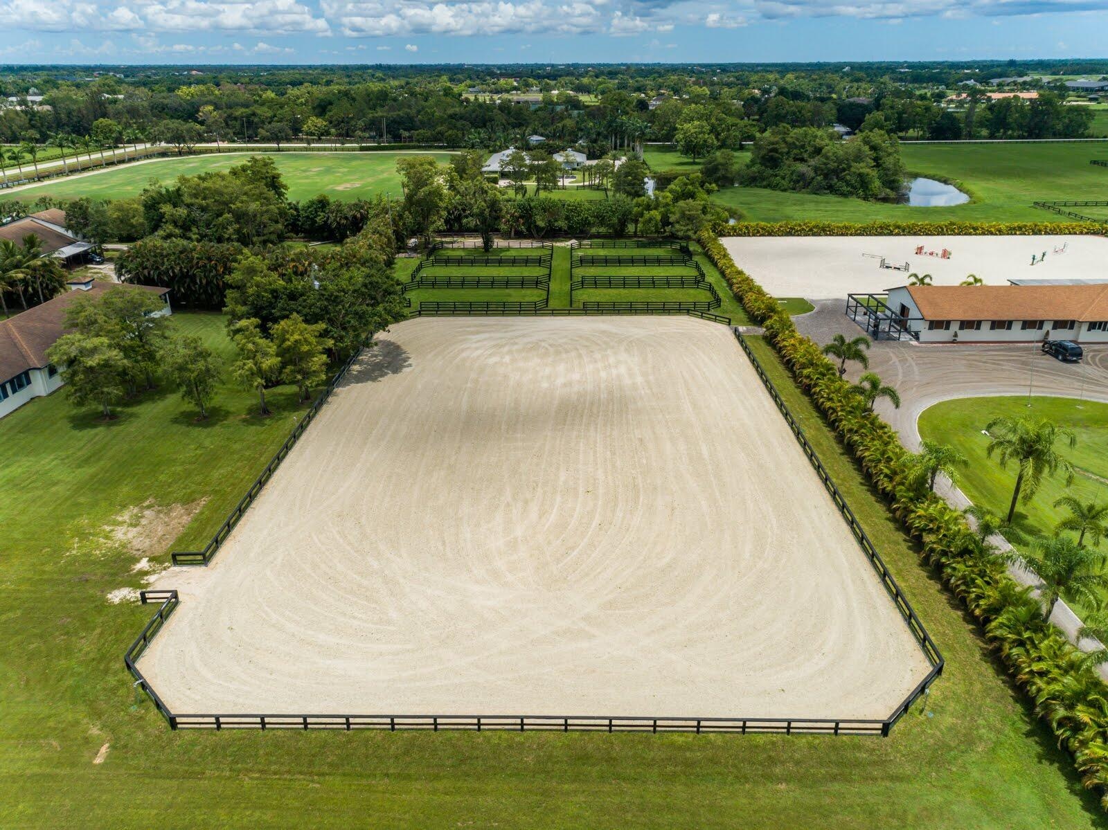Enjoy the best of both worlds on this exceptional 10+-acre equestrian property, ideally located just minutes from Global and WEF while offering the tranquility of Wellington's farm life. This property combines top-tier equestrian amenities with luxurious living, providing everything needed for you and your horses. The 26-stall center-aisle barn is the standout feature of this property, equipped with 6 wash stalls, 2 tack rooms, a feed room, and a lounge. A separate building offers even more versatility, with a second lounge, 2 bathrooms, an oversized laundry room, and 2 spacious 2-bedroom, 1-bathroom apartments. Additionally, a huge storage area provides ample space for hay, shavings, tractors, golf carts, jumps, and farm equipment. Other equestrian facilities include 2 all weather arenas a large grass riding field, a 6-horse covered hotwalker, and 15 paddocks, all designed to support training, turn-out, and leisure riding. The property features two beautiful homes. The original 4-bedroom, 3-bathroom single-story home has been recently remodeled throughout, offering wood and tile floors, a beautiful kitchen with all new appliances, and a screened-in patio with a heated pool and jacuzzi for relaxing. The second residence is a newly constructed 2-story, 4-bedroom, 3-bathroom home with modern finishes, ideal for a property manager or staff. Privacy and convenience are essential, with 1 private entrance for the original home and 2 separate entrances for the barn, allowing easy access. The estate is surrounded by lush landscaping, including a clusia hedge and tropical palms, offering both beauty and privacy. Recent updates include brand-new roofs on all structures, a new water filtration system and newer AC units throughout. This property offers the ideal blend of luxury, functionality, and location, making it the perfect place to live, train, and enjoy the equestrian lifestyle. List of improvements with current owner -Replaced ALL the roofs on all structures (barn, house, storage building) -Added an oversized arena approximately 150' x 250' -Replaced the footing in both arenas (ESI) -Added a 6 horse hotwalker -Added an additional 8 stalls and refaced all stalls -Added one additional tackroom and 2 additional wash stalls -Added paddocks (total of 15) -Replaced the AC units and Hot water heaters -Added an additional septic system -Added a new well -Replaced the water system servicing the house and barn -Completely updated/remodeled the original house -Built a brand new two story 4 bedroom 3 bath house -Updated the 2 staff apartments both 2 bedroom 1 bath -Added a laundry room for the barn -Added a second lounge with a full bathroom -Added a 3rd automatic gate off 57th Place -Replaced the pool heater, screening around the pool and leveled the pavers -Added a Clusia hedge along the front and side of the property for additional privacy -Added a coved viewing deck along the larger arena