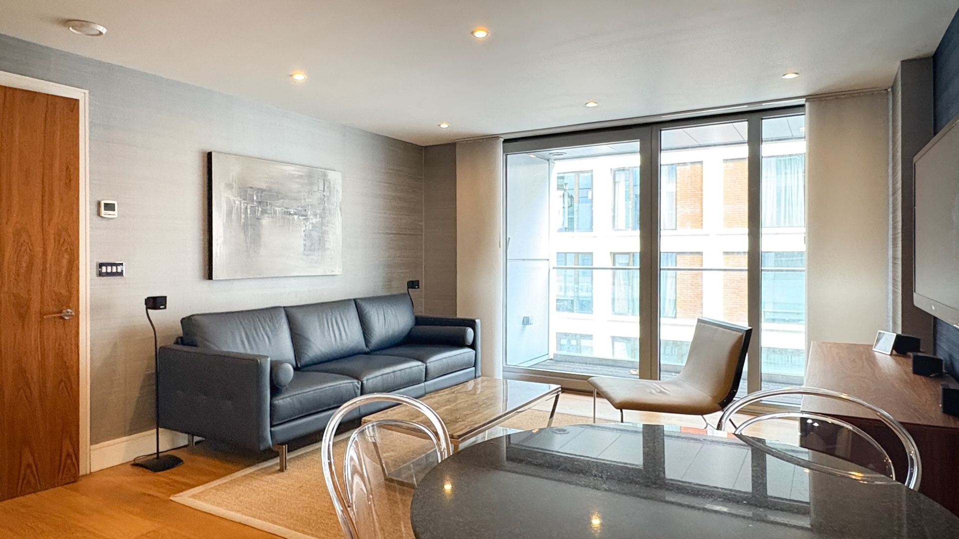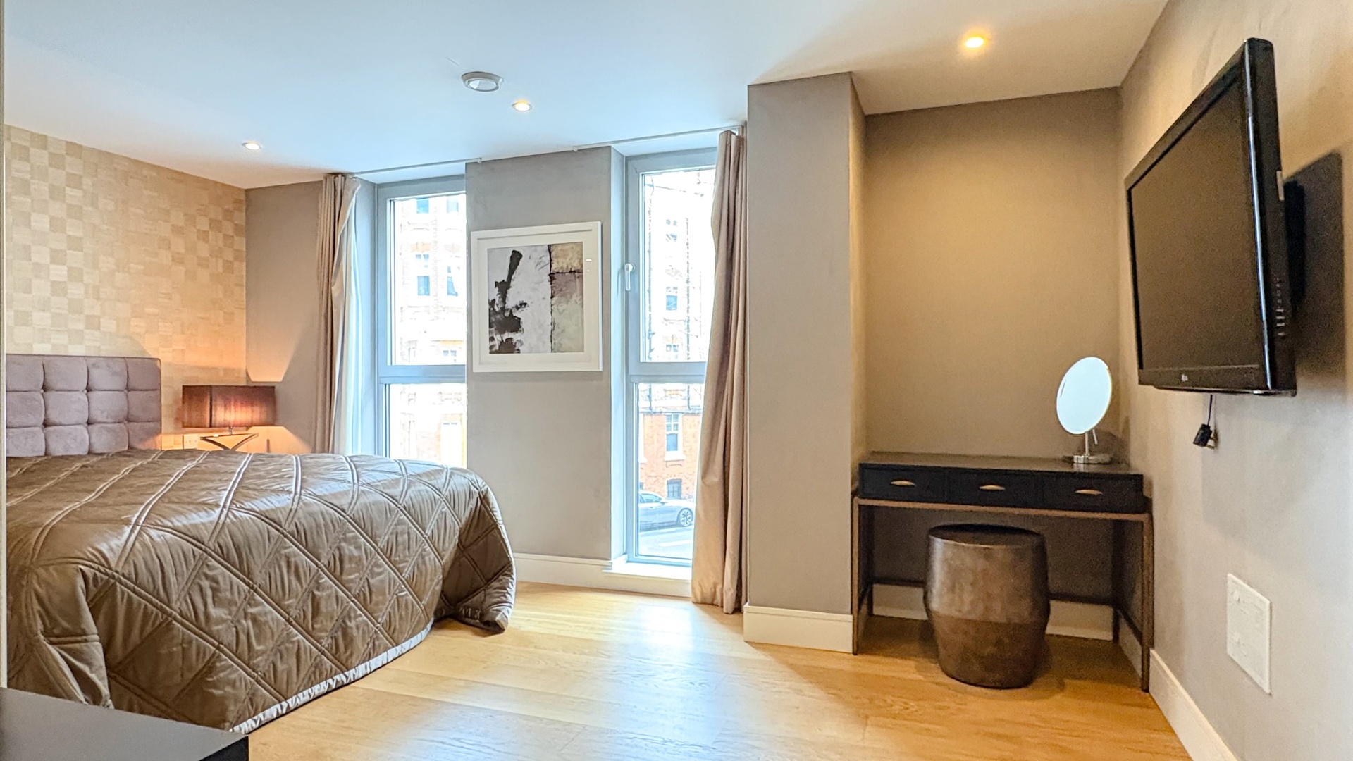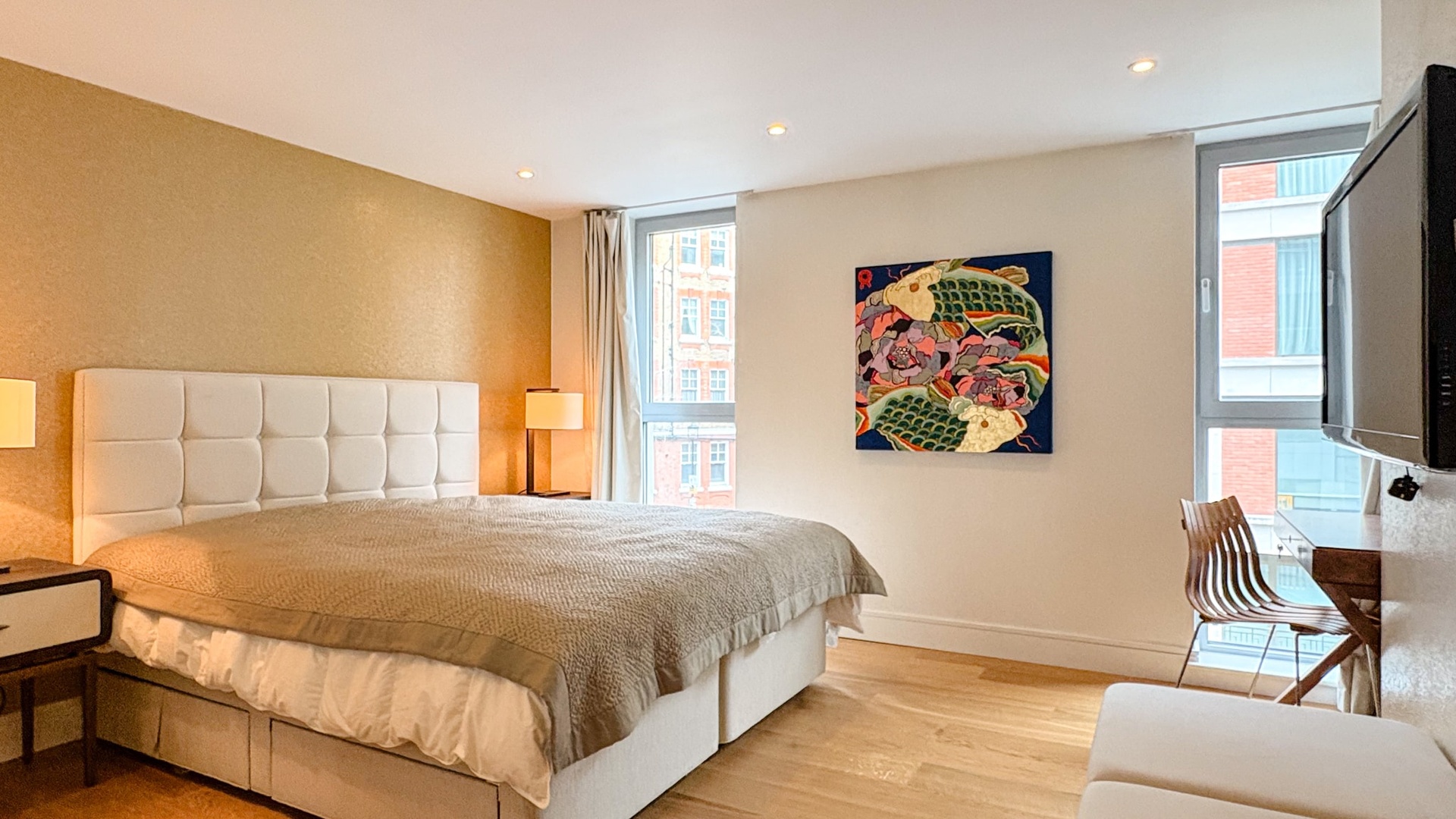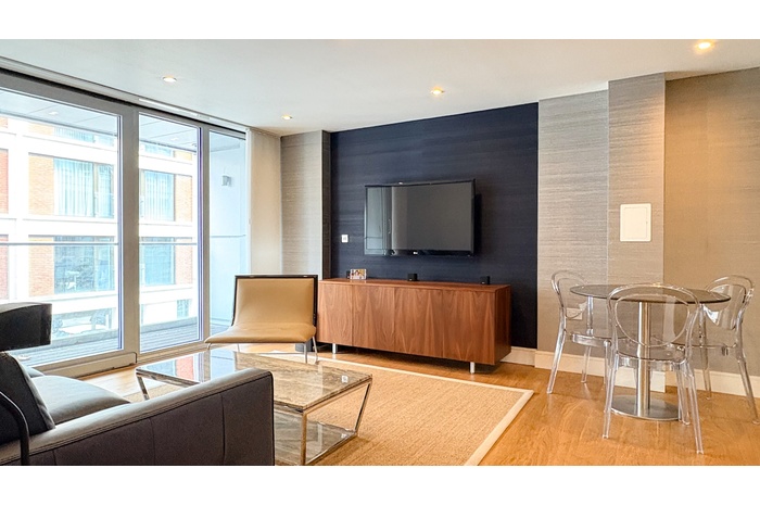 The principal bedroom benefits from bespoke storage and a stylish en-suite bathroom, while the second double bedroom is equally well proportioned and served by a separate luxury family bathroom. Large windows enhance the sense of space and light, creating a calm and refined living environment in the heart of the city.