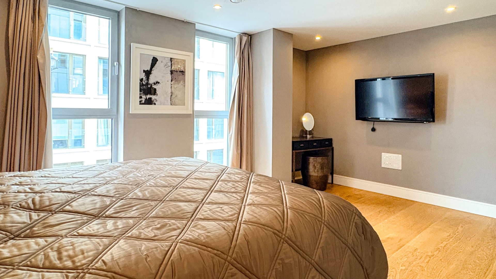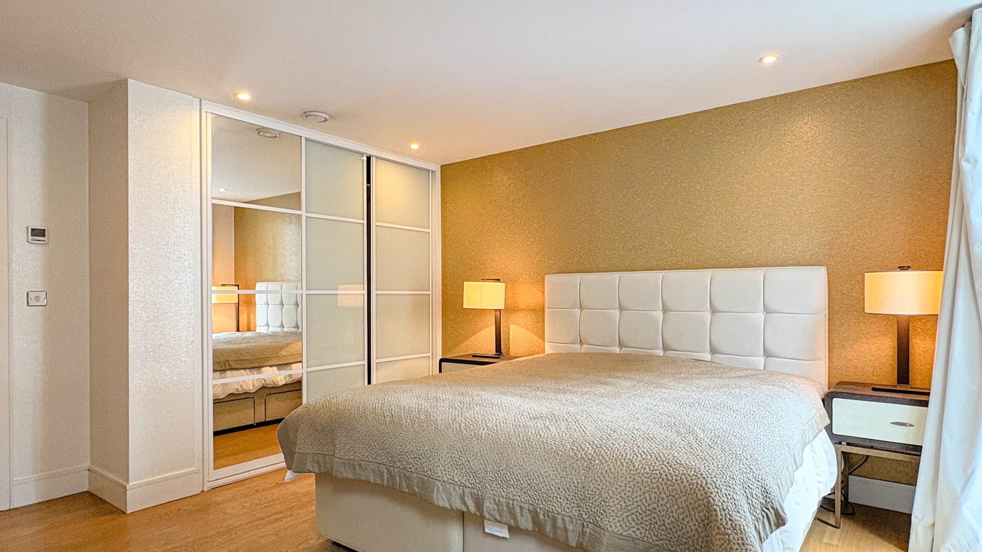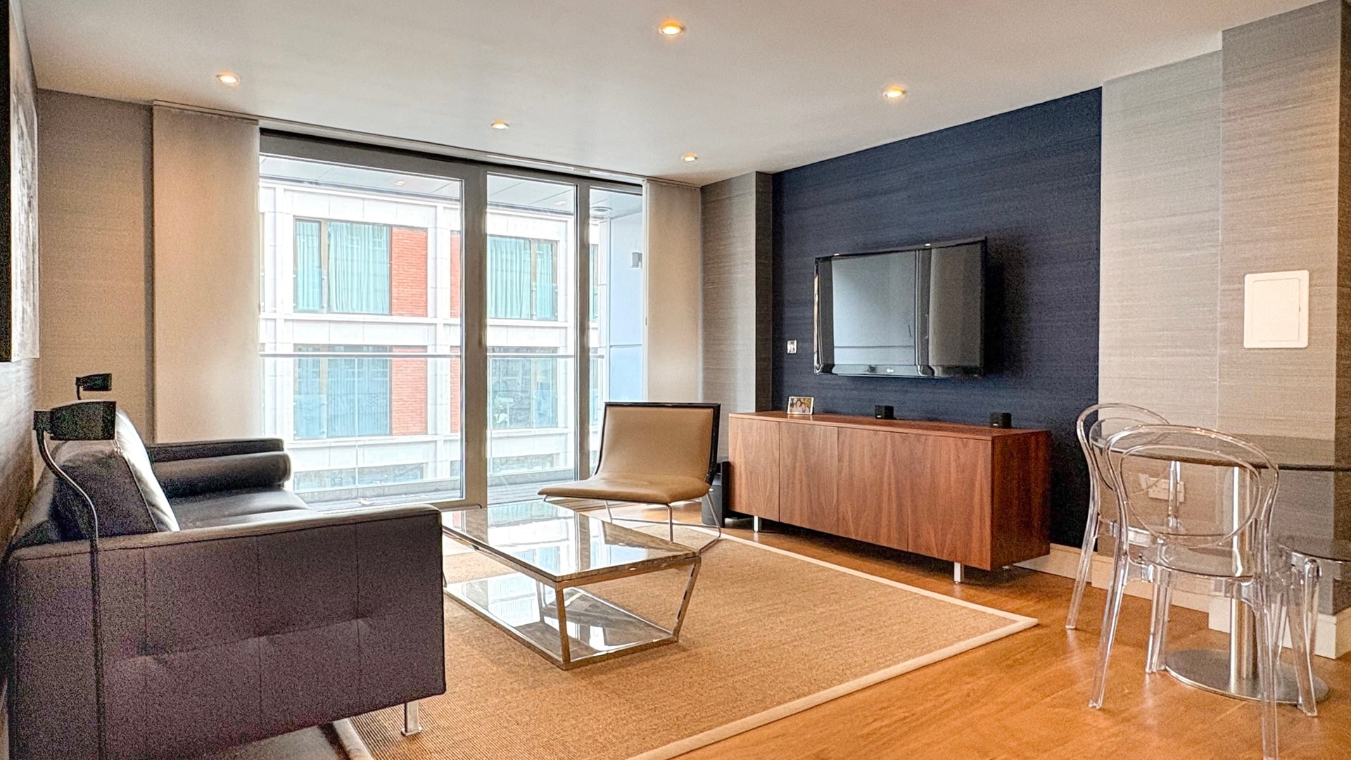 The principal bedroom benefits from bespoke storage and a stylish en-suite bathroom, while the second double bedroom is equally well proportioned and served by a separate luxury family bathroom. Large windows enhance the sense of space and light, creating a calm and refined living environment in the heart of the city.