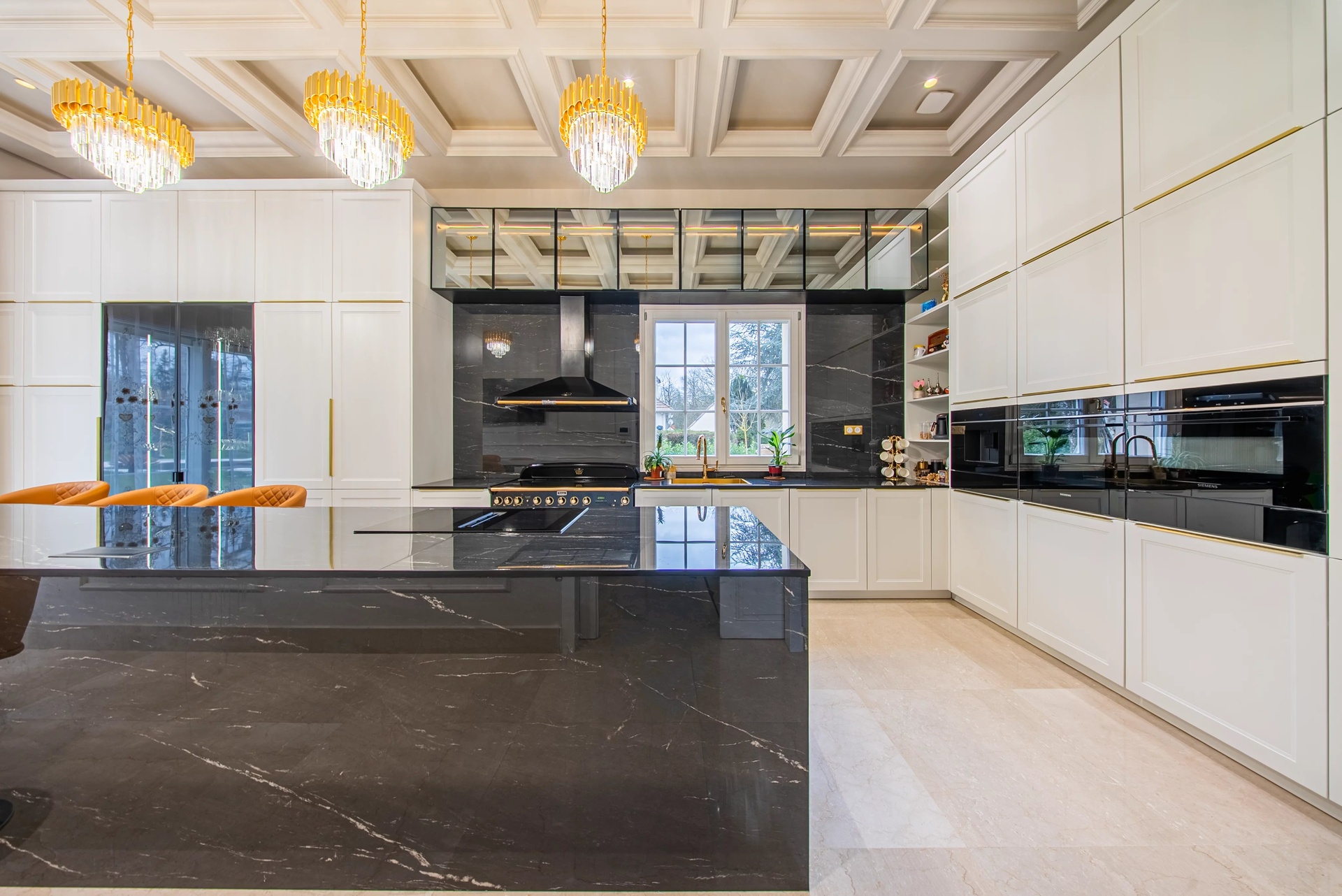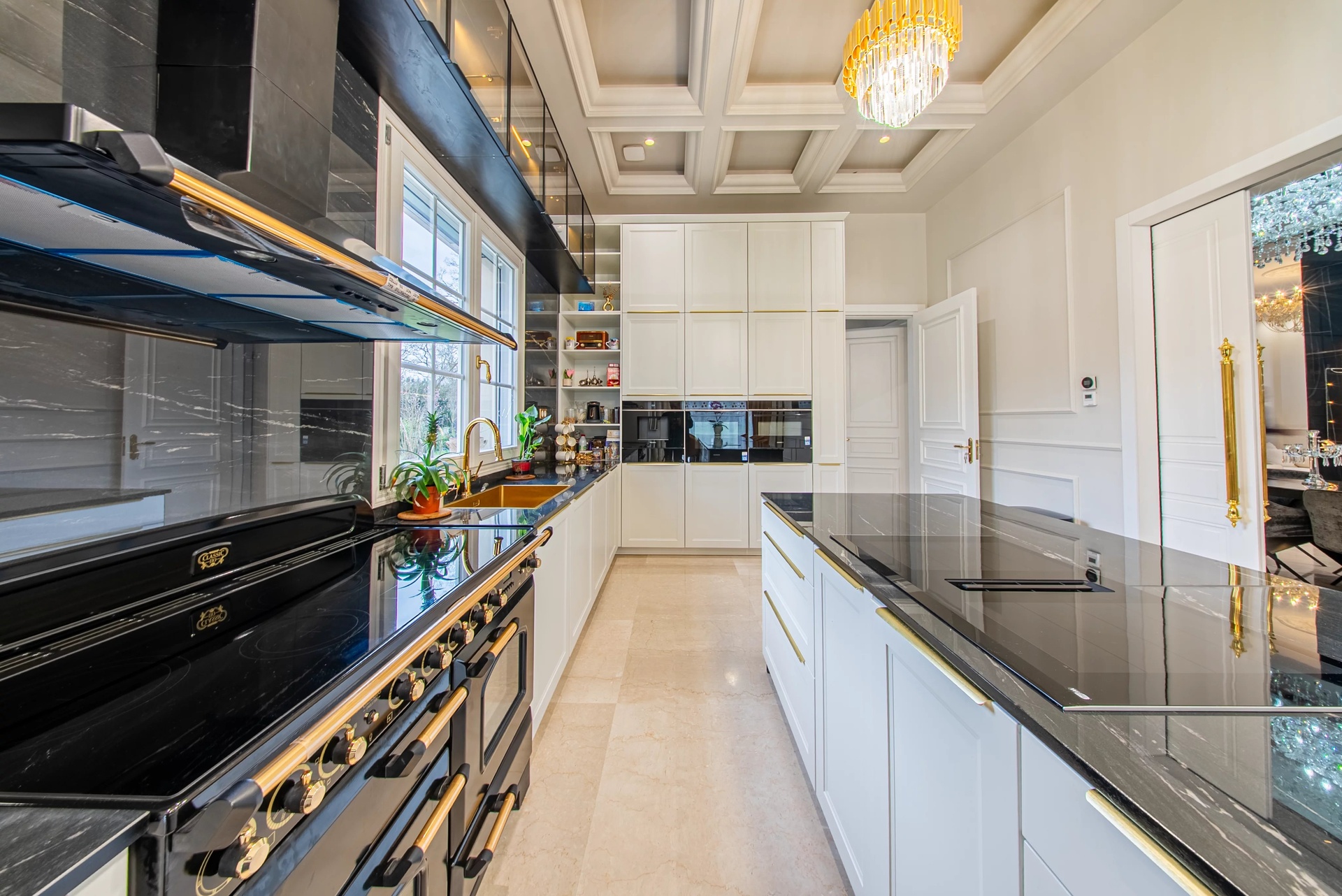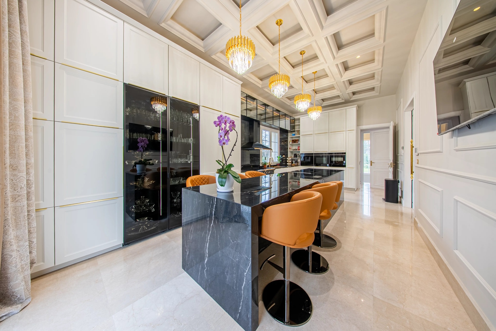 Living Spaces: A large double living room with a contemporary fireplace, a formal dining room, and an exceptional kitchen, all widely open to a turquoise mirror pool and landscaped gardens with Mediterranean species.