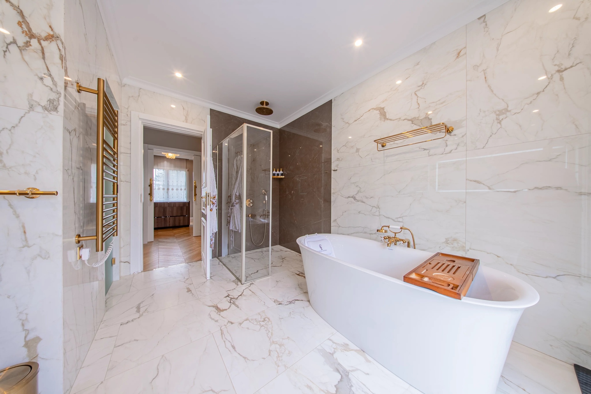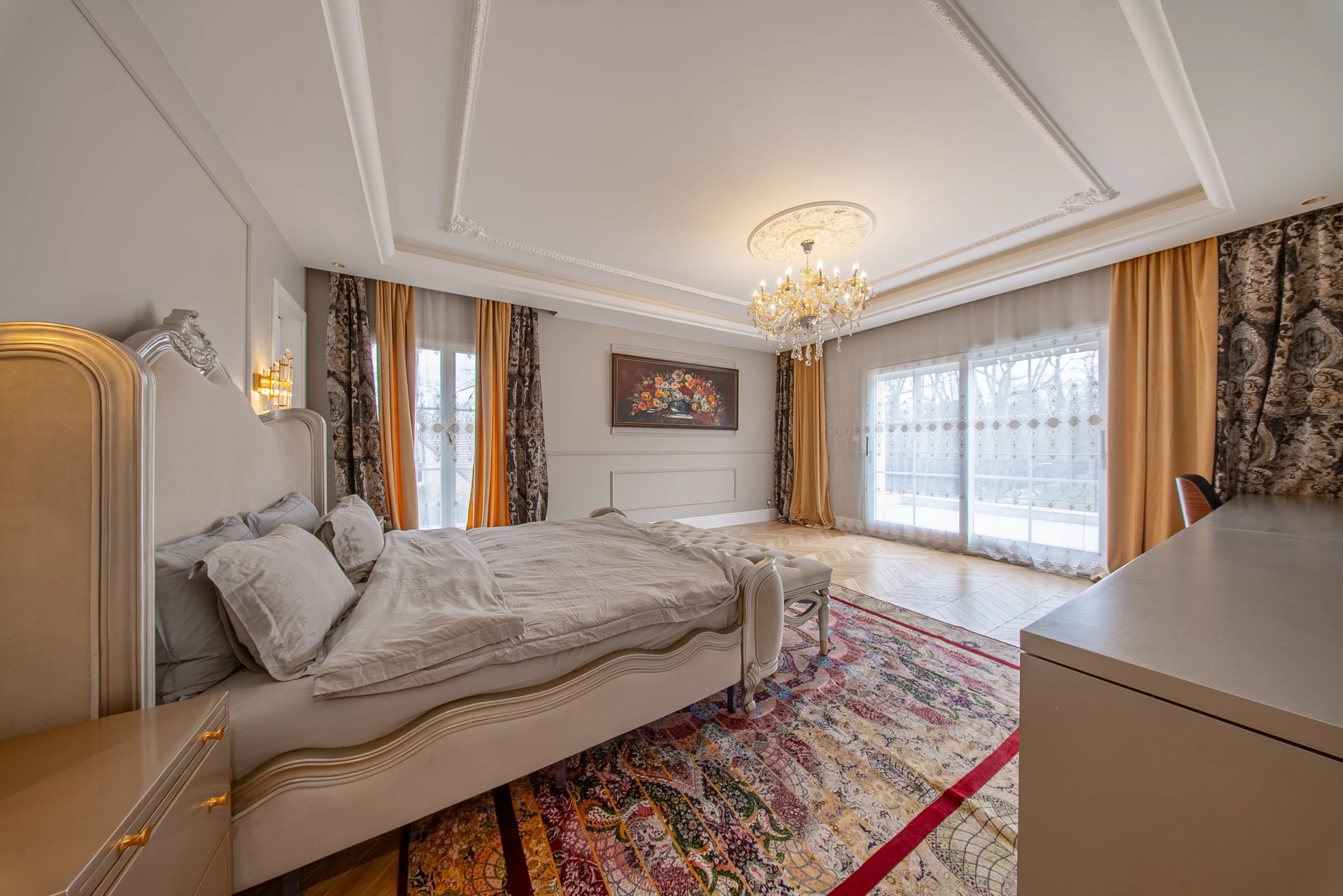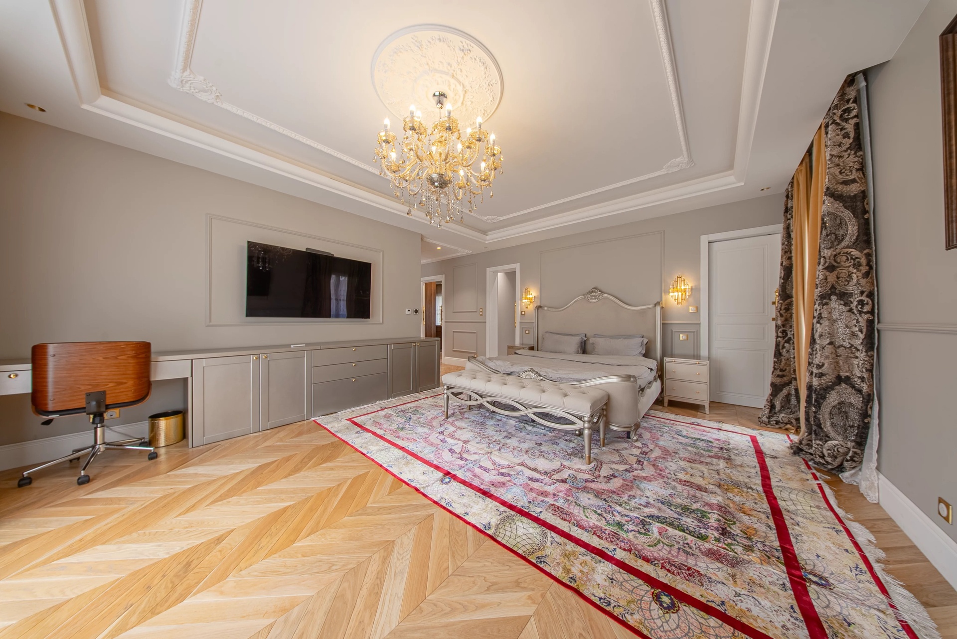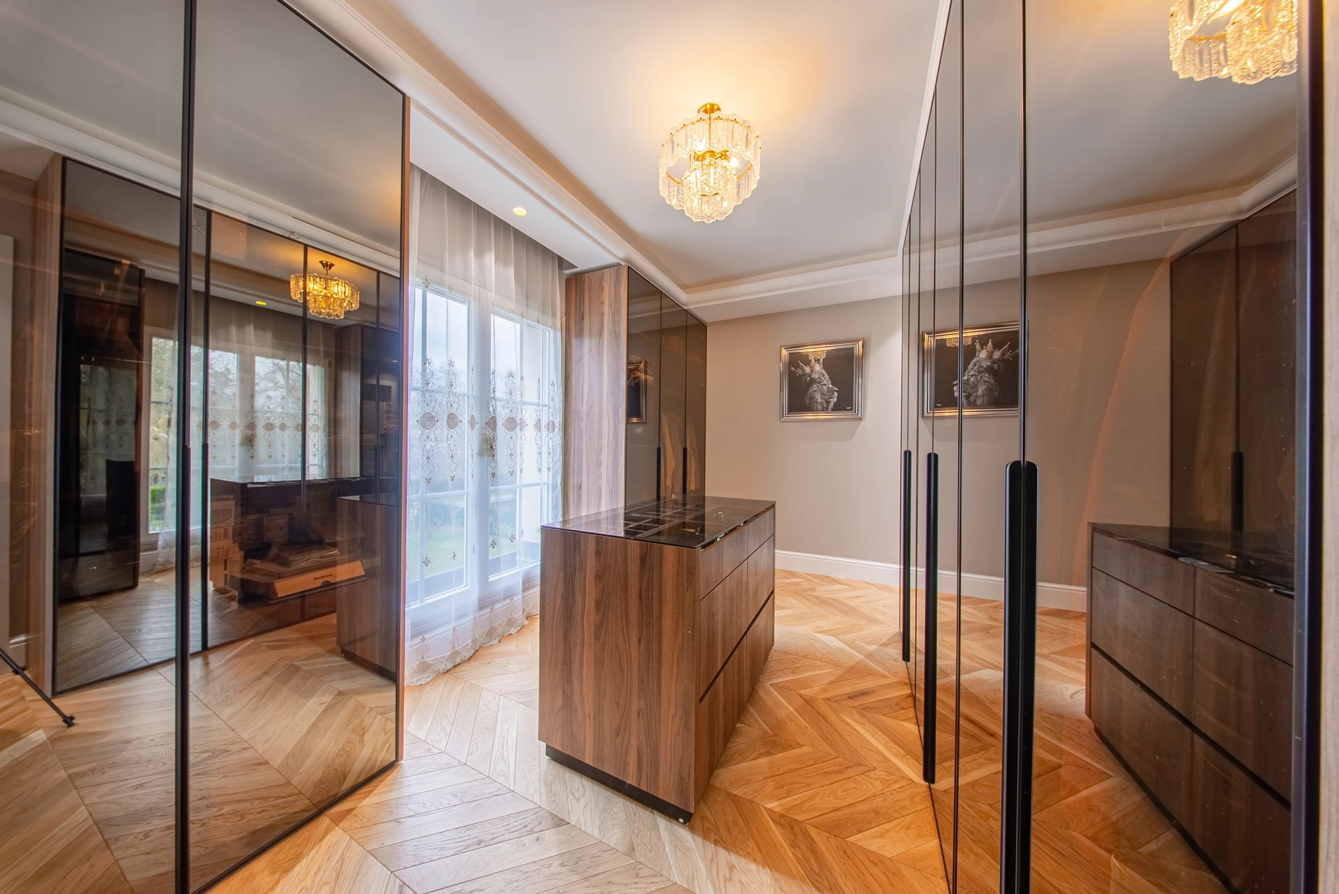 The Master Suite: A true sanctuary, it has a private terrace overlooking the park. It is distinguished by its double dressing rooms (Mr. and Mrs.) with wooden finishes and smoked mirrors, as well as a bathroom of rare finesse.