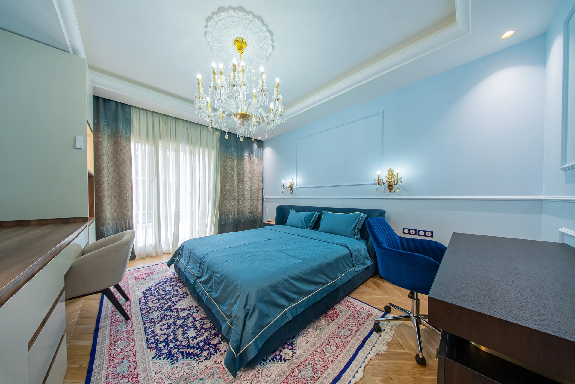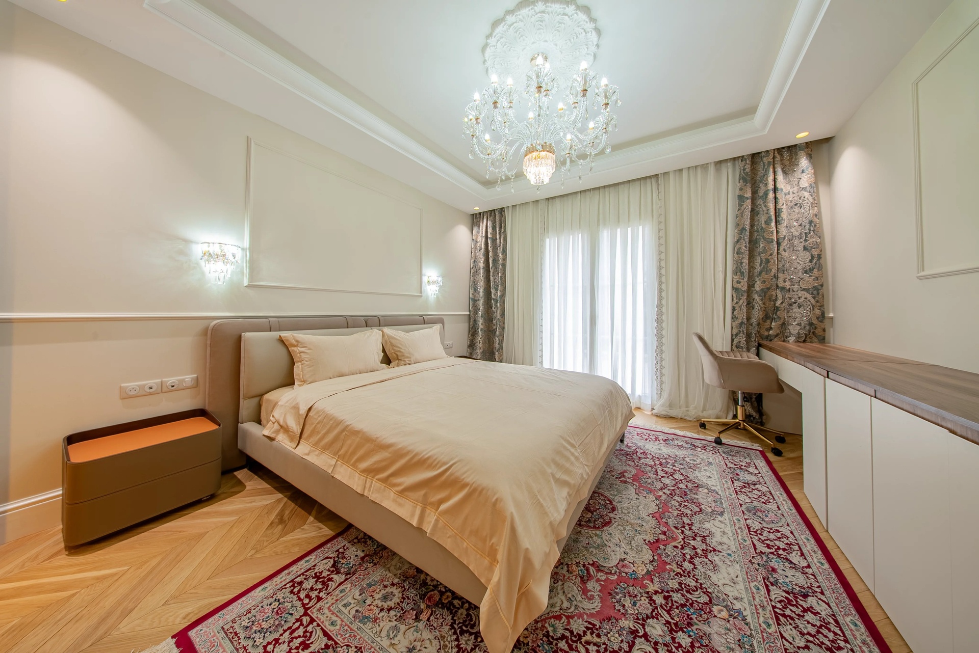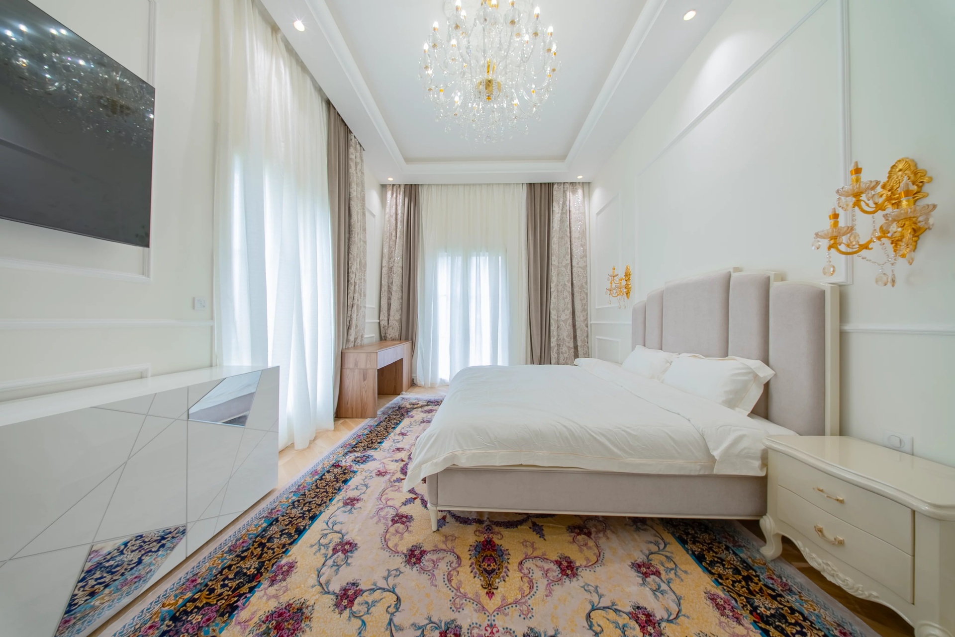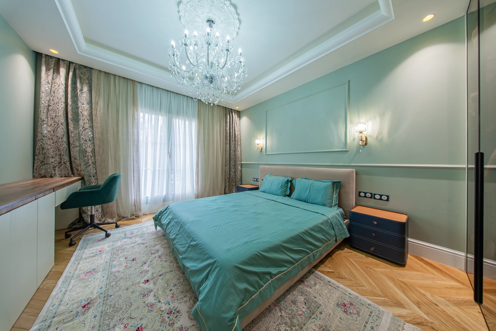The Master Suite: A true sanctuary, it has a private terrace overlooking the park. It is distinguished by its double dressing rooms (Mr. and Mrs.) with wooden finishes and smoked mirrors, as well as a bathroom of rare finesse.