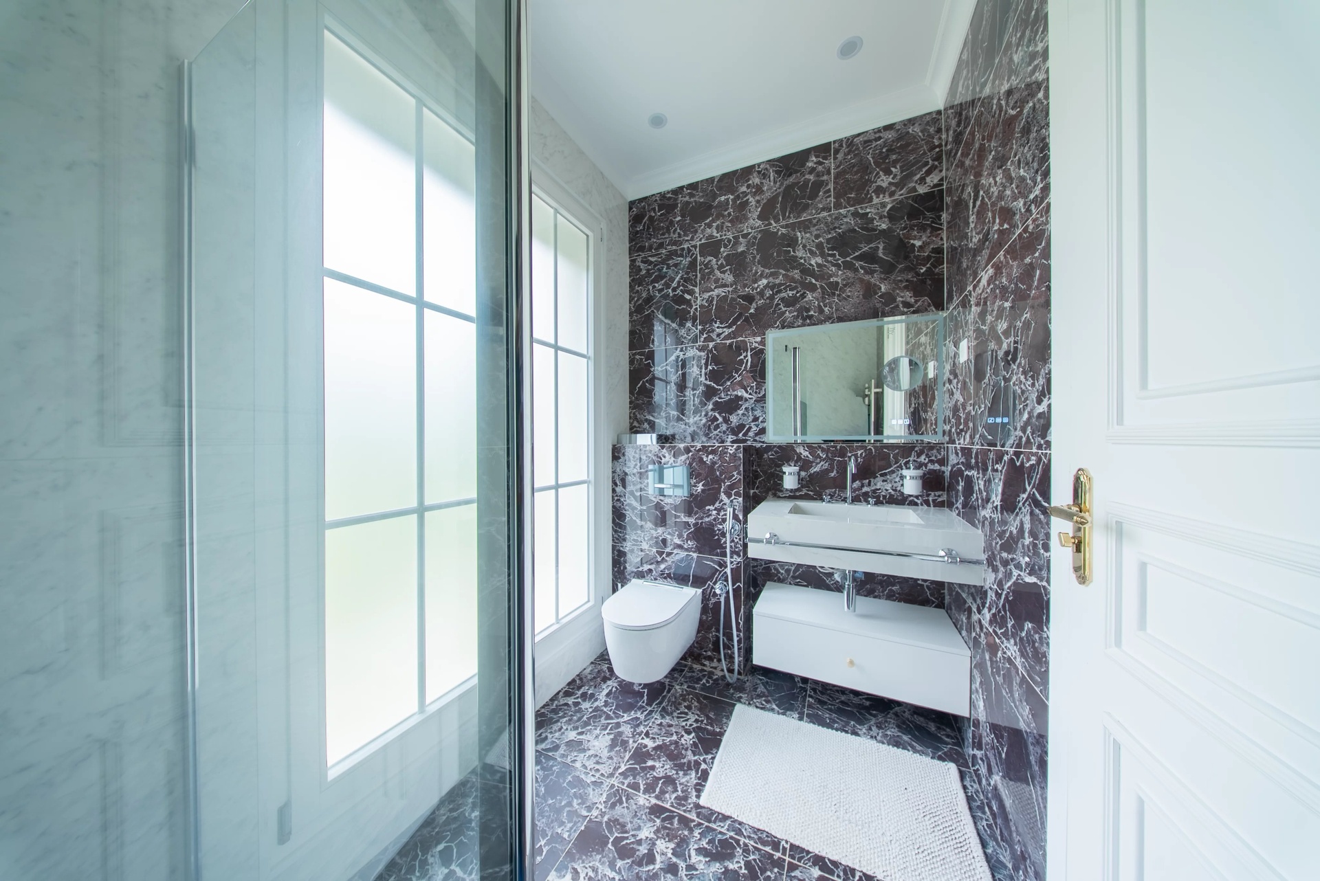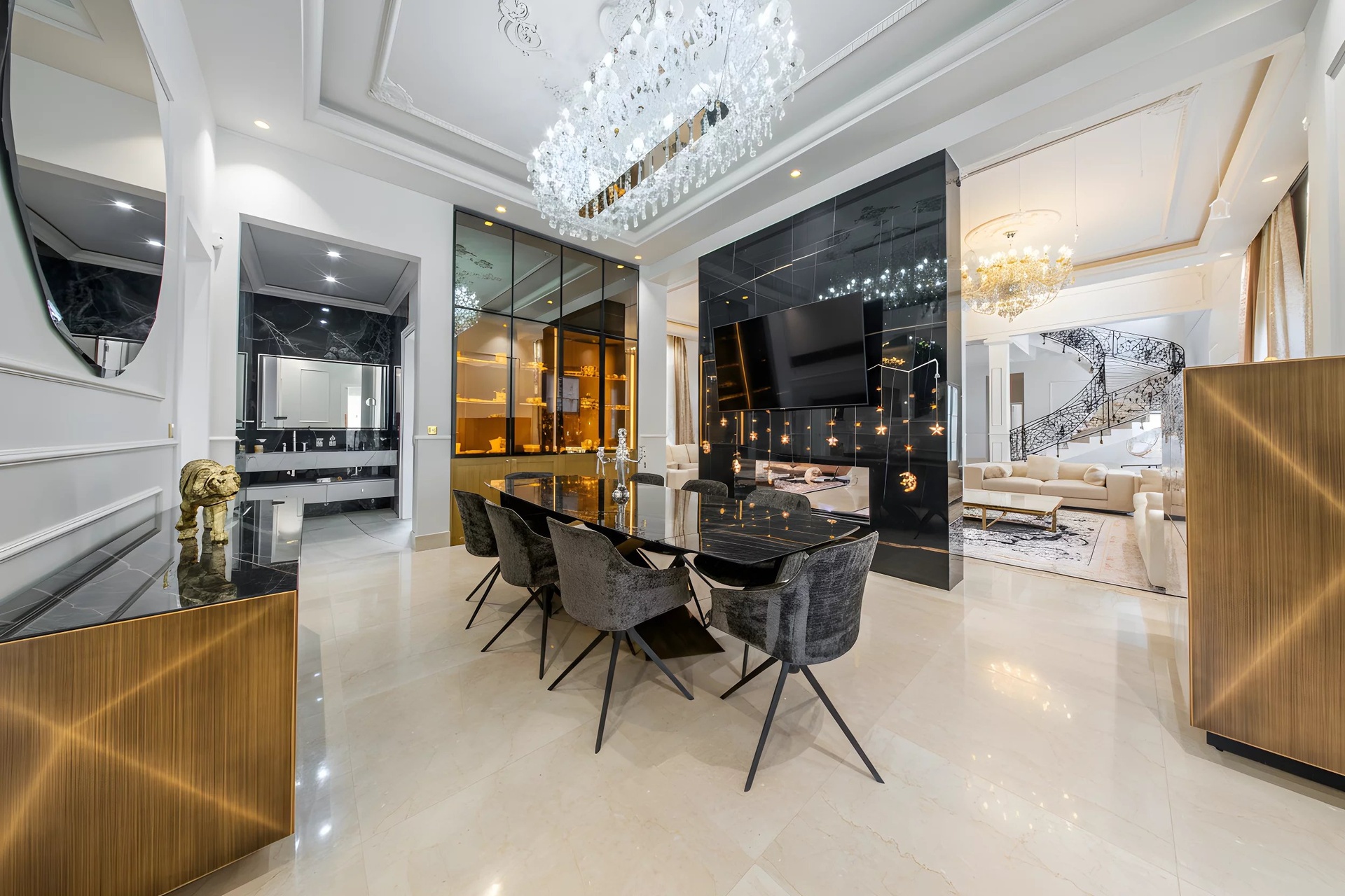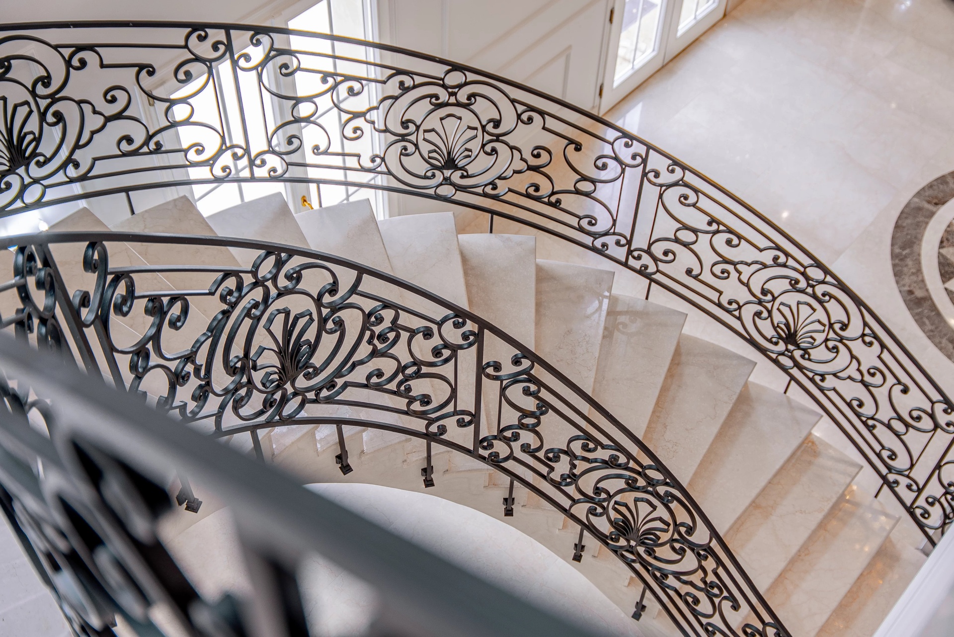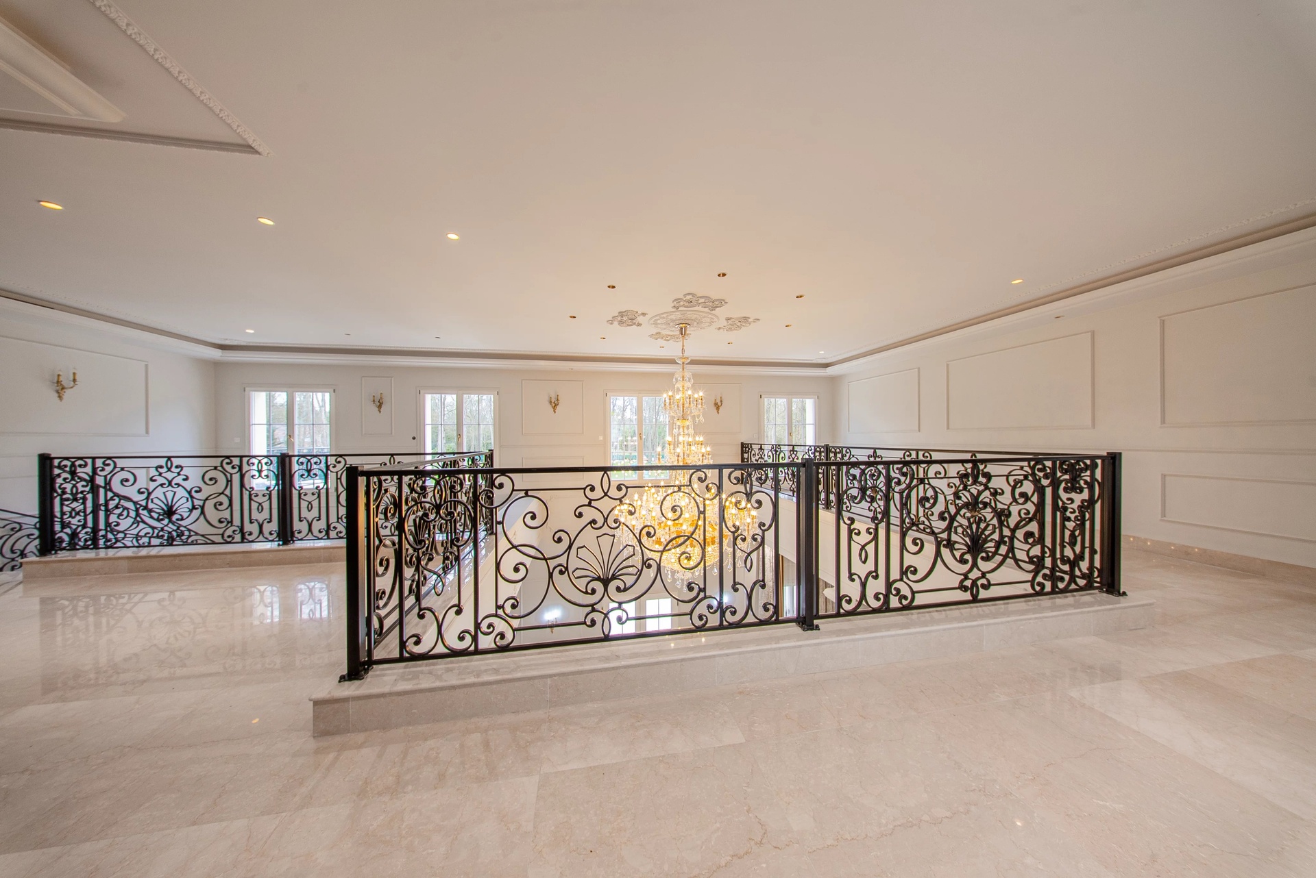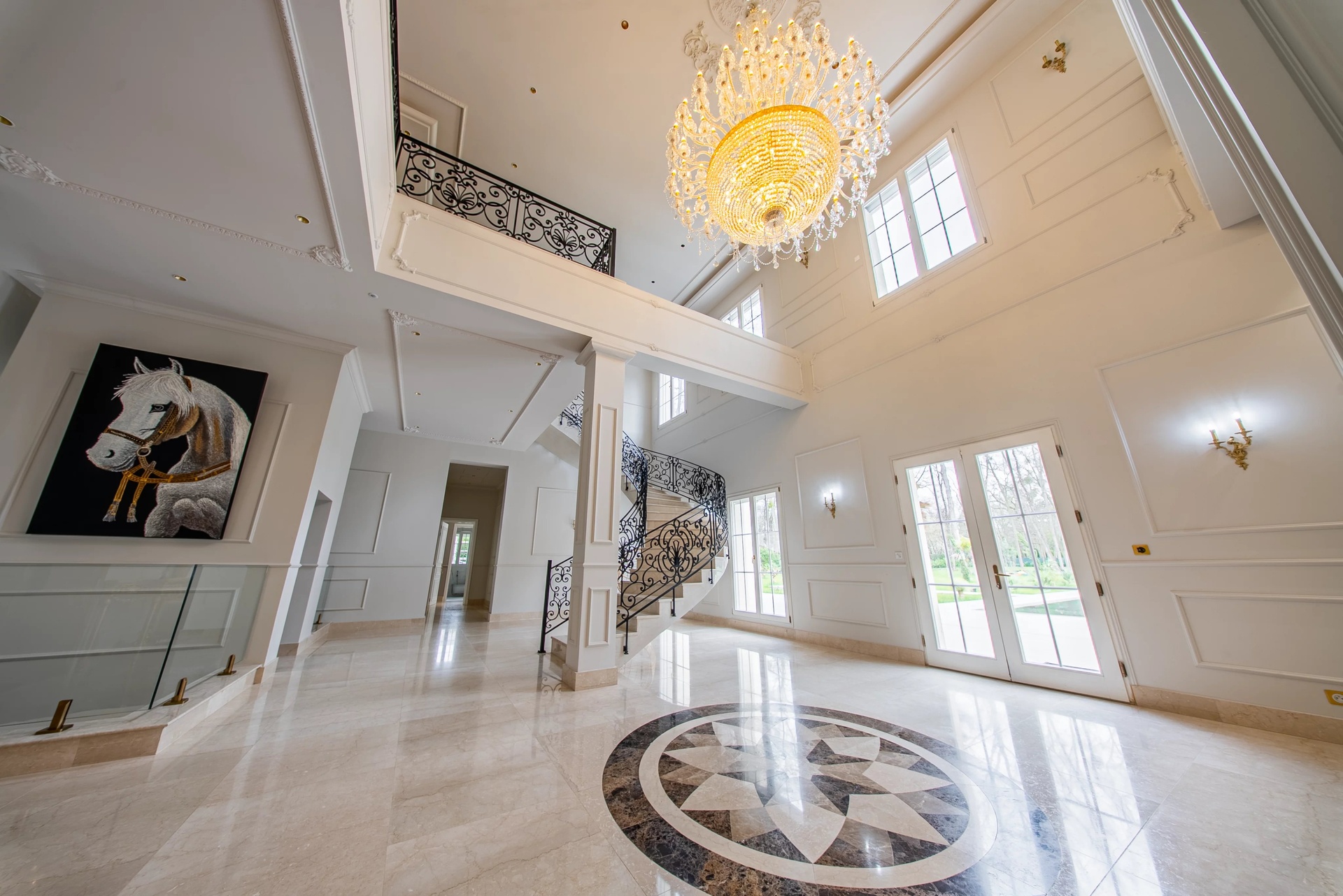 From the entrance, the tone is set: a cathedral hall bathed in light reveals a monumental wrought iron staircase and a marbled patterned floor.