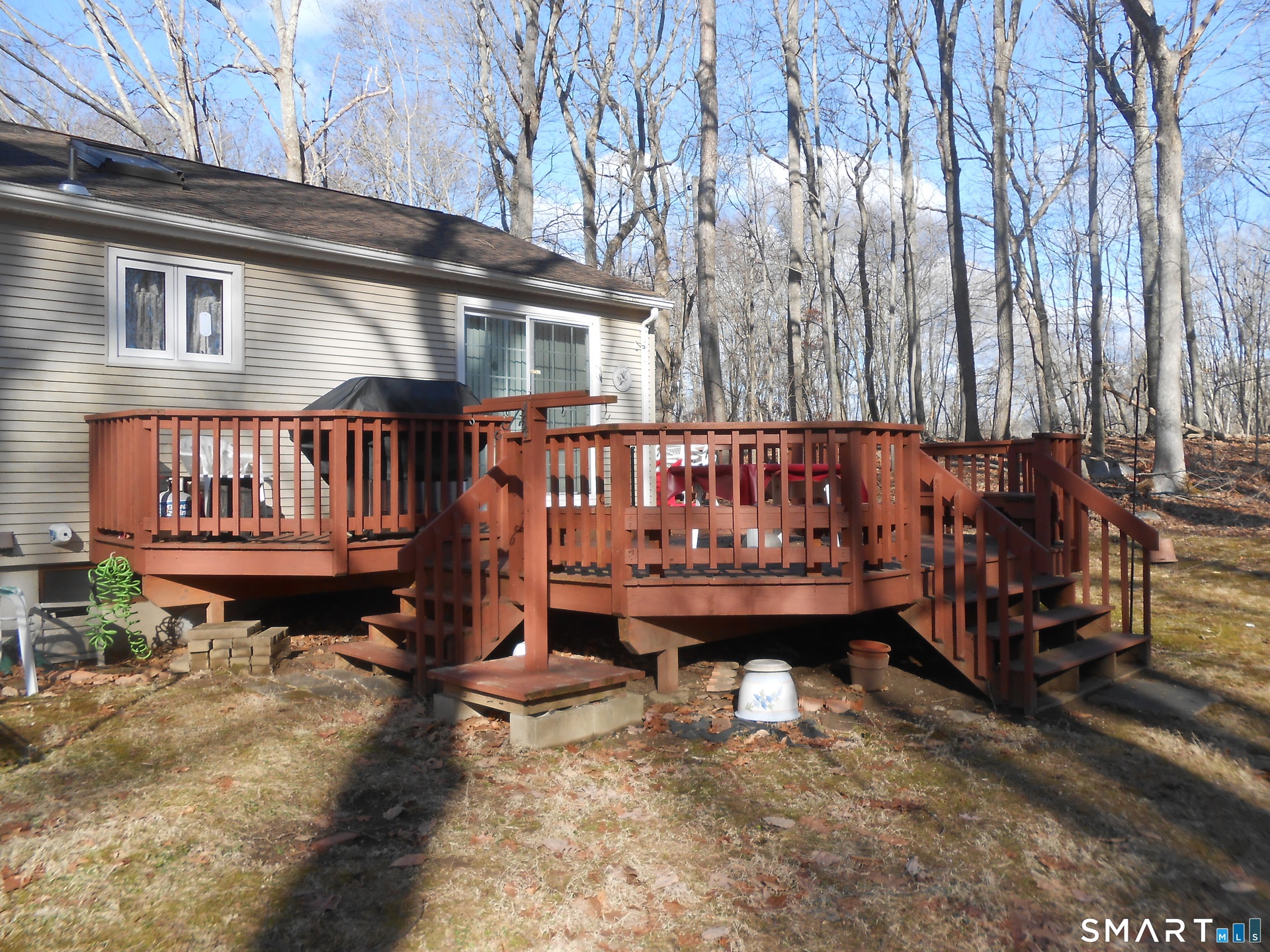 Spacious Split level home with deck, open porch and patio overlooking large, level lot.