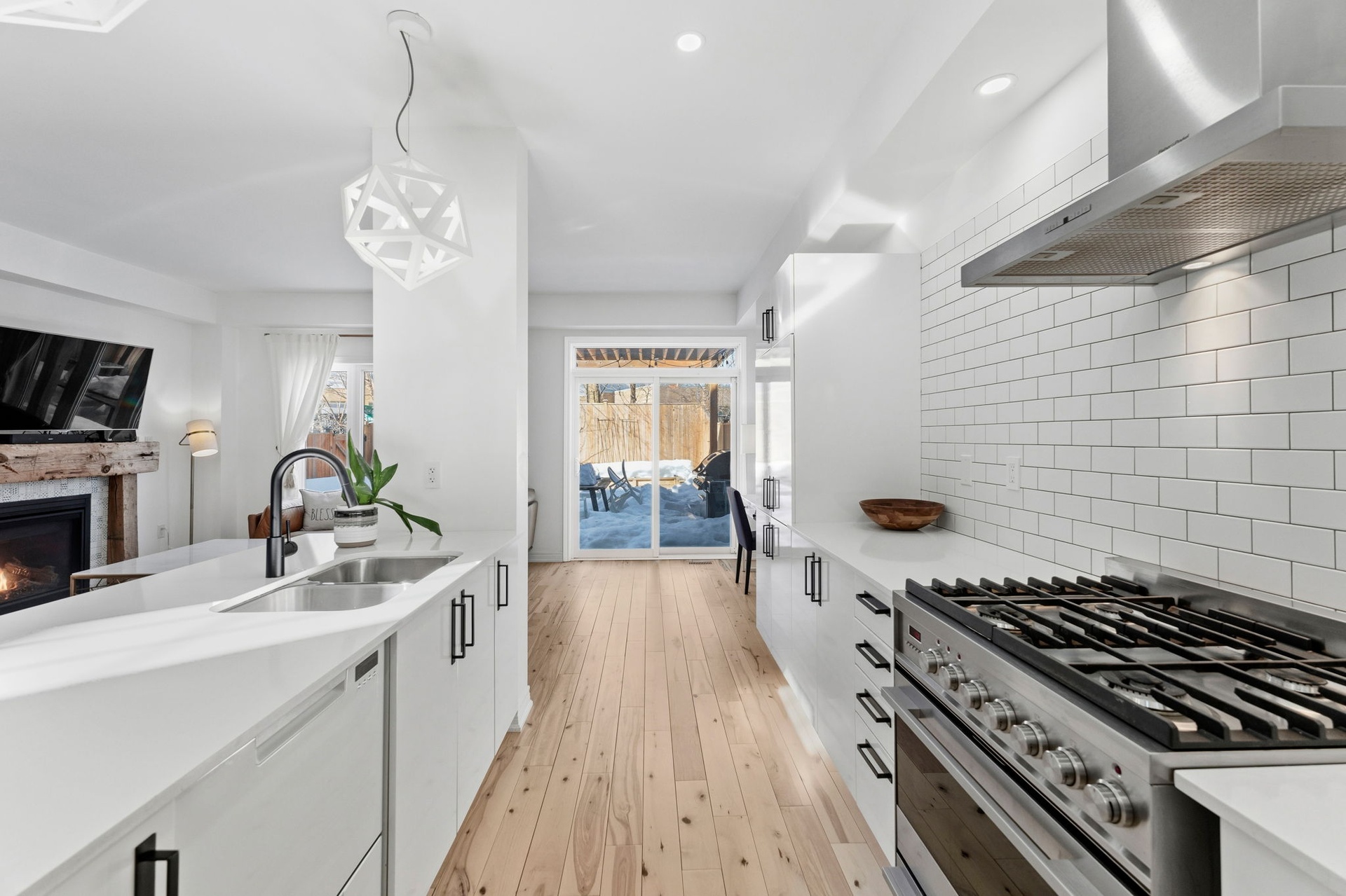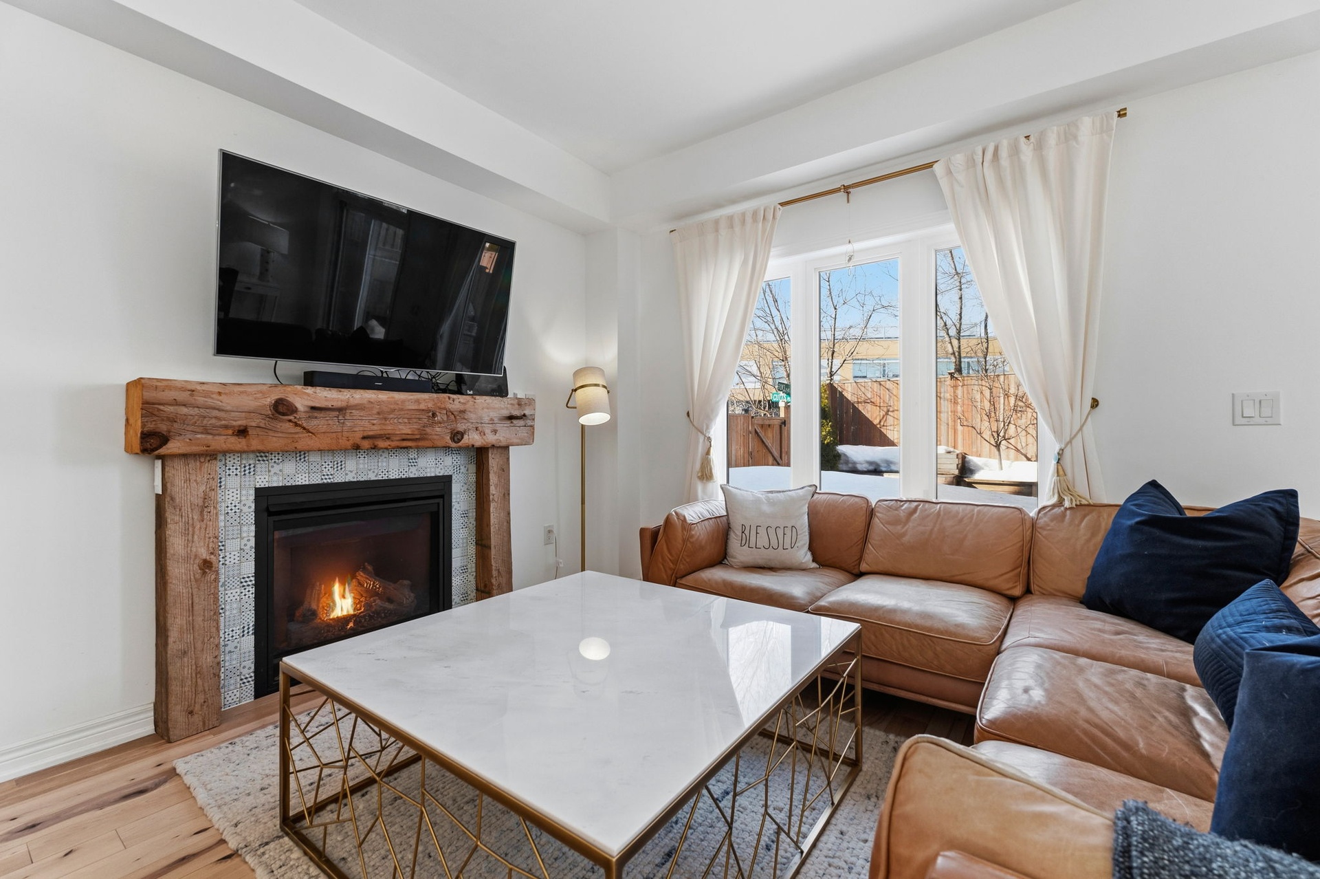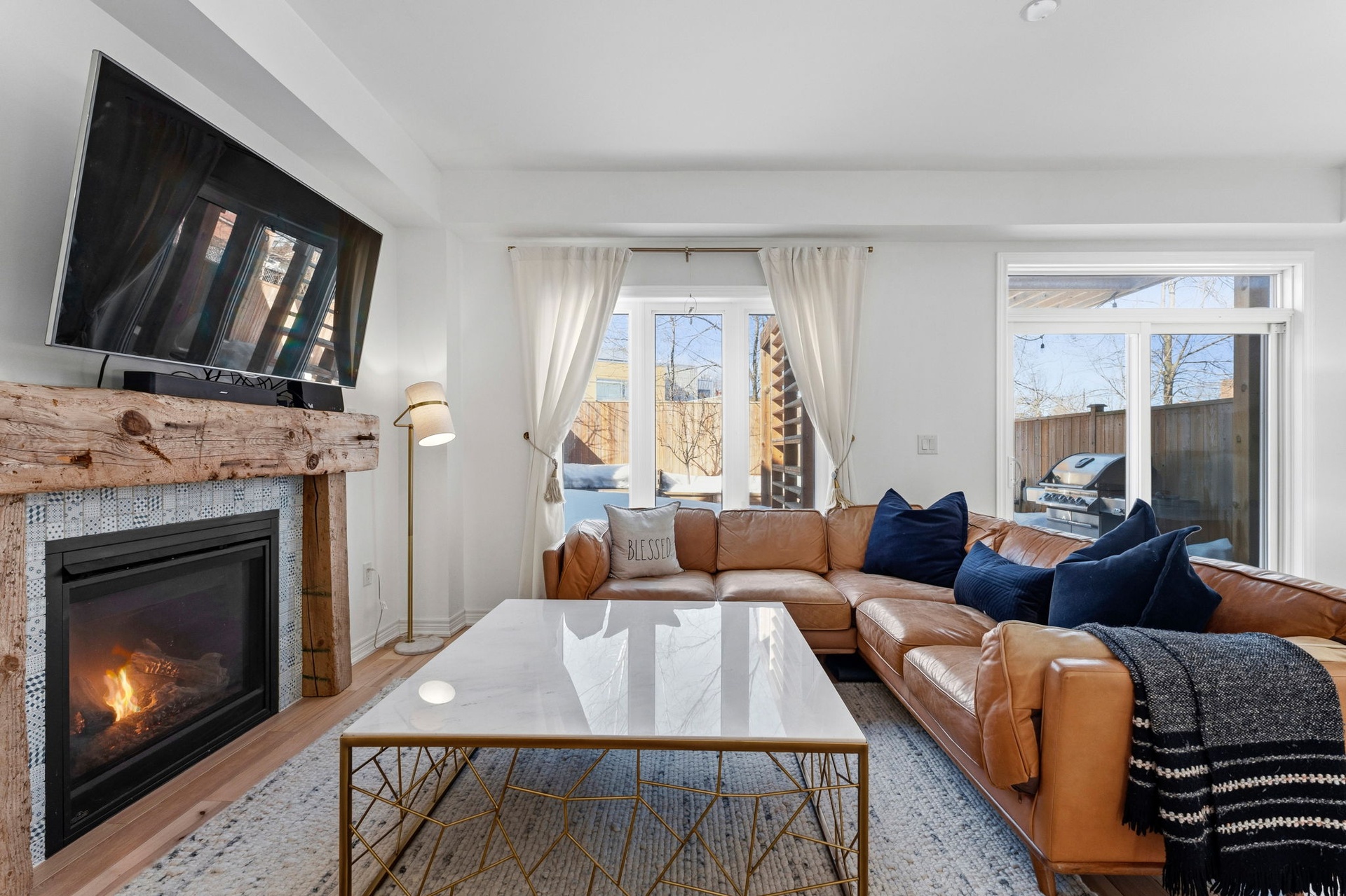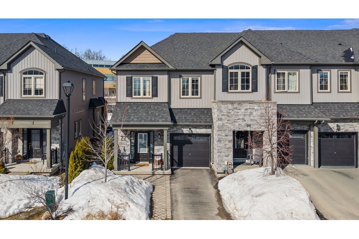 Welcome to this spacious, two-storey, freehold end-unit townhome offering over 2,000 sq ft of total living space in a desirable neighbourhood in Upper North Ward Orillia. The main floor features a bright, functional layout with a welcoming living room, a separate dining area, and an open-concept kitchen with quartz countertops and a breakfast nook overlooking the backyard. Maple hardwood flooring was installed on the main floor in 2021, adding warmth and durability to the main living areas. Interior access to the garage provides everyday practicality. The living room features a Napoleon gas fireplace with wood accent exposure framing that adds character and warmth to the space. Upstairs you will find three generously sized bedrooms, including a spacious primary suite with a walk-in closet and private 4PC ensuite bathroom. The additional bedrooms offer flexibility for family living, guest accommodations, or home office space. For further convenience, there is a second-floor laundry room. The finished basement, completed in 2020 with pine wood finished on the ceiling, gives off a spa-like feeling. This valuable additional living space includes a large custom bathroom with an electrical hookup for a sauna. It features a Napoleon gas fireplace, a custom-built Murphy bed, a storage room and additional storage areas, making it ideal for guests, extended family, or a comfortable recreation area. Outside, the fully fenced backyard features a deck and pergola completed in 2018 and backs onto mature trees and Lions Oval Public School, creating a peaceful and private setting for relaxing or entertaining especially during the summer. This thoughtfully maintained home combines functional living space, practical upgrades, and a private backyard setting perfect for growing families. Finally, the location truly can't be beaten; it's within walking distance of everything you need.