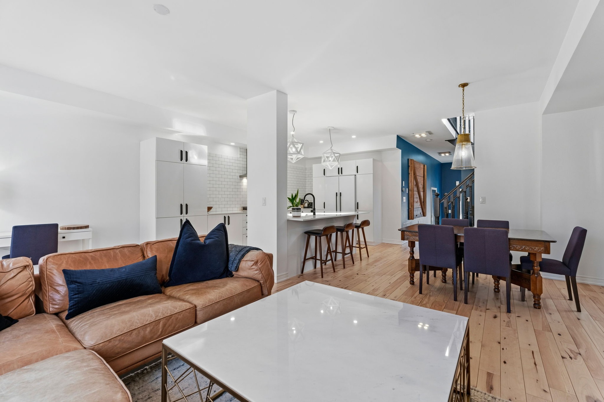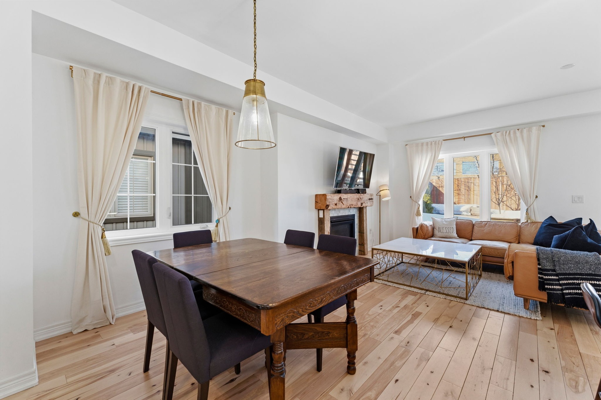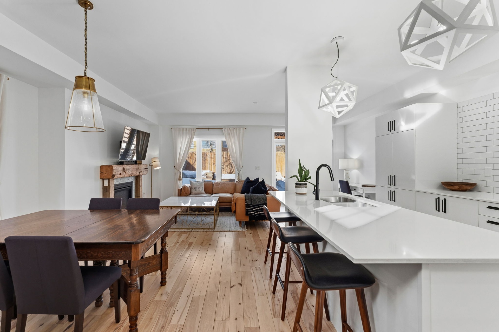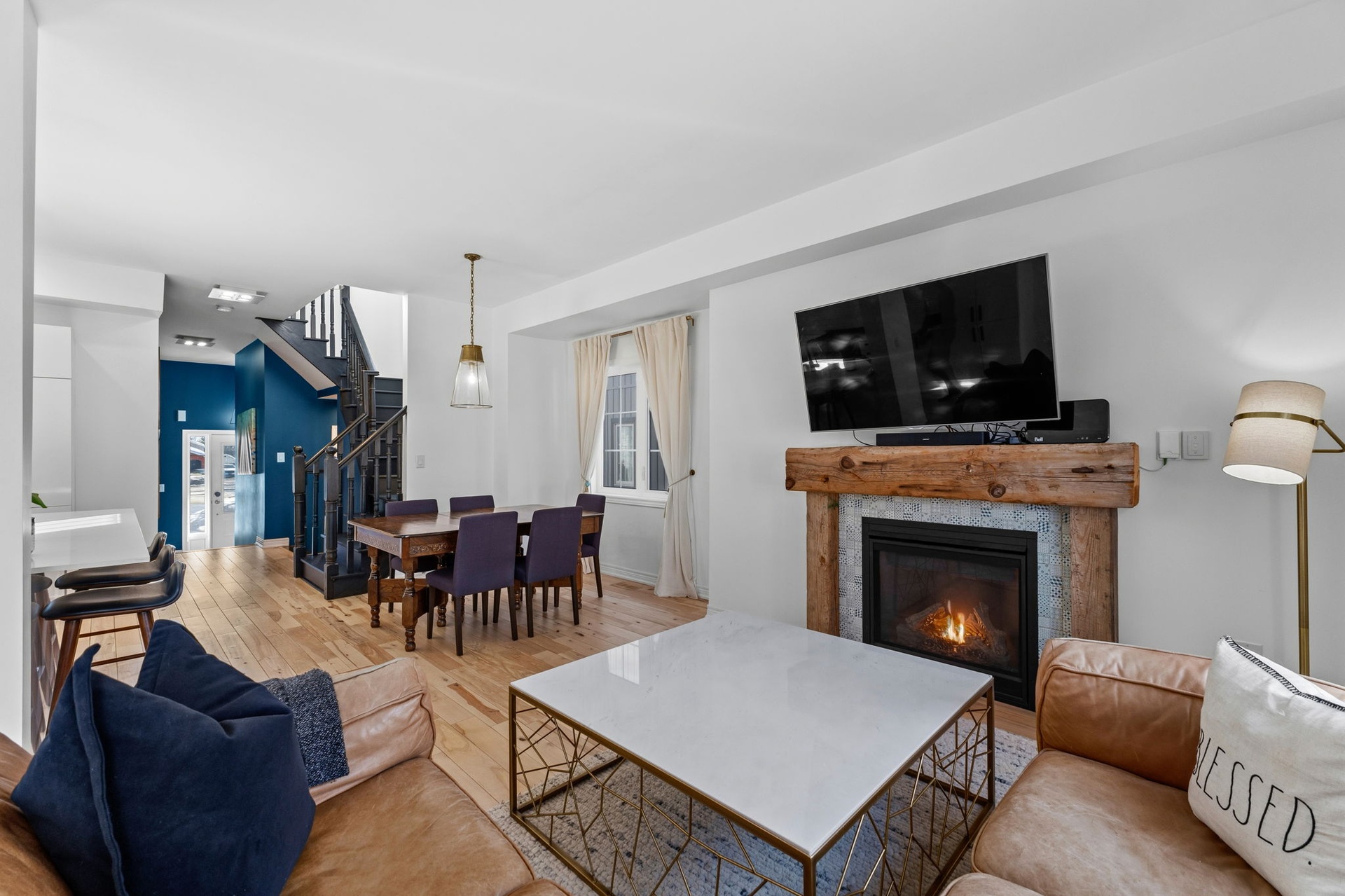 Welcome to this spacious, two-storey, freehold end-unit townhome offering over 2,000 sq ft of total living space in a desirable neighbourhood in Upper North Ward Orillia. The main floor features a bright, functional layout with a welcoming living room, a separate dining area, and an open-concept kitchen with quartz countertops and a breakfast nook overlooking the backyard. Maple hardwood flooring was installed on the main floor in 2021, adding warmth and durability to the main living areas. Interior access to the garage provides everyday practicality. The living room features a Napoleon gas fireplace with wood accent exposure framing that adds character and warmth to the space. Upstairs you will find three generously sized bedrooms, including a spacious primary suite with a walk-in closet and private 4PC ensuite bathroom. The additional bedrooms offer flexibility for family living, guest accommodations, or home office space. For further convenience, there is a second-floor laundry room. The finished basement, completed in 2020 with pine wood finished on the ceiling, gives off a spa-like feeling. This valuable additional living space includes a large custom bathroom with an electrical hookup for a sauna. It features a Napoleon gas fireplace, a custom-built Murphy bed, a storage room and additional storage areas, making it ideal for guests, extended family, or a comfortable recreation area. Outside, the fully fenced backyard features a deck and pergola completed in 2018 and backs onto mature trees and Lions Oval Public School, creating a peaceful and private setting for relaxing or entertaining especially during the summer. This thoughtfully maintained home combines functional living space, practical upgrades, and a private backyard setting perfect for growing families. Finally, the location truly can't be beaten; it's within walking distance of everything you need.